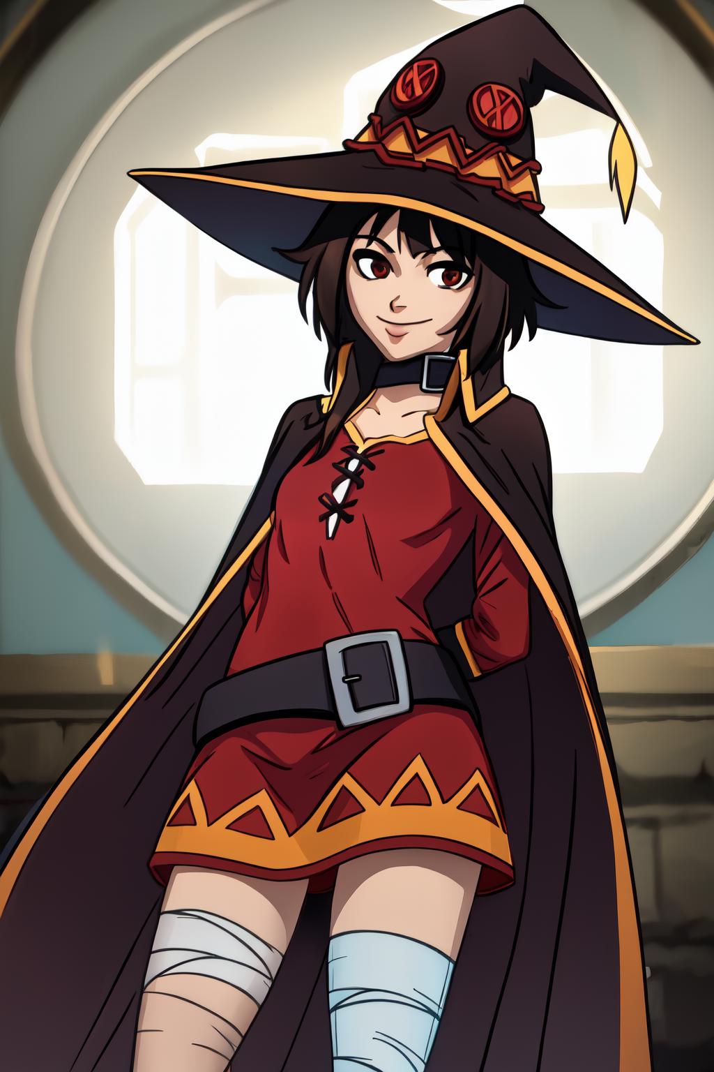 <lora:KonosubaMegumin-v1-07:0.8>, ChopioMegumin, brown hair, short hair with long locks, sidelocks, red eyes, (looking at viewer:1.3),