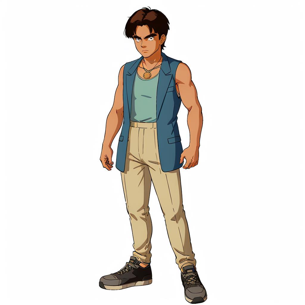 short hair,brown hair,parted bangs,thick eyebrows,sanpaku,black eyes,dark skin,