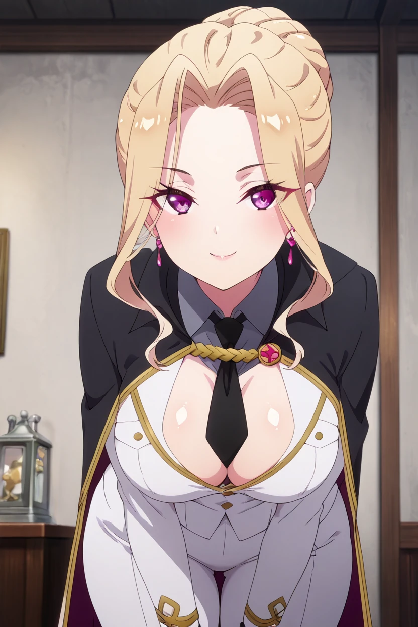zzOtome, pink eyes, purple eyes, eyes visible through hair, blonde hair, hair bun, single hair bun, sidelocks, jewelry, earrings, necktie, black necktie, shirt, black cape, gloves,