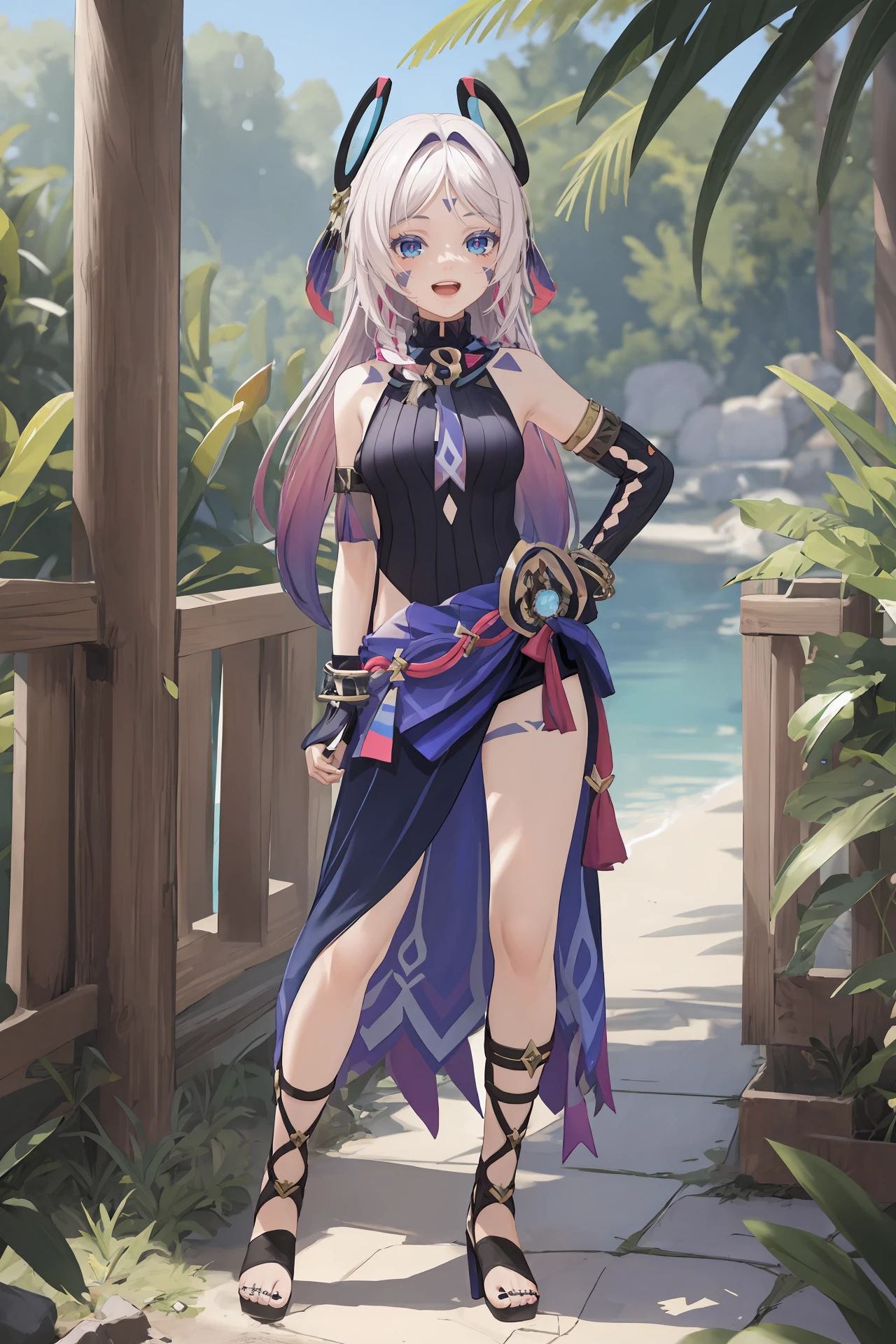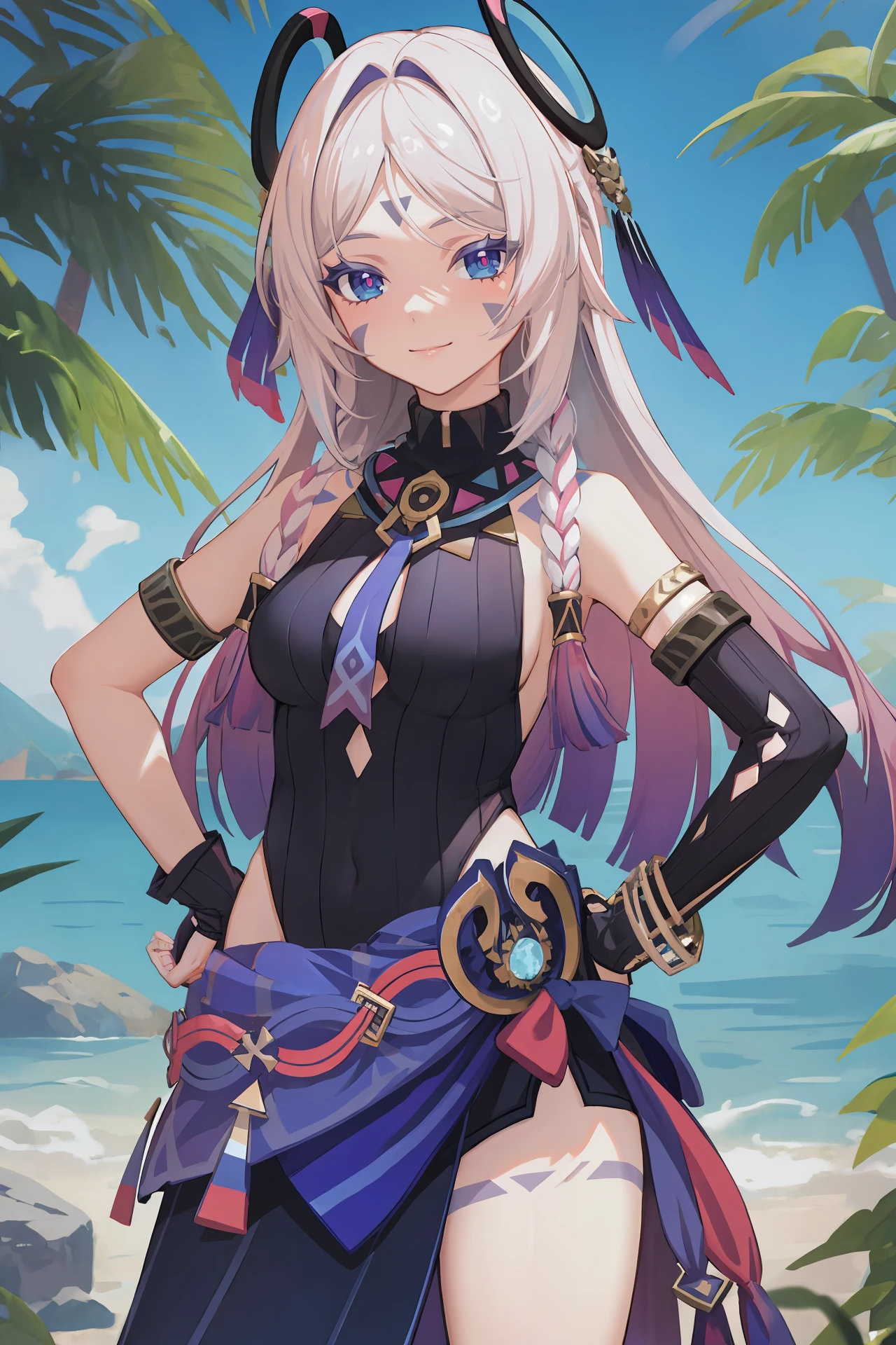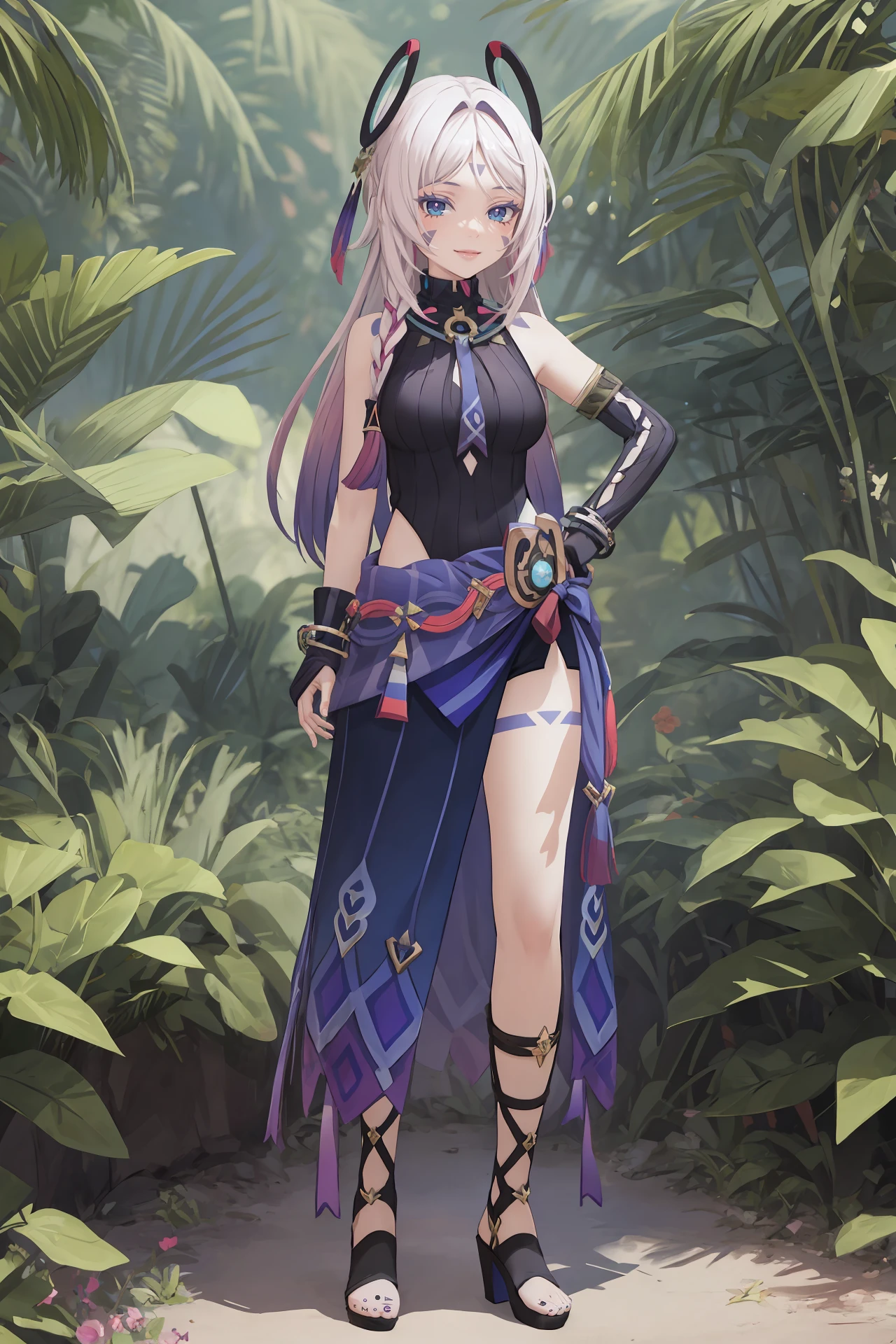 Additional prompts for her default costume, add/remove as you needed: fingerless gloves, armlet, sarong, facial mark, bracelet, ring hair ornament, turtleneck leotard, leg tatoo, single gauntle, gladiator sandals