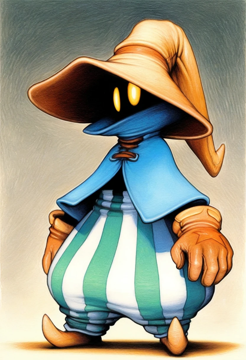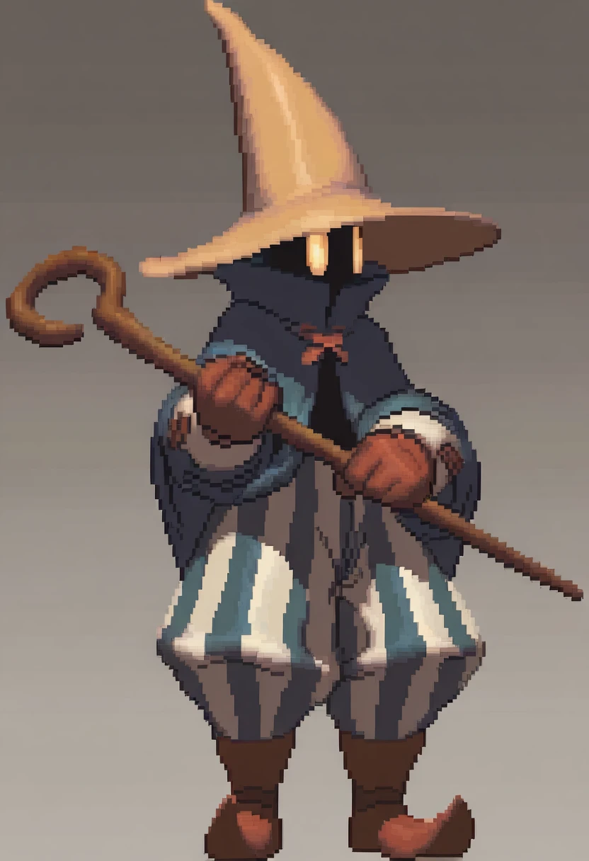 ziggy, yellow eyes, shaded face, faceless, no mouth, wizard hat, striped pants, cloak, robe, gloves, puffy pants