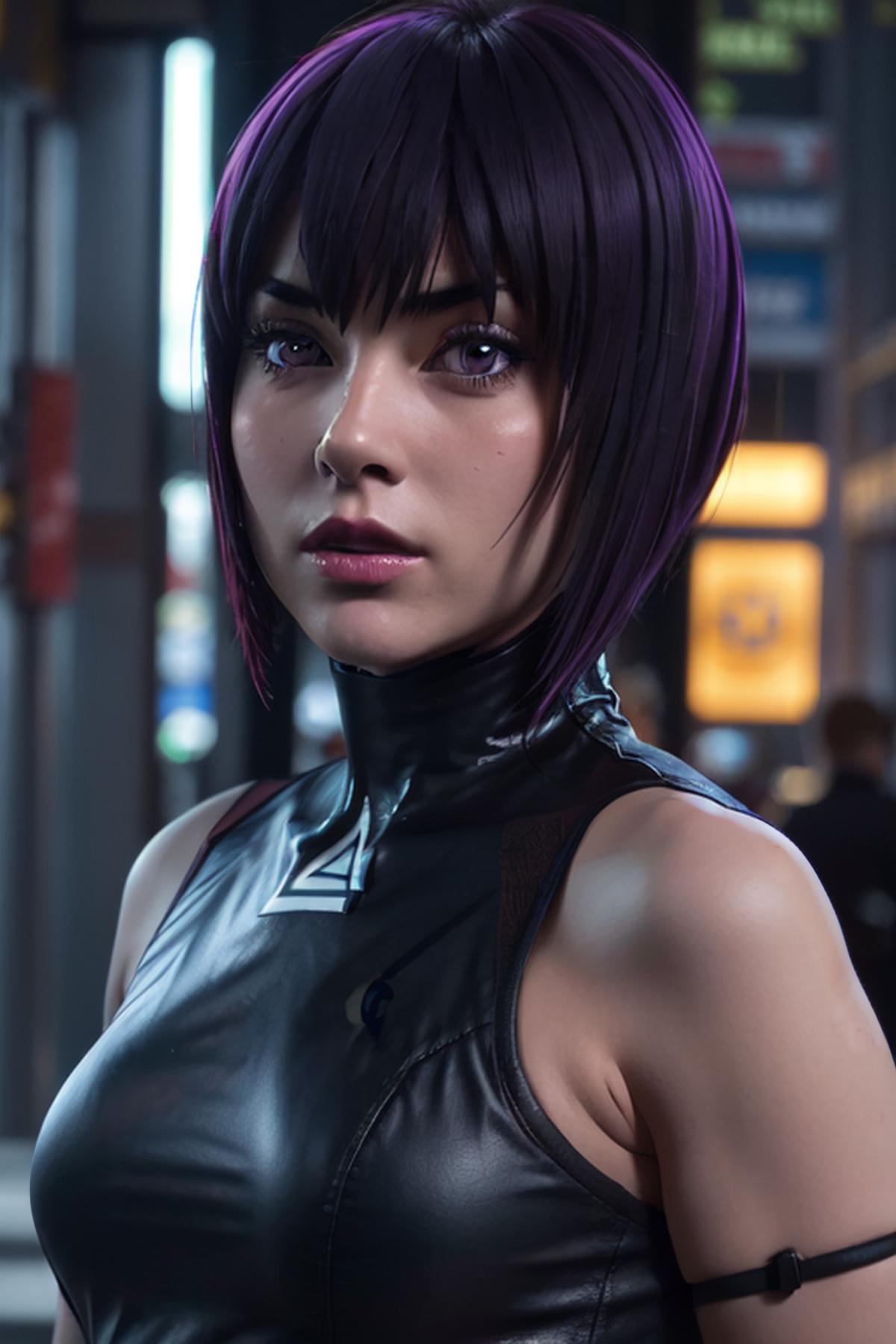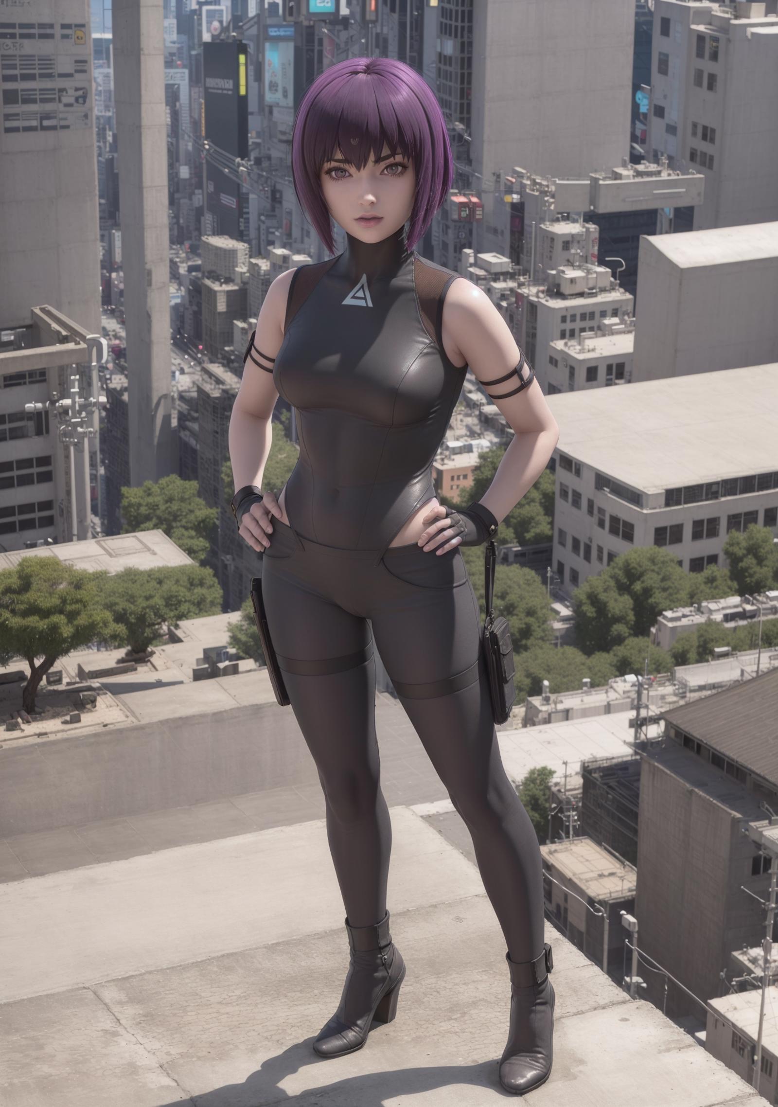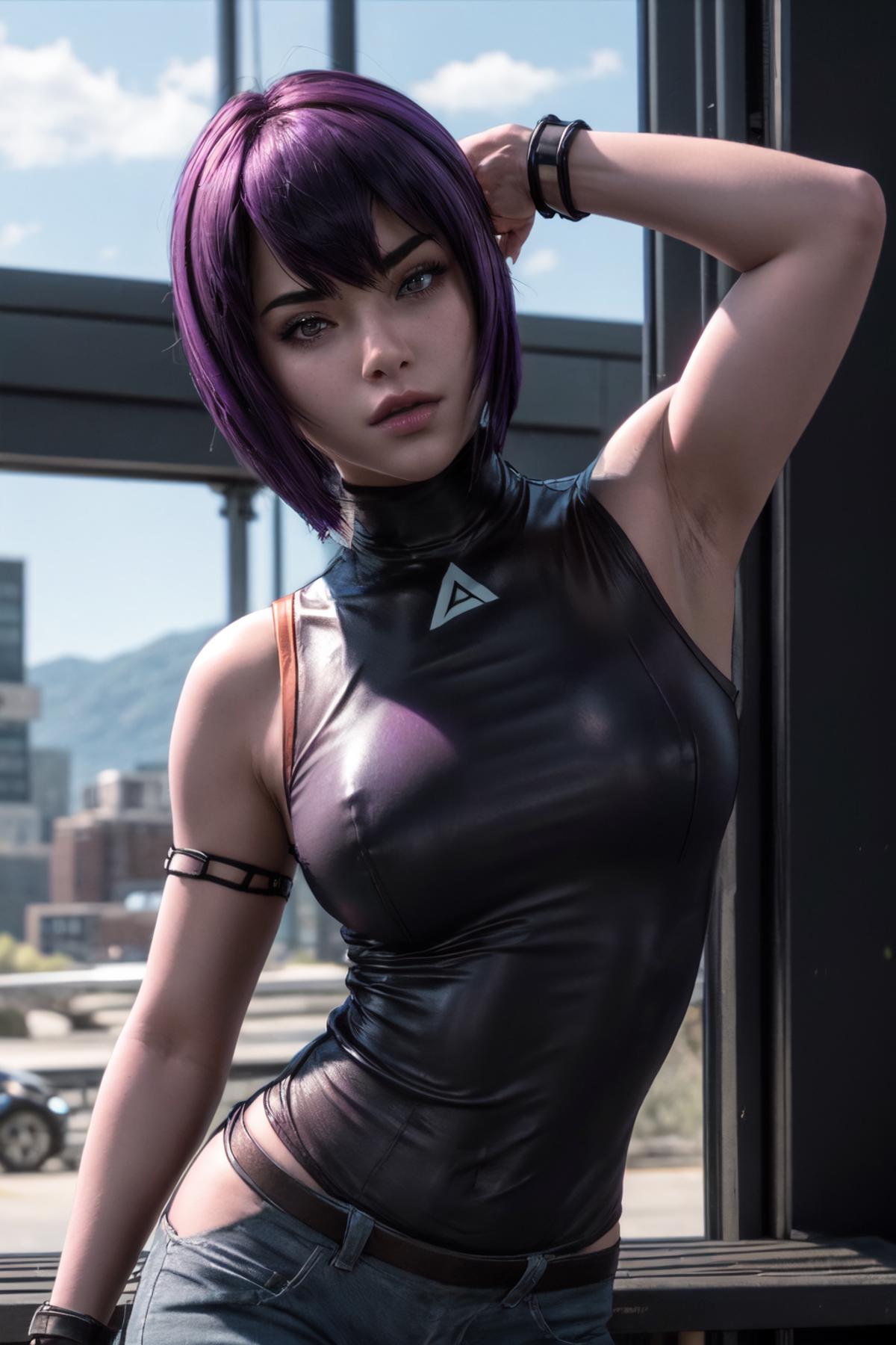 • Without pants and jacket: motoko2045wz, black leotard, fingerless gloves, purple eyes, purple hair, purple hair, short hair, lips