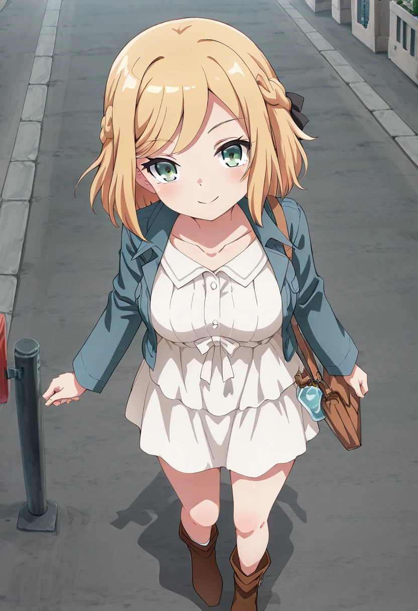 Fine Cavendish - zzFine, 1girl, solo, green eyes, blonde hair, short hair, bangs, long sleeves, dress, medium breasts, collarbone, jacket, braid, boots, white dress, high heels, open jacket, brown footwear, blue jacket, crown braid, pleated dress, denim jacket,