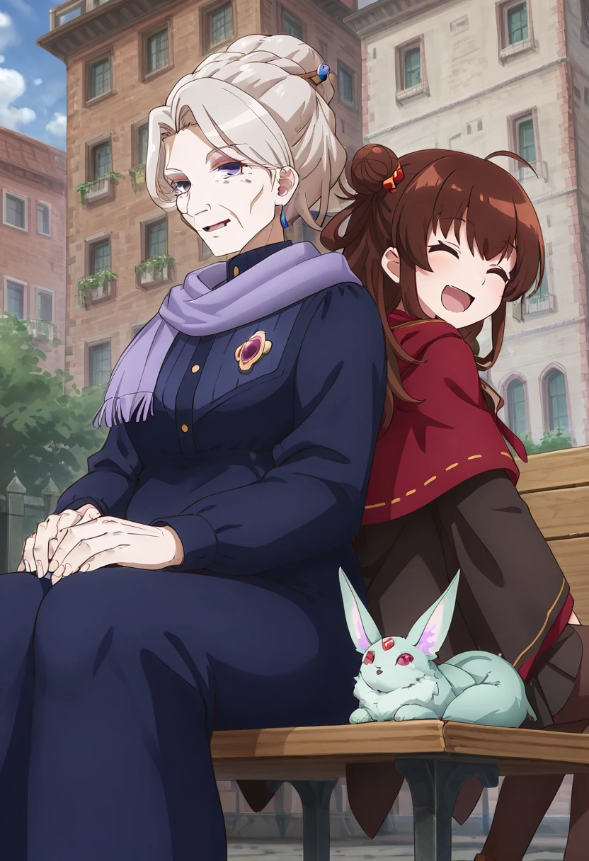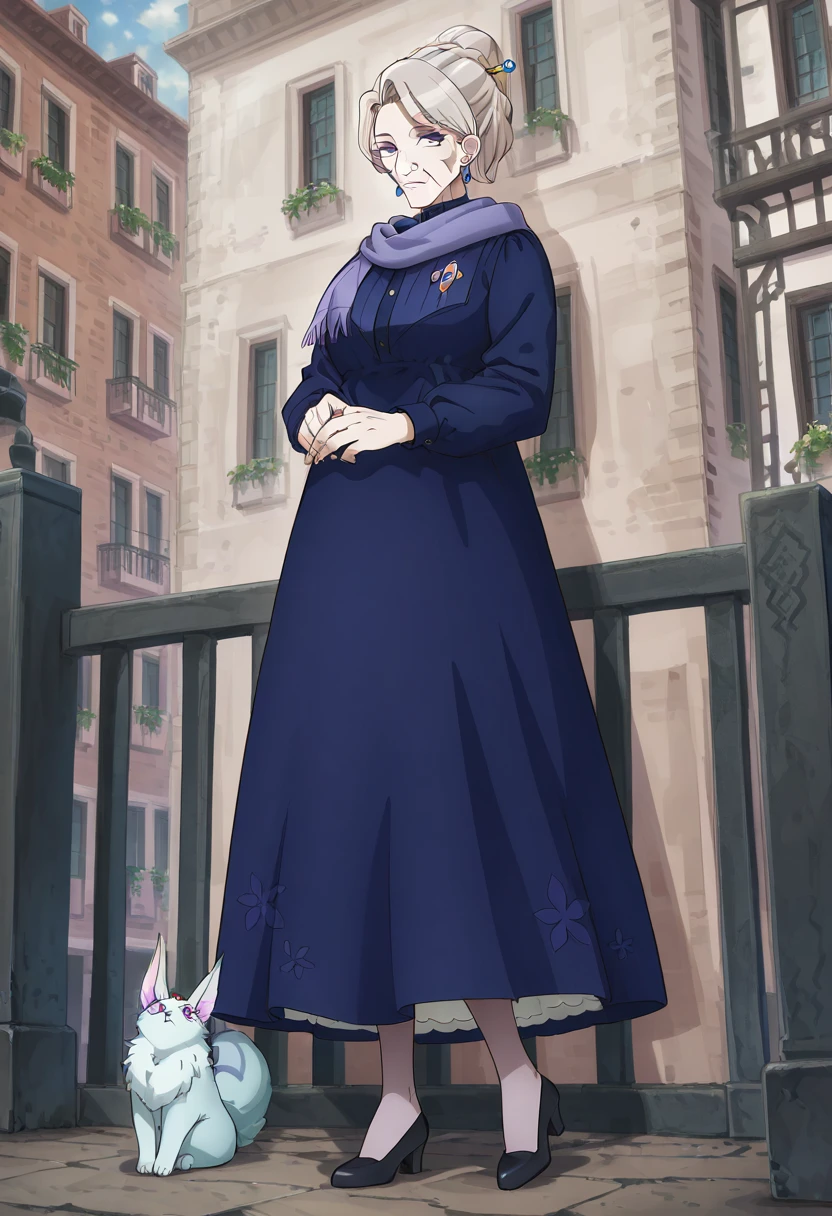 Faust - zzFaust, 1girl, solo, old woman, blue eyes, blonde hair, hair ornament, long sleeves, dress, jewelry, purple eyes, grey hair, earrings, hair bun, scarf, black footwear, blue dress, single hair bun, blue scarf, purple scarf,