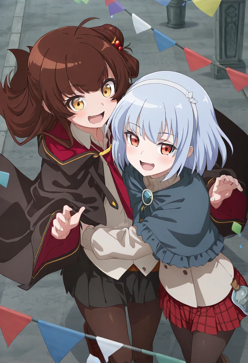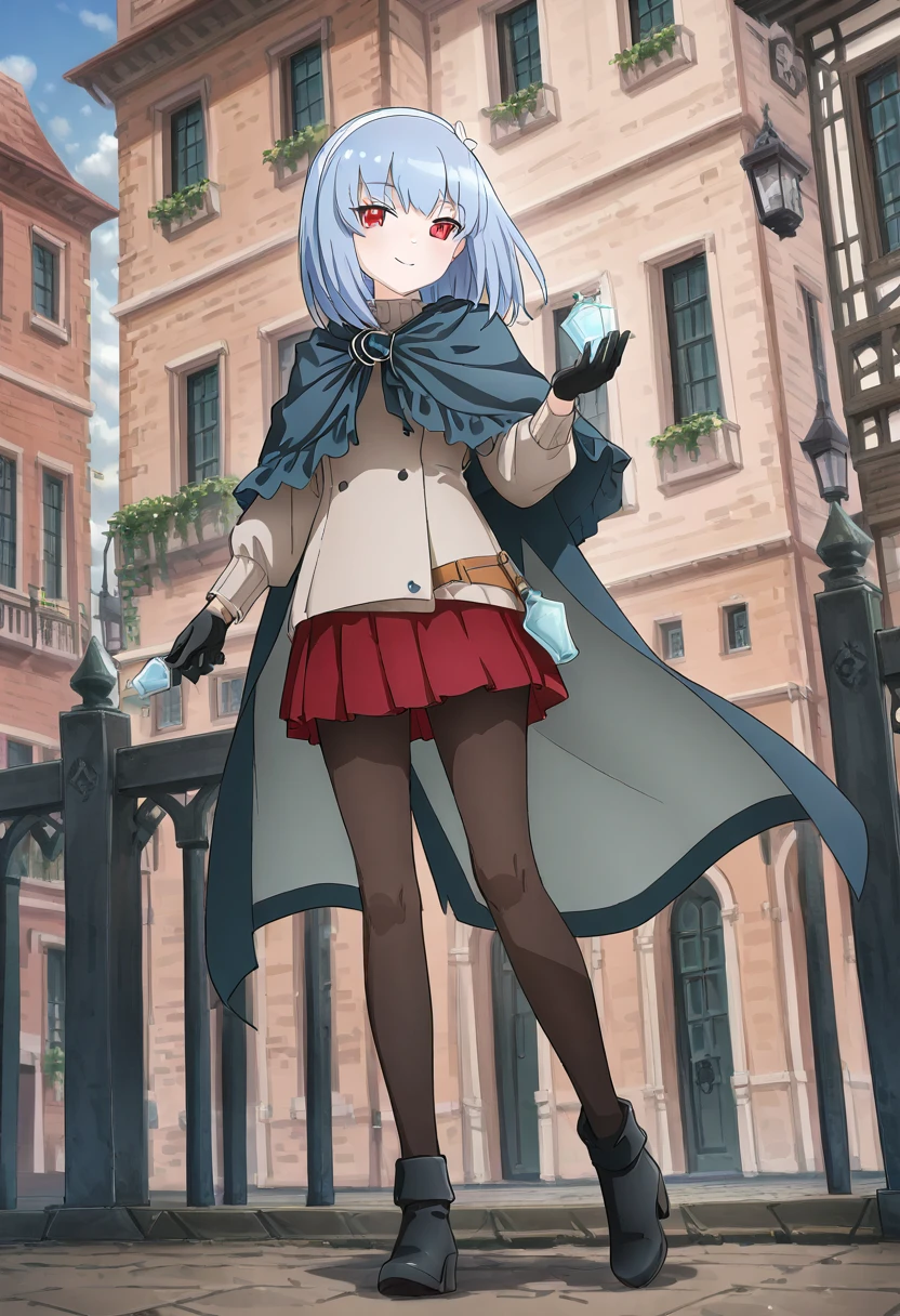 Sophie Hayter - zzSophie, 1girl, solo, red eyes, blue hair, short hair, bangs, skirt, gloves, long sleeves, dress, pantyhose, hairband, boots, black gloves, medium hair, black footwear, high heels, sweater, coat, black pantyhose, capelet, red skirt, white hairband,