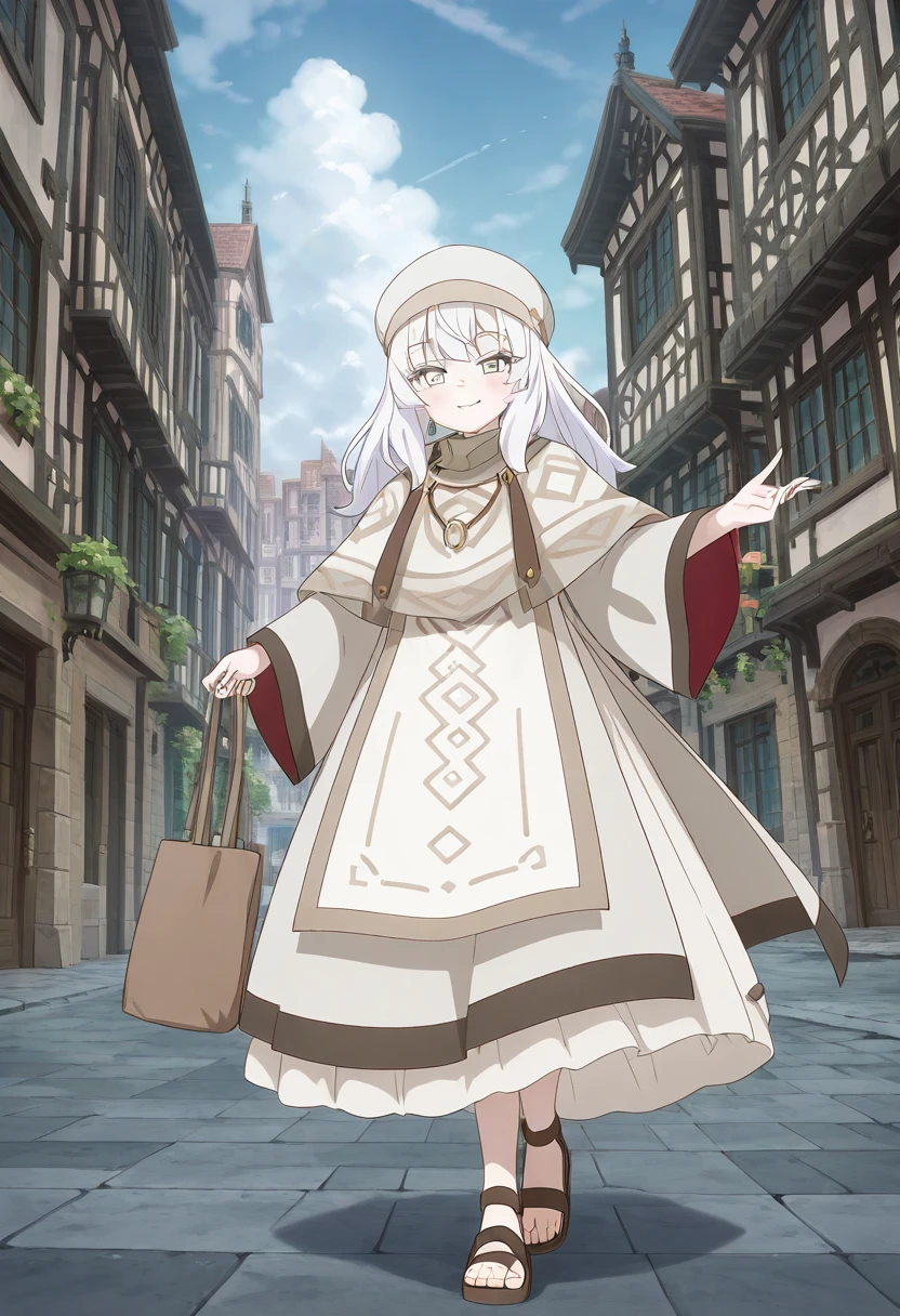 Mysterious Girl - zzMysterious, 1girl, solo, grey eyes, white hair, long hair, long sleeves, hat, dress, jewelry, wide sleeves, capelet, sandals, poncho, grey capelet,
