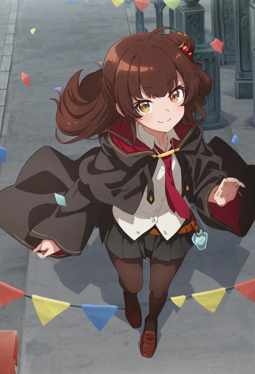 Meg Raspberry - zzMeg, 1girl, solo, brown eyes, brown hair, long hair, bangs, skirt, shirt, hair ornament, long sleeves, school uniform, white shirt, ahoge, pantyhose, pleated skirt, necktie, collared shirt, wide sleeves, black skirt, hair bun, black pantyhose, brown footwear, red necktie, loafers,