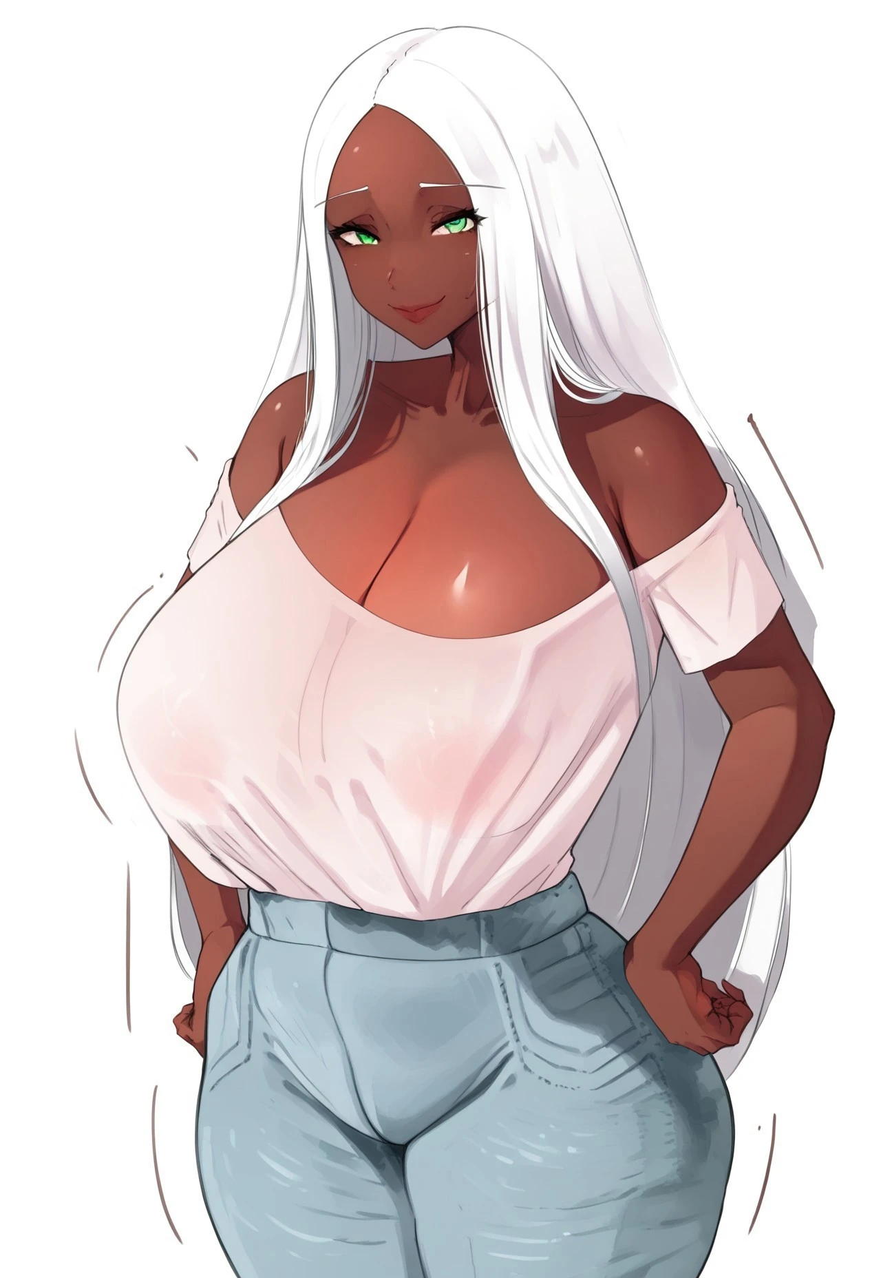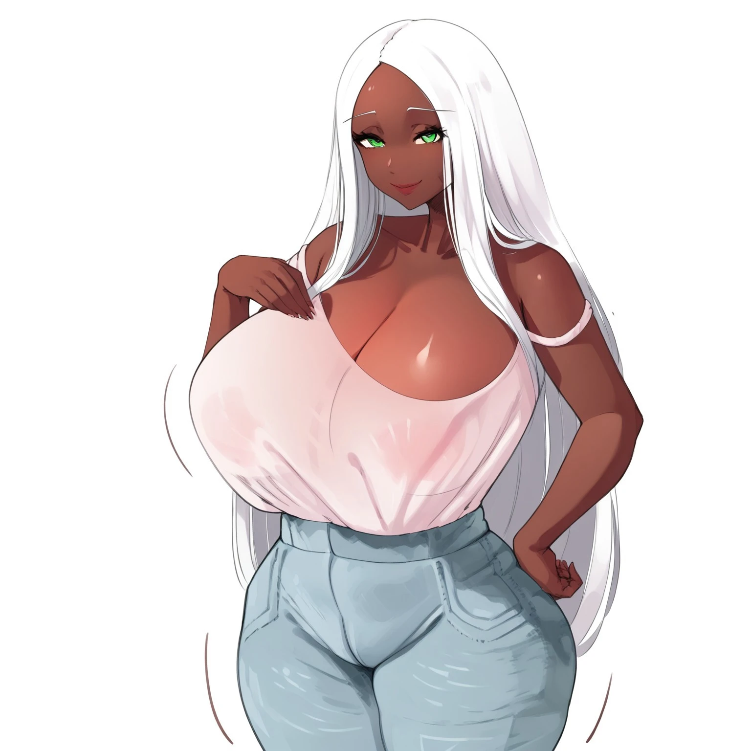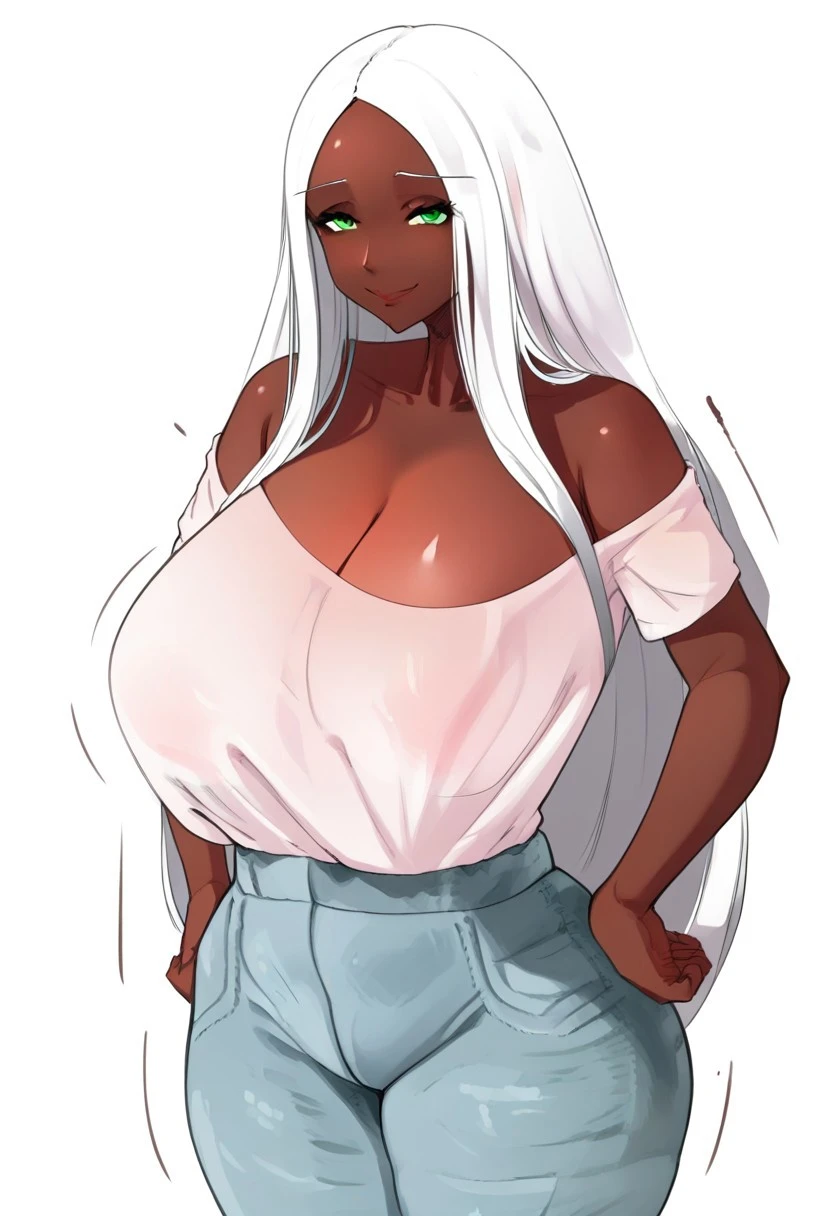 1girl, dark skinned female, Dark-skinned female, white hair, long white hair, green eyes, huge breasts, huge breasts size,