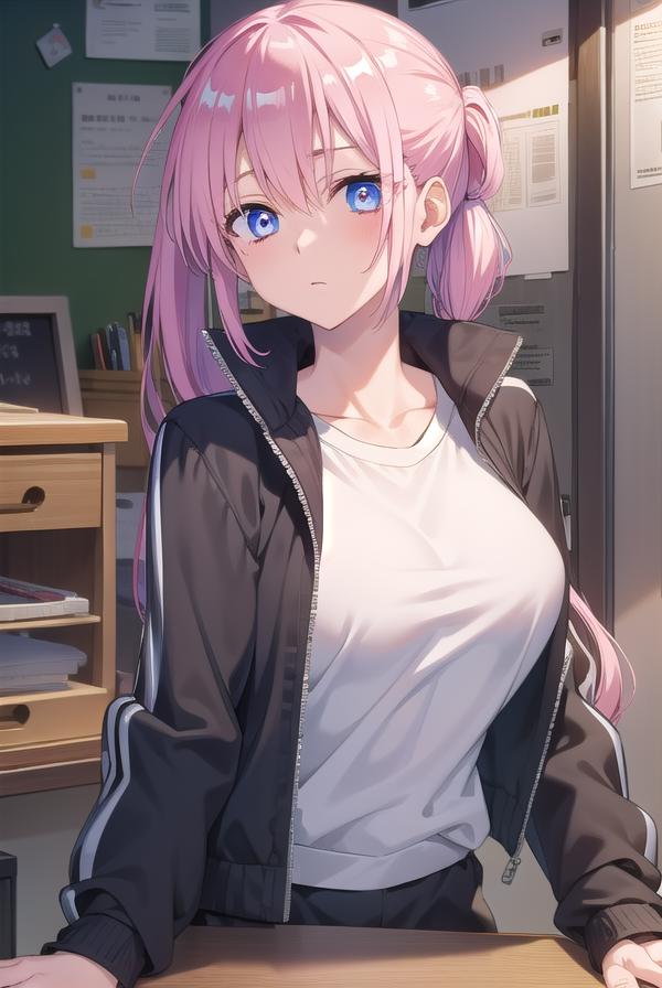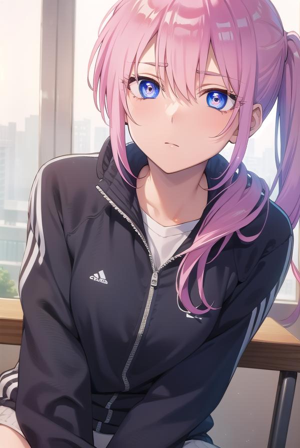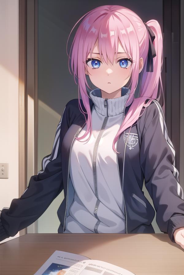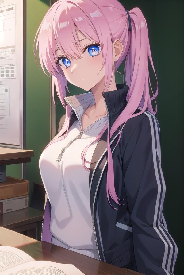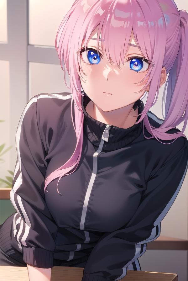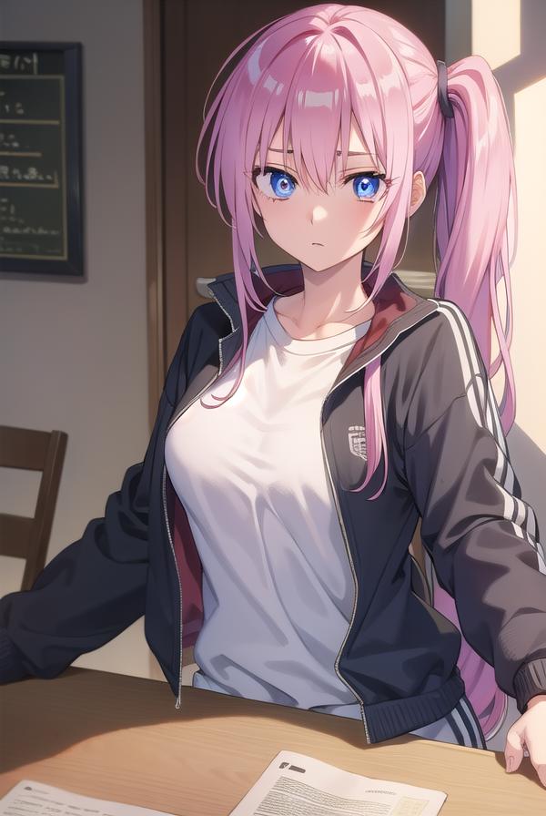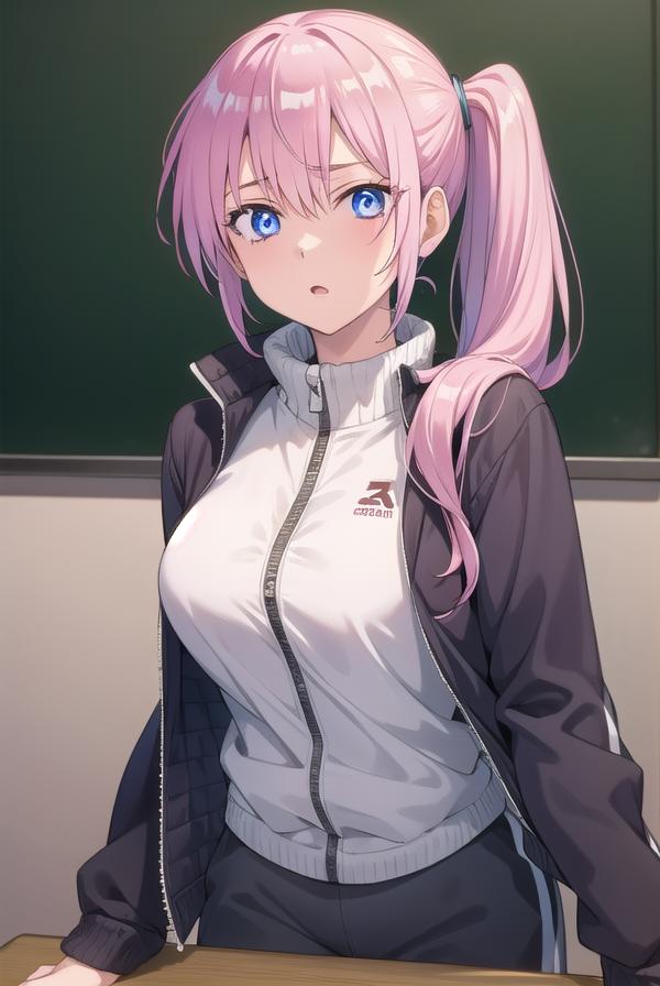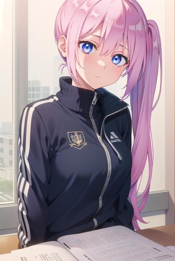 long sleeves, jacket, white shirt, side ponytail, blue jacket, track jacket, track suit,