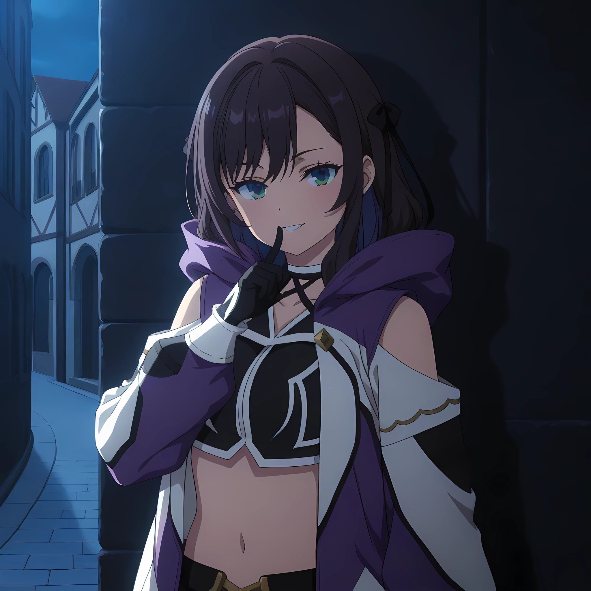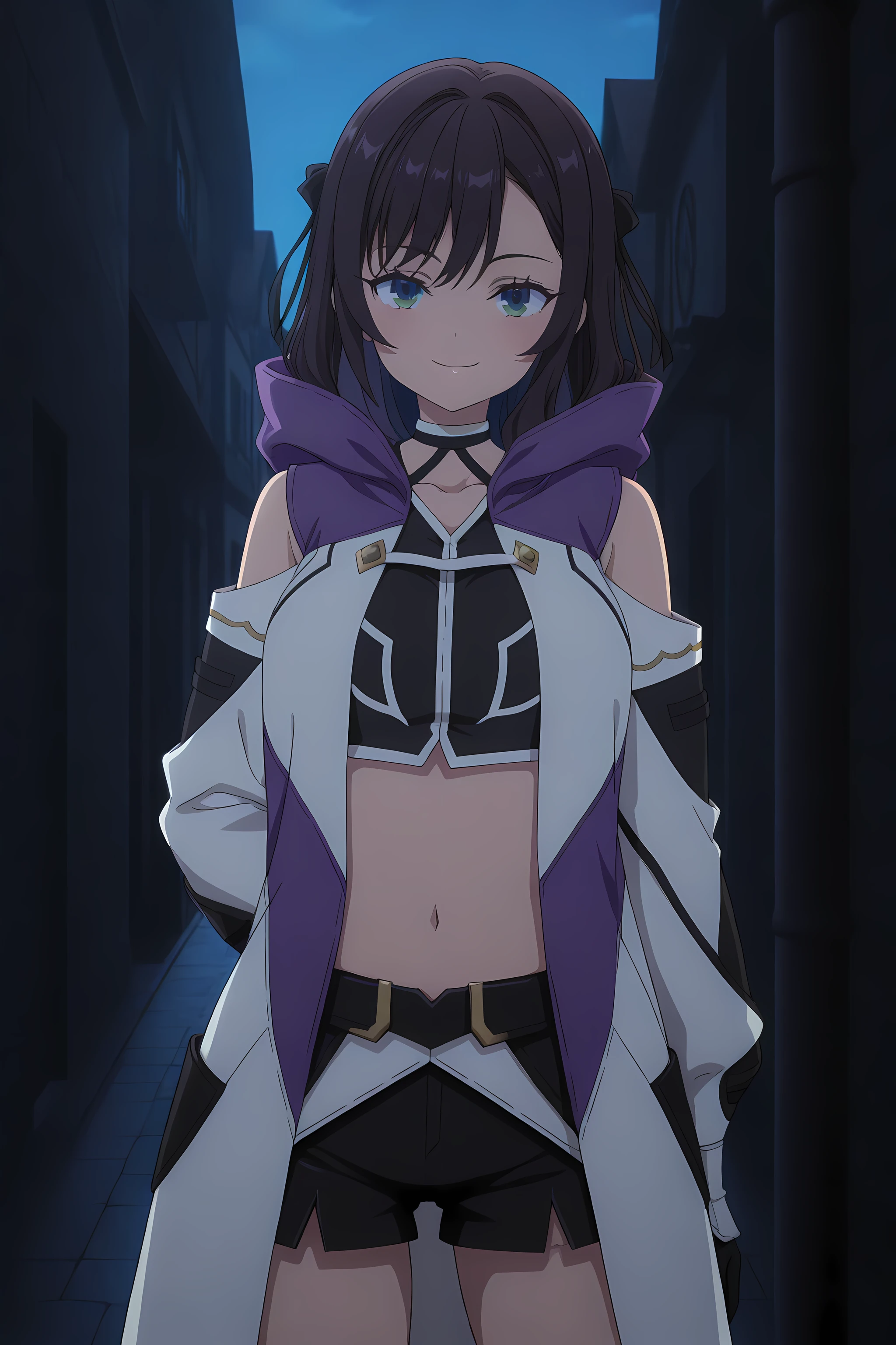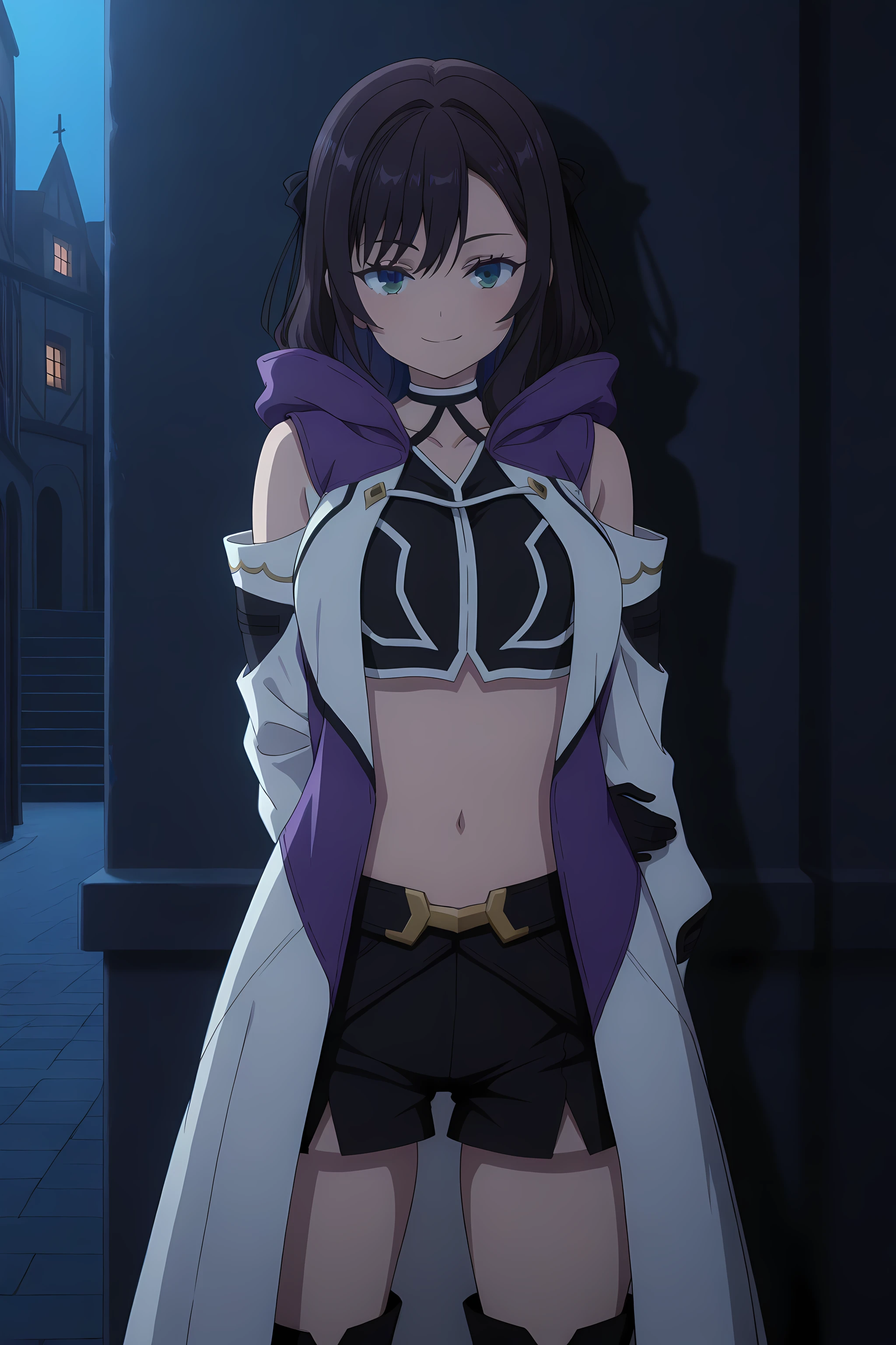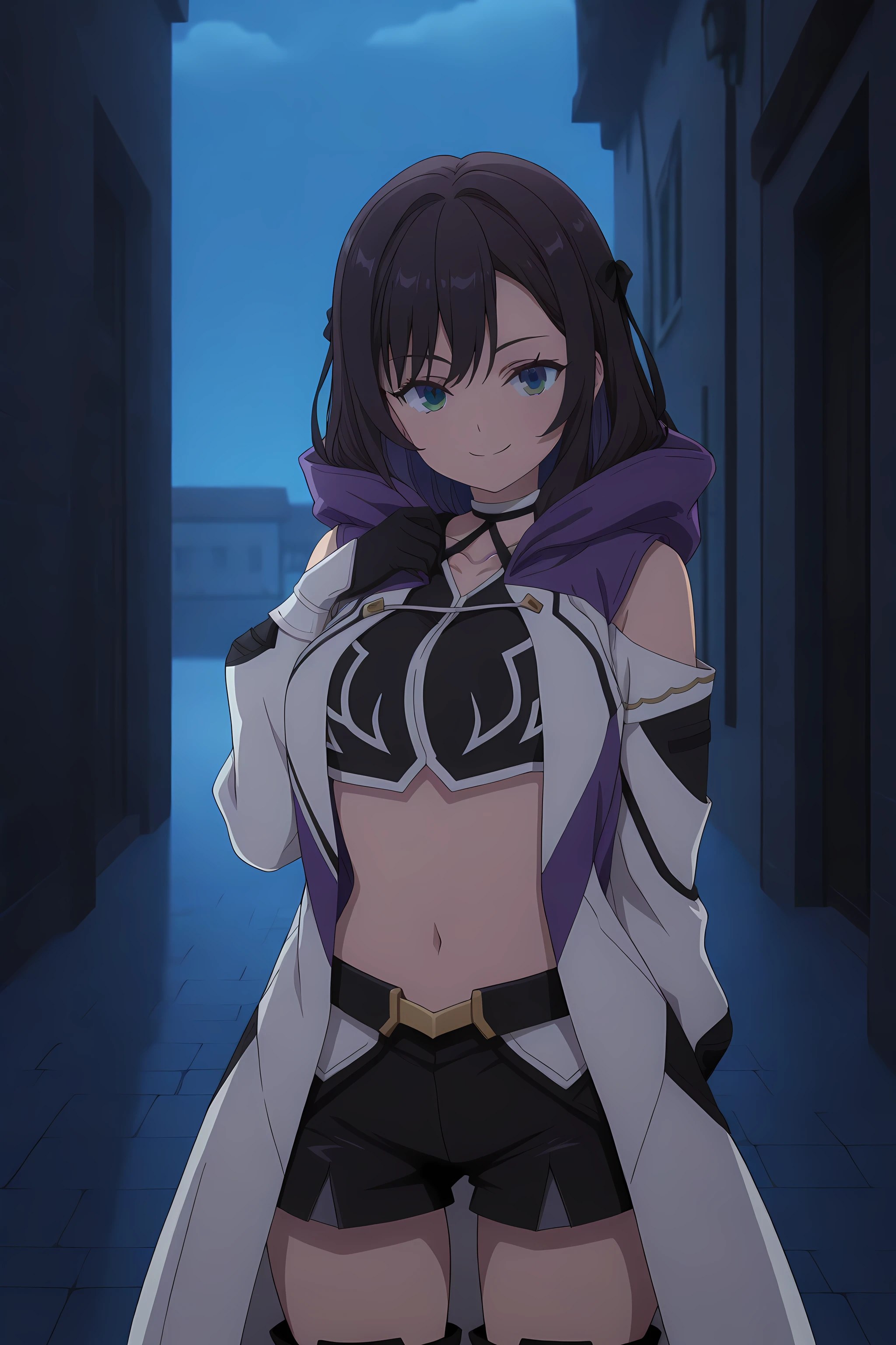 alina_clover, executioner_outfit, 1girl, solo, hood, navel, gloves, shorts, standing, boots, black gloves, thighhighs, green eyes
