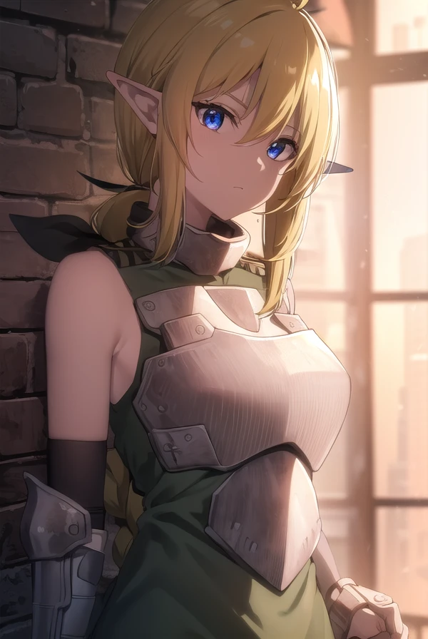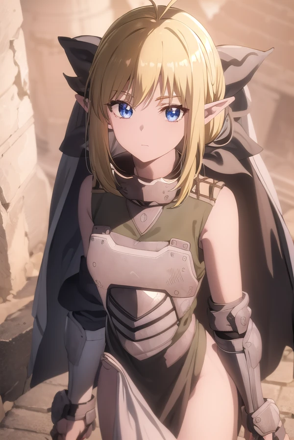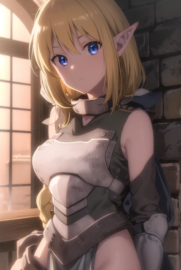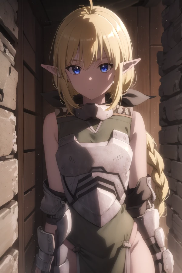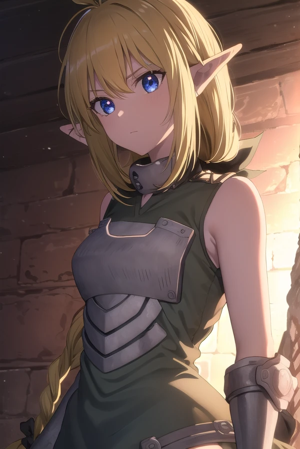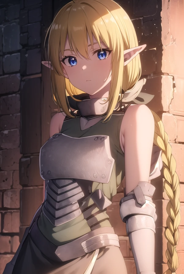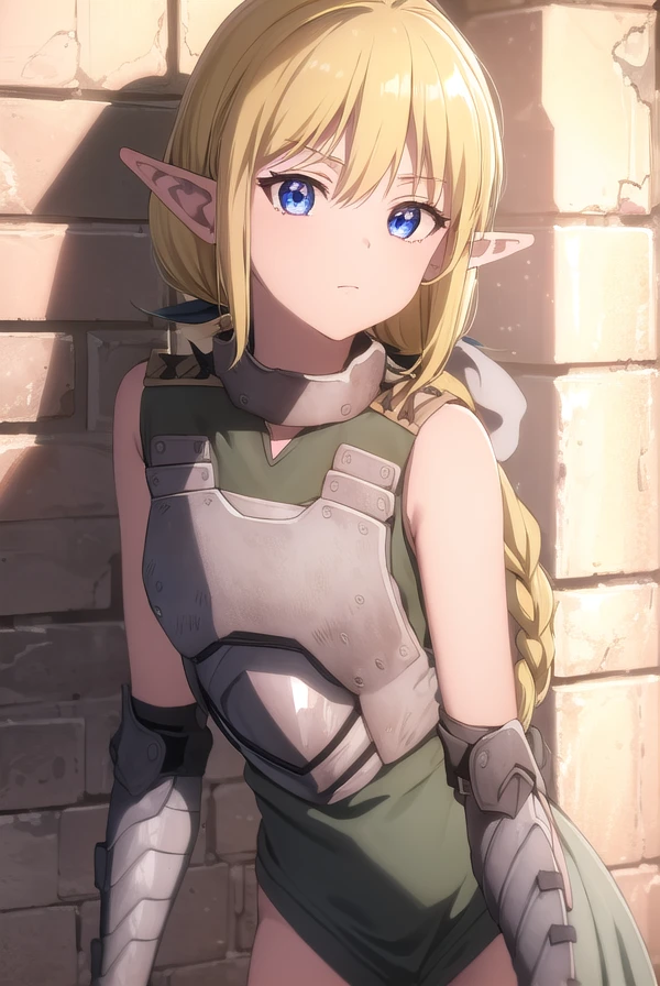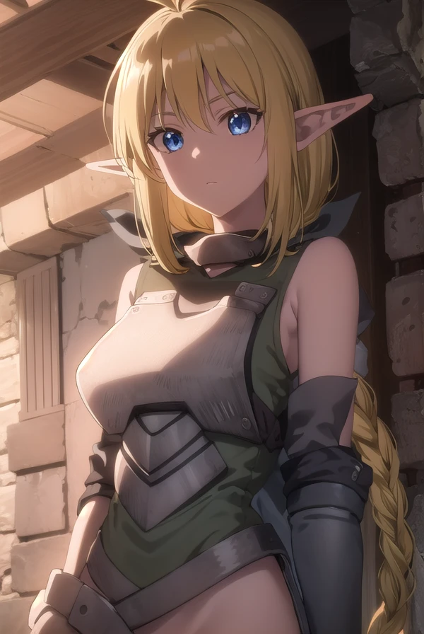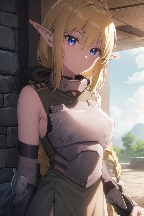 franlil lil alil, long hair, blonde hair, ribbon, very long hair, hair ribbon, braid, pointy ears, single braid, black ribbon, antenna hair, elf, braided ponytail, blue eyes,