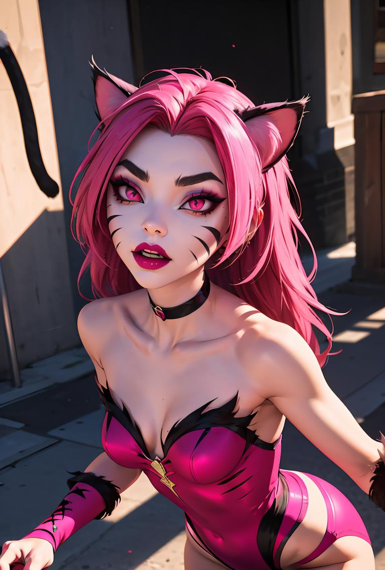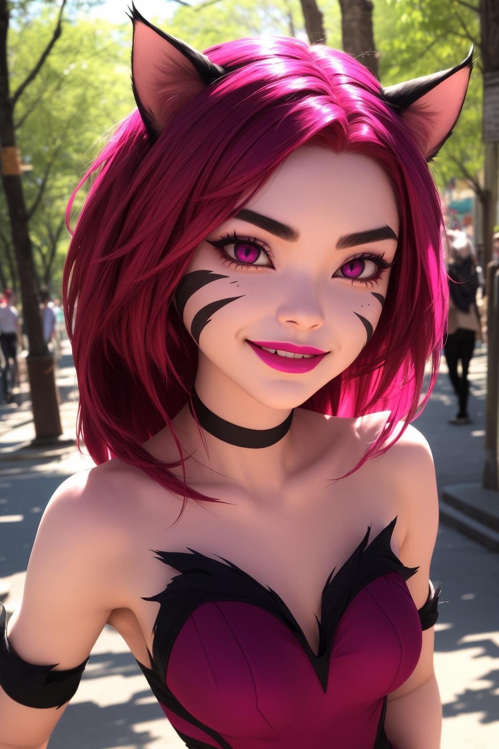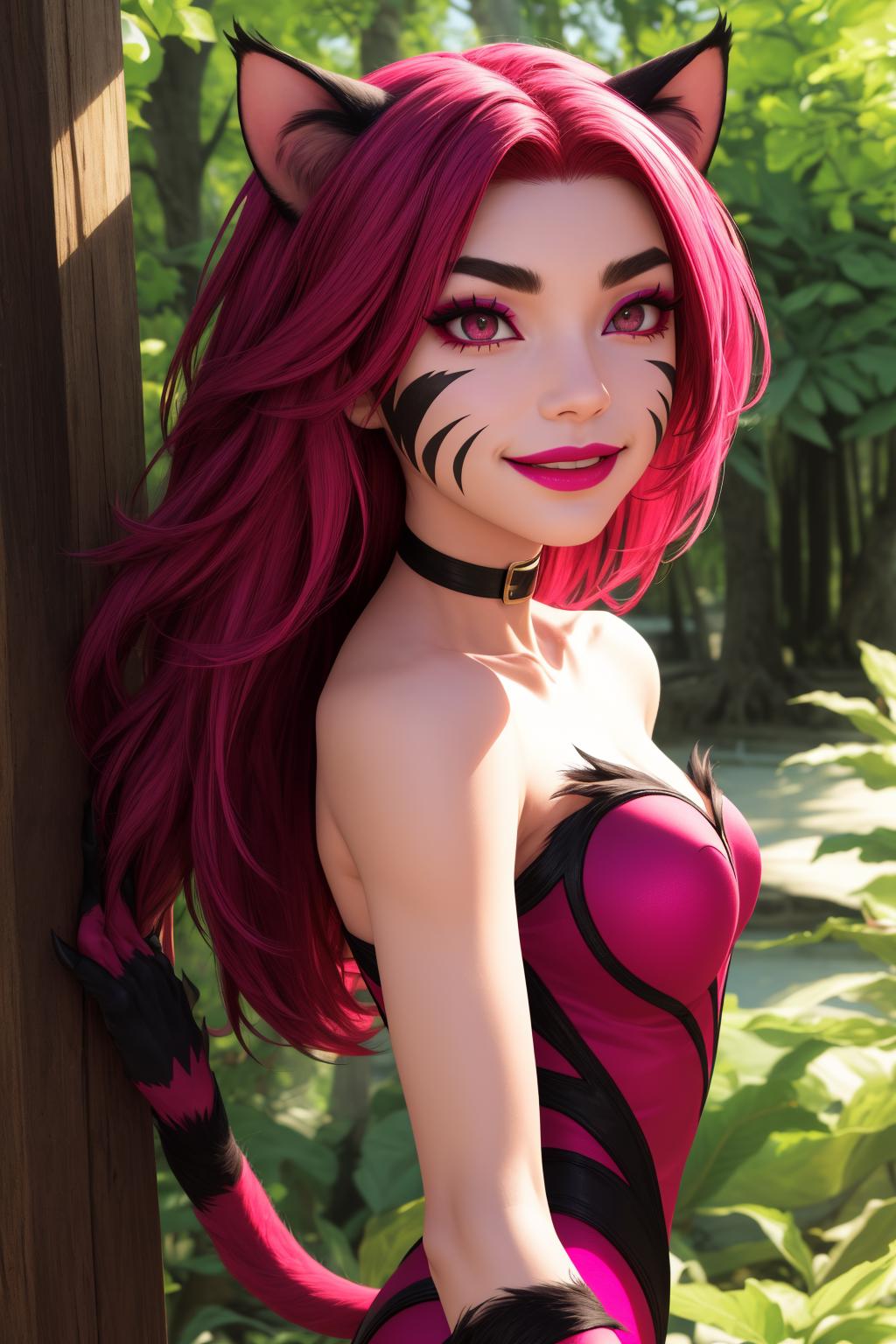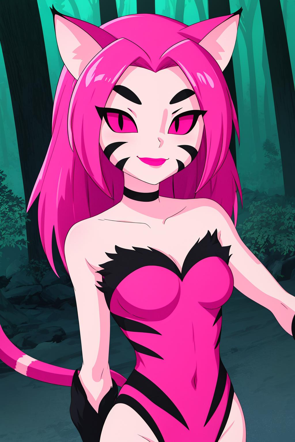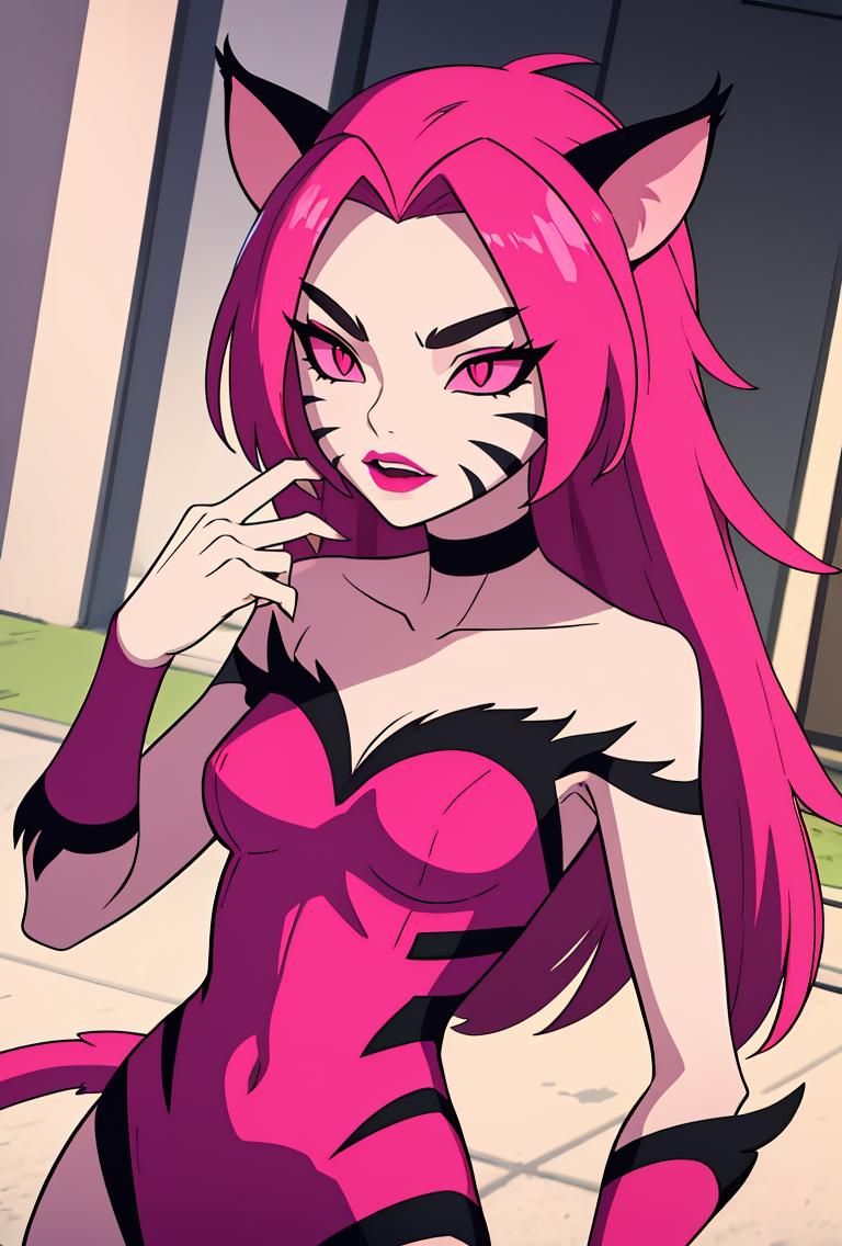 nyanya, 1girl, solo, pink eyes, slit pupils, colored sclera, pink hair, long hair, bangs, whisker markings, makeup, cat ears, cat tail, claws, pink skin, cat girl,