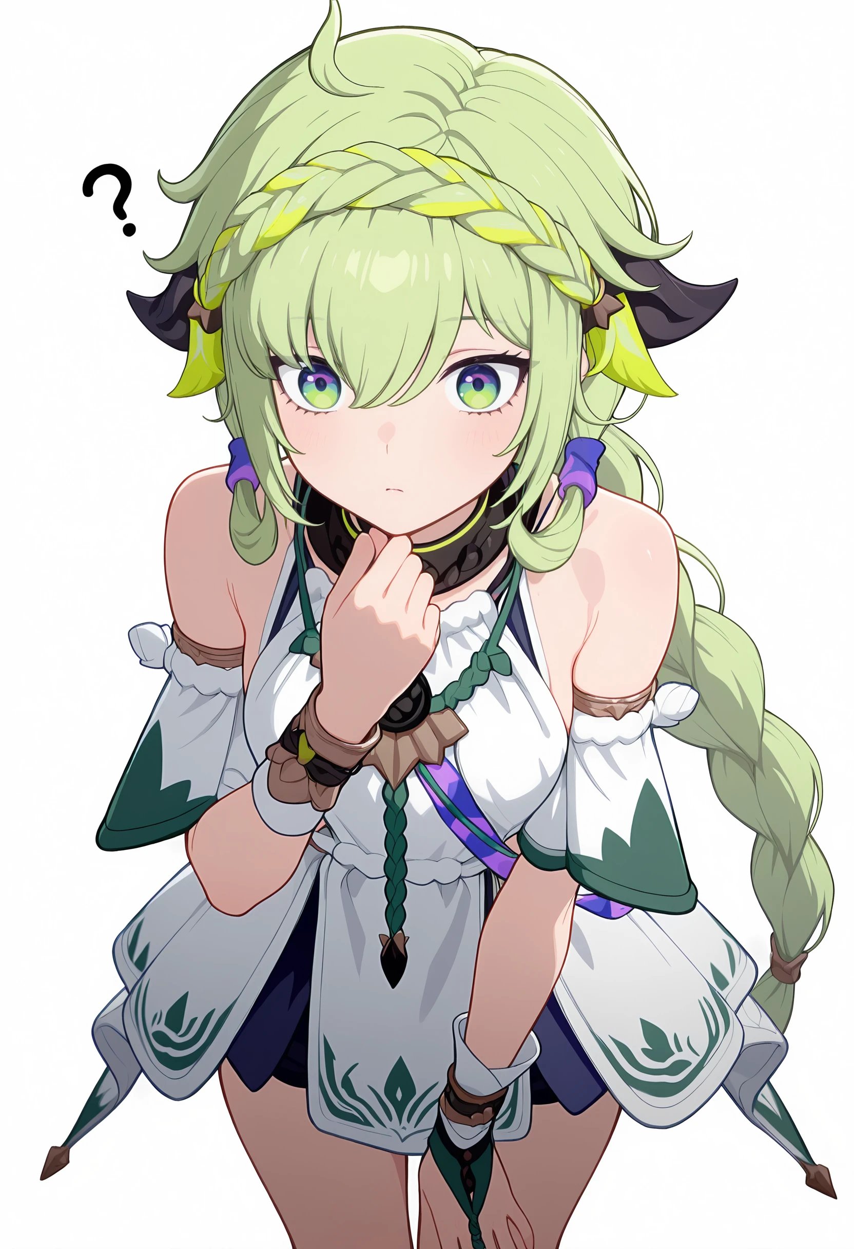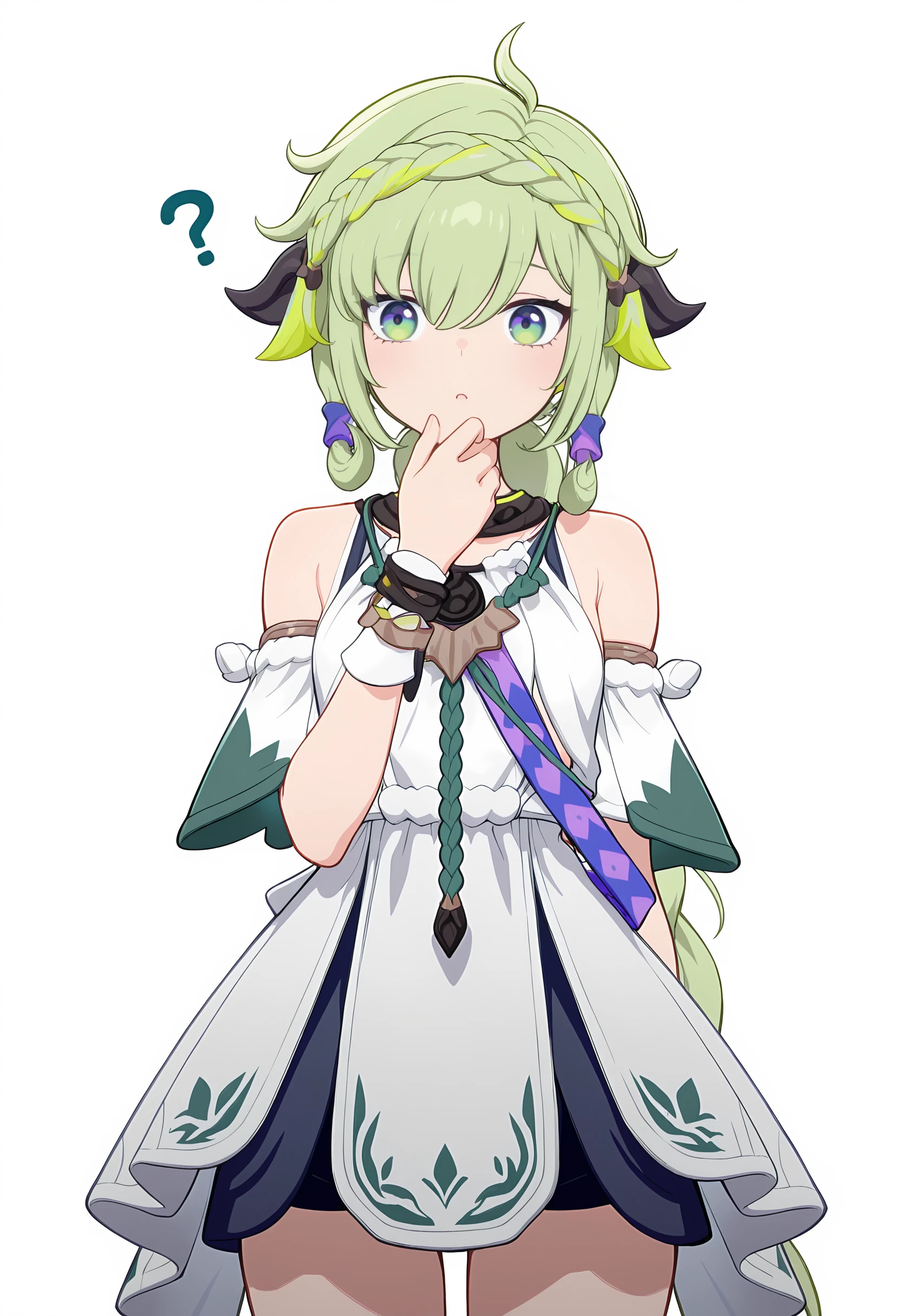 1girl, Airona, green hair, top braid with highlights, hair ornaments, long braid, hair between eyes, sideburns, ahoge, purple hairties, multicolored eyes, green eyes, purple eyes,