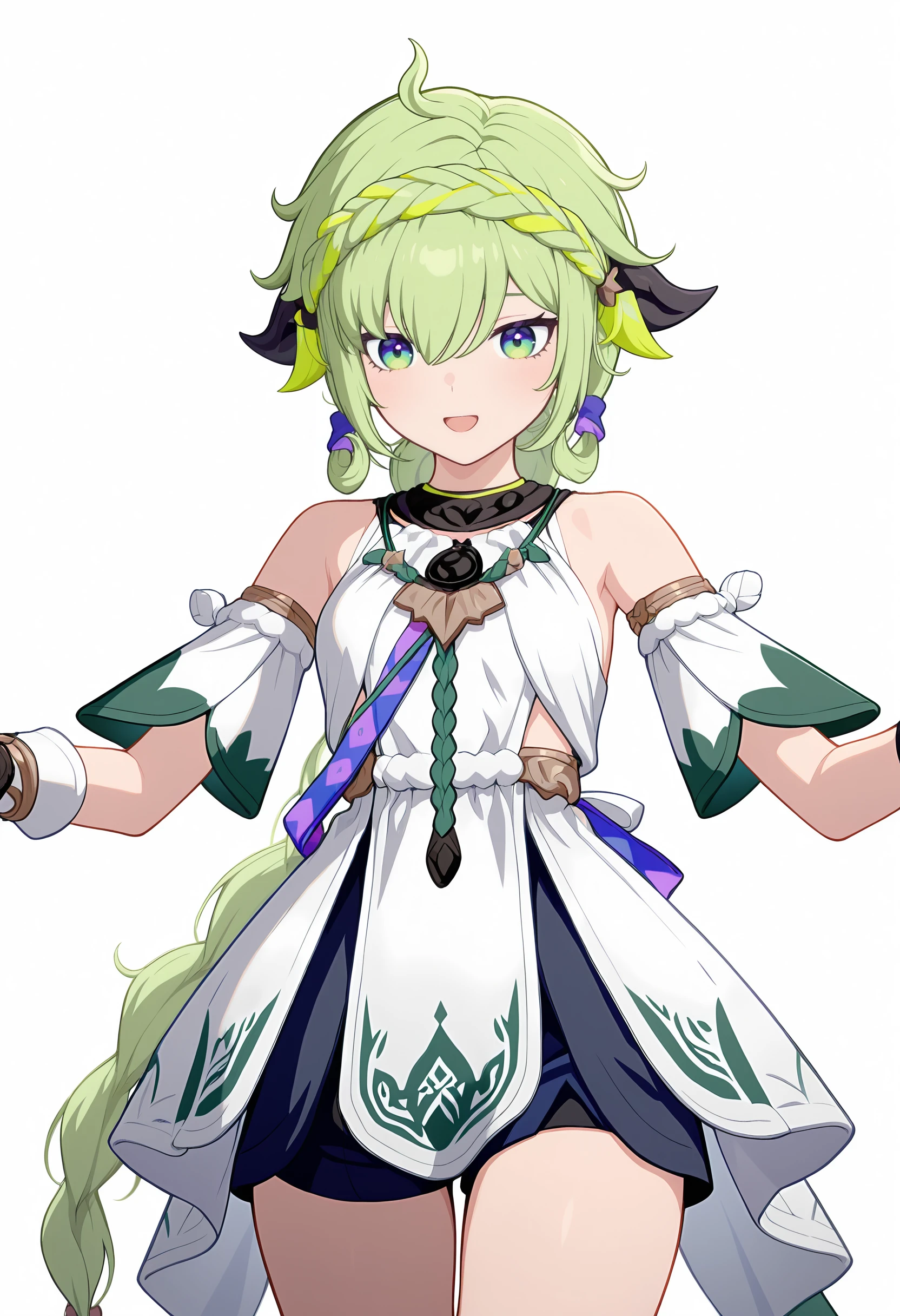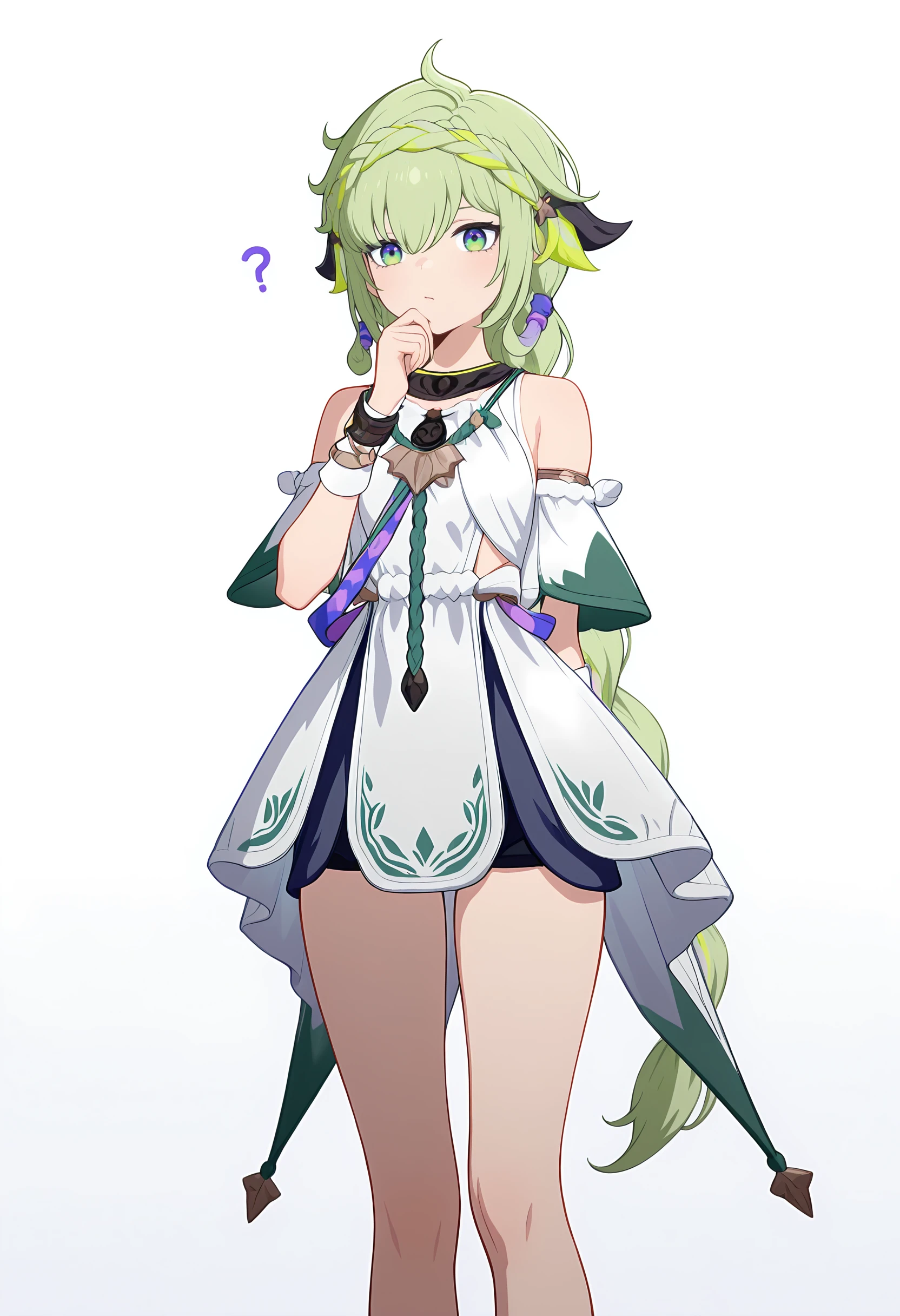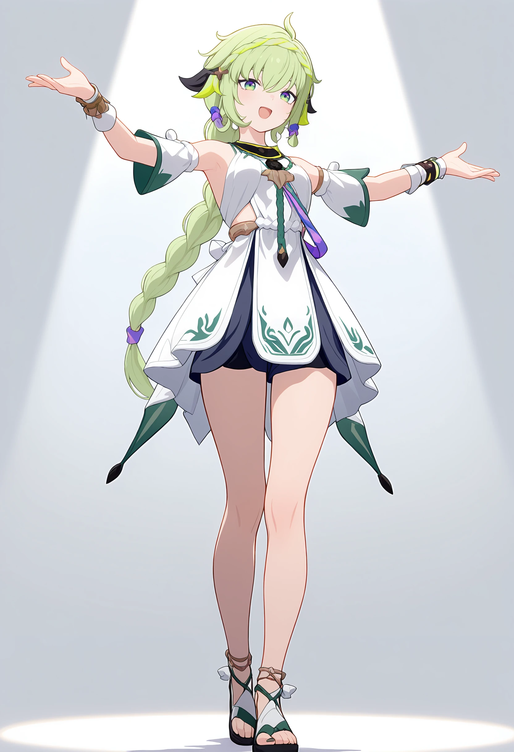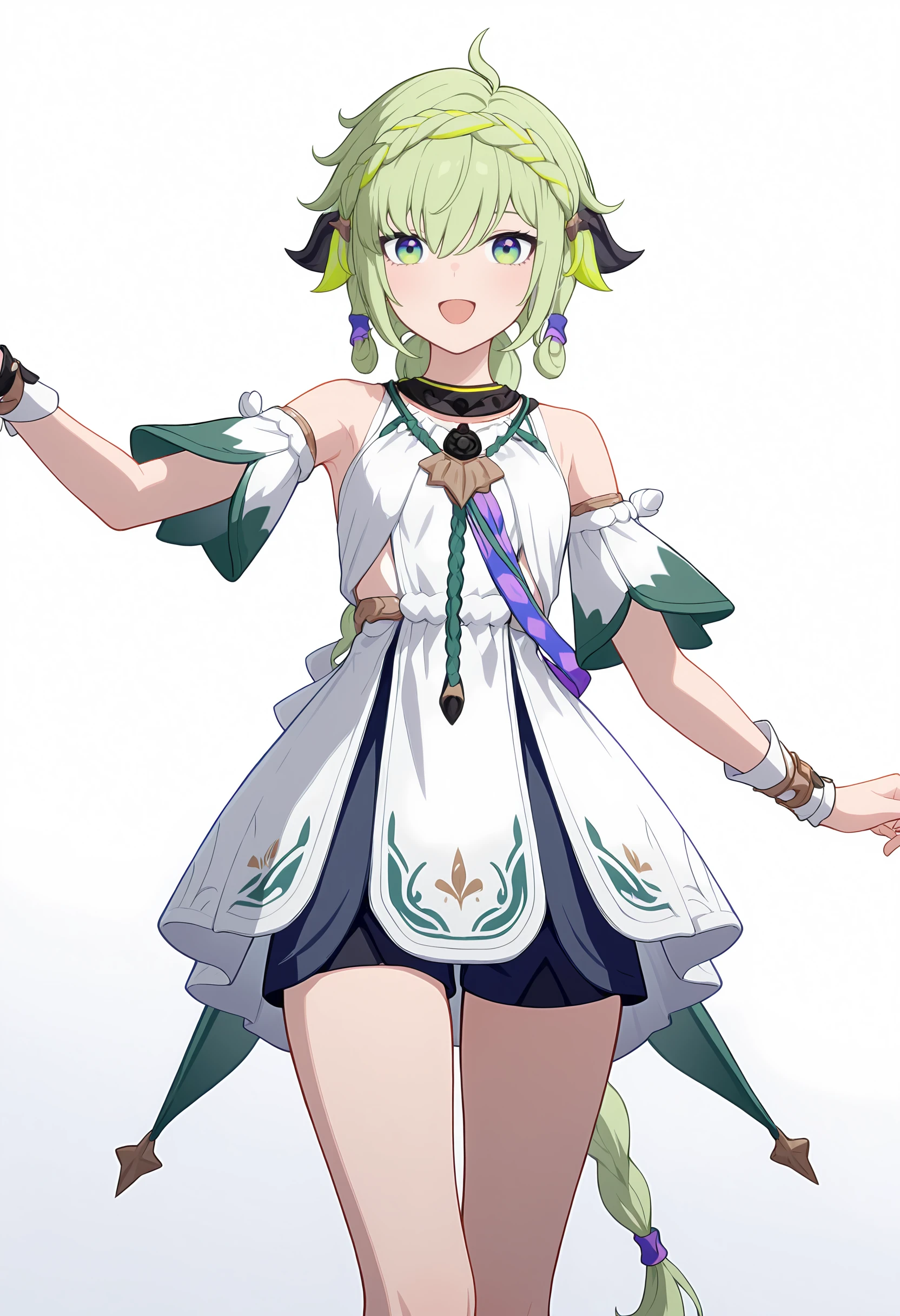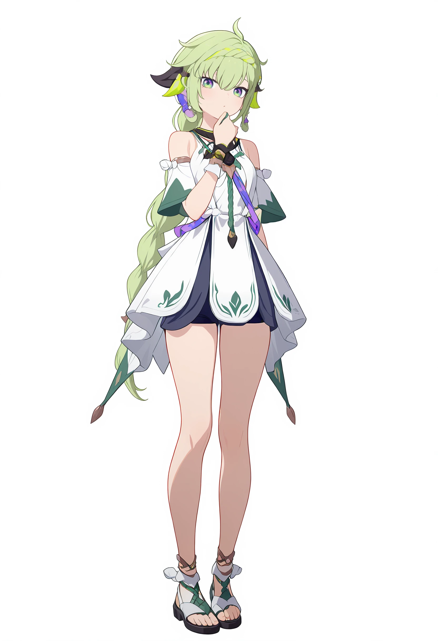 black loose choker, green laces, black pendant, white dress, green dress pattern, shoulder cut, detached sleeves, arm bands, blue shorts, pointy skirt ends, bare legs, white sandals,
