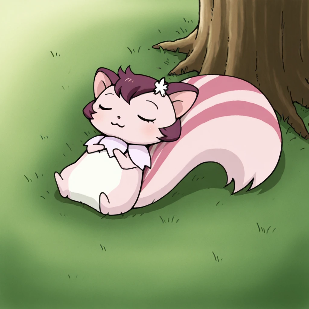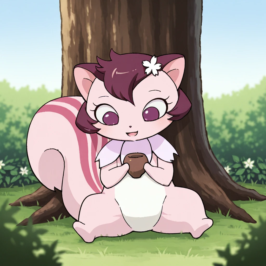chibi, (feral), chipmunk, big tail, pink fur, white fur, flower on head, purple hair, purple eyes