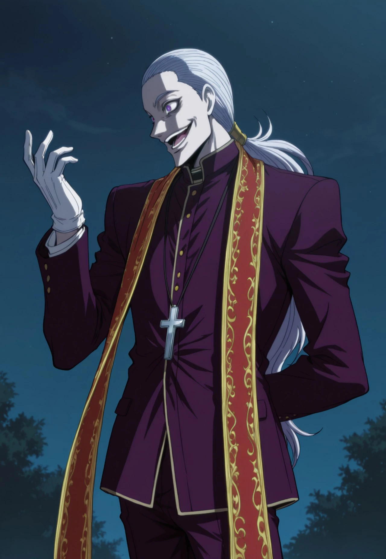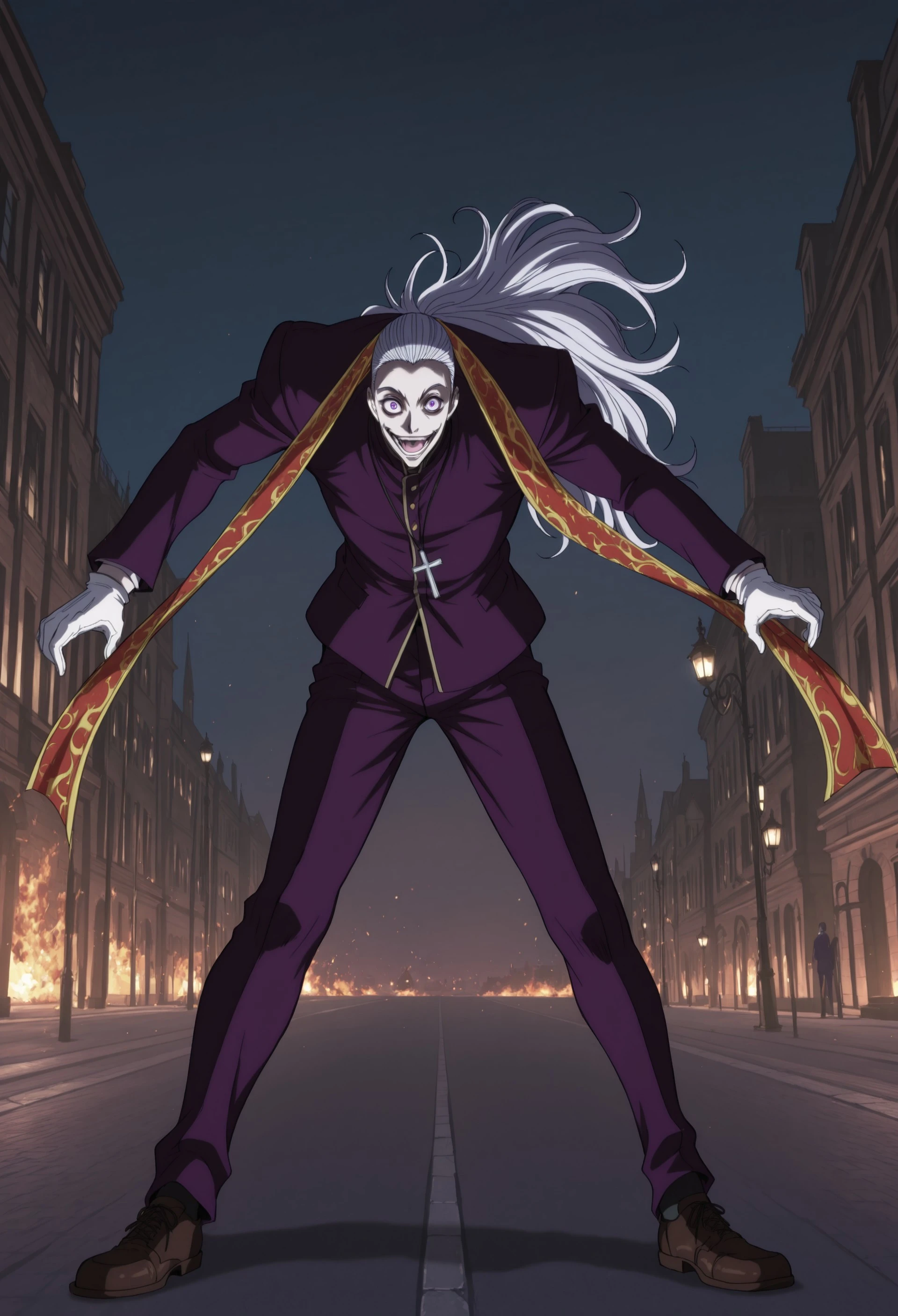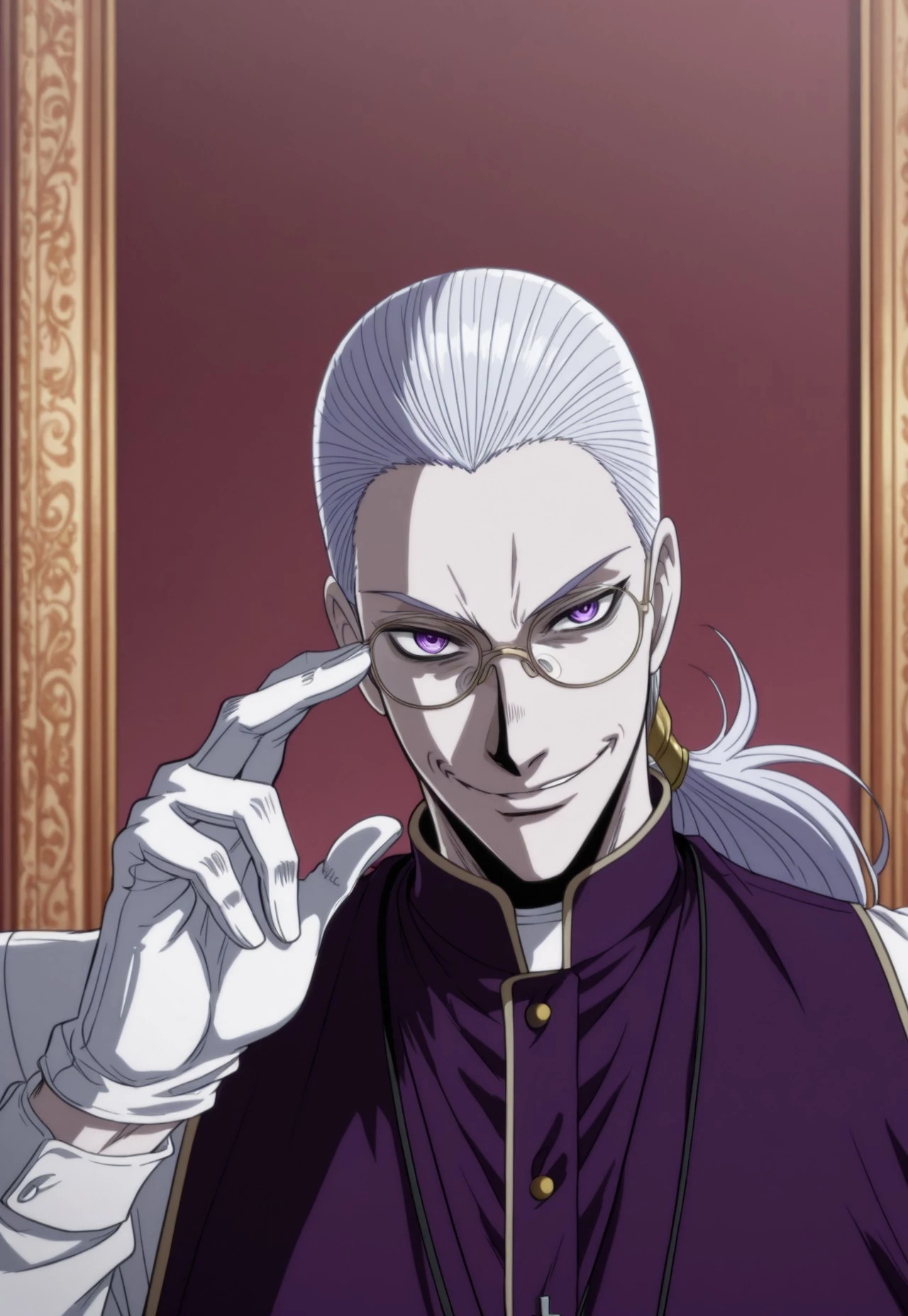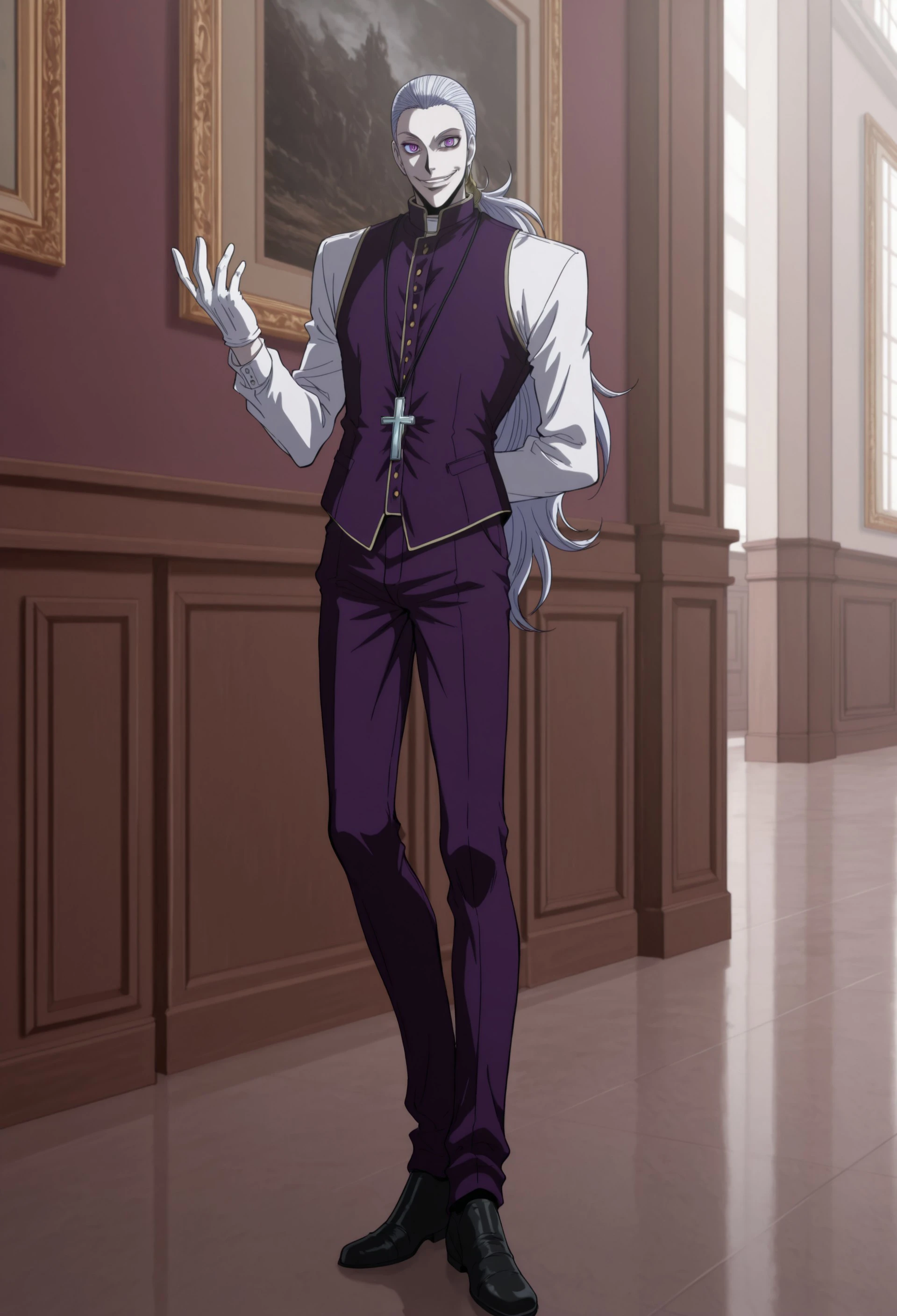 EnricoMaxwell, 1boy, white hair, very long hair, low ponytail, hair pulled back, purple eyes, pale skin,