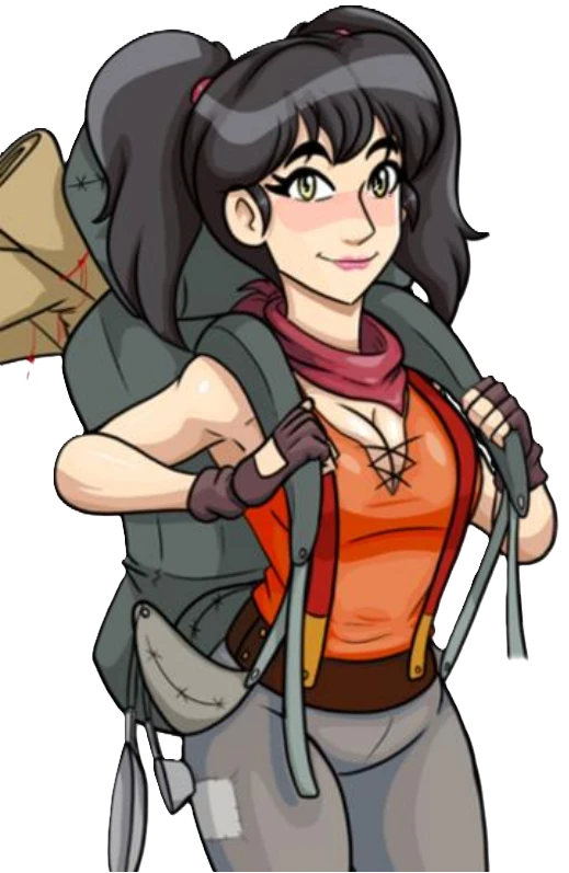 Maya, 1girl, solo, breasts, large breasts, cleavage, black long hair, twintails, yellow eyes, pink lipstick, orange marcelle t-shirt, grey pants, red scarf, suspenders, fingerless gloves, suspenders, camping bag