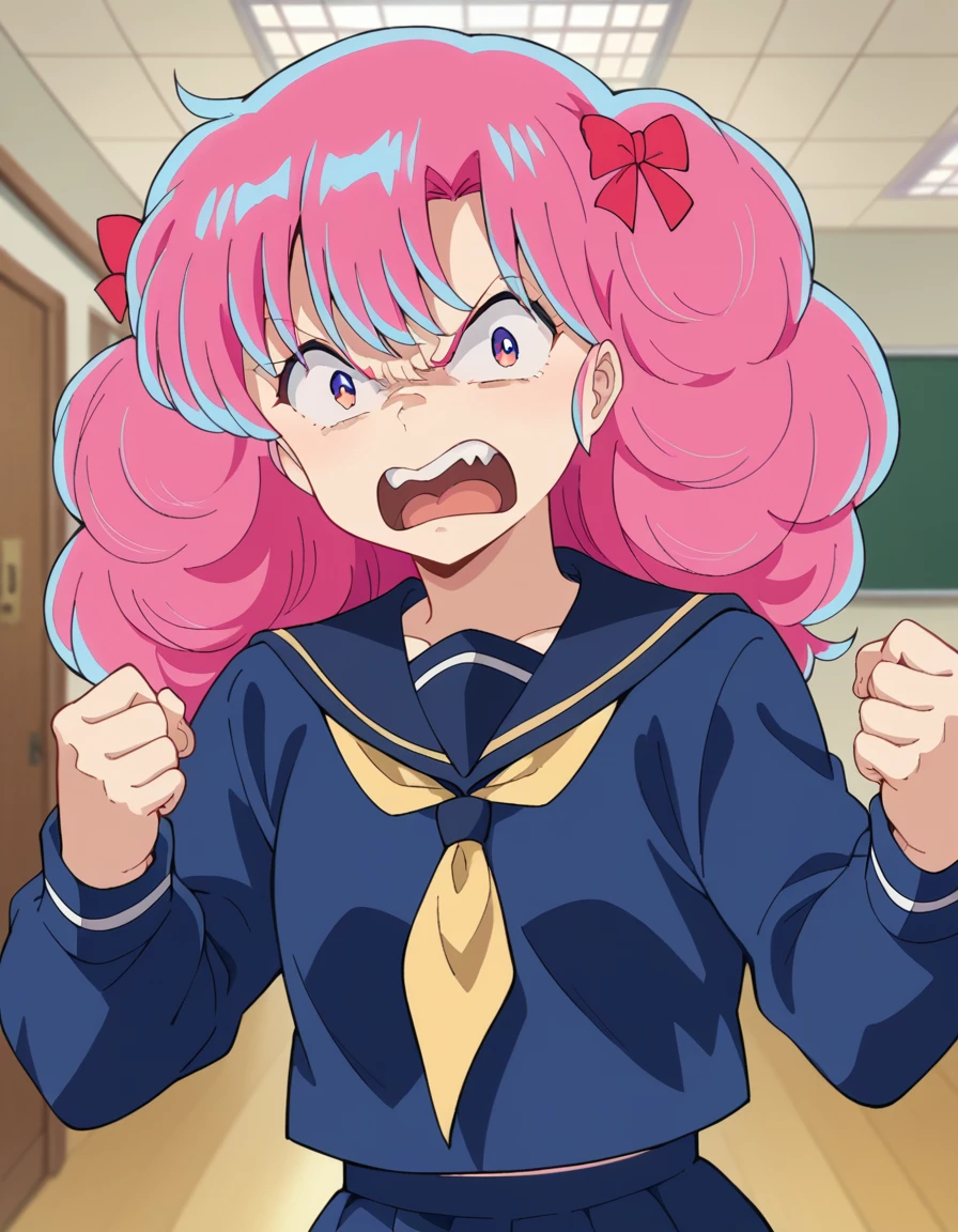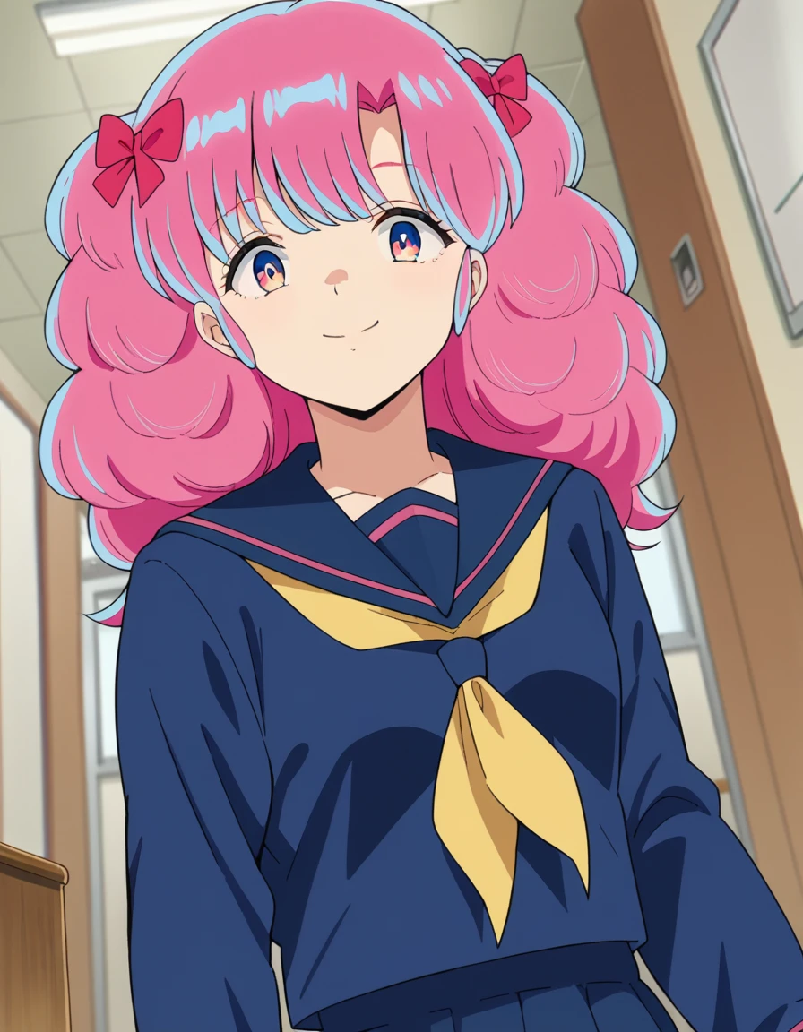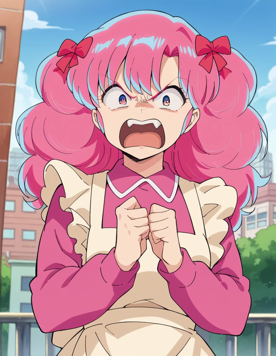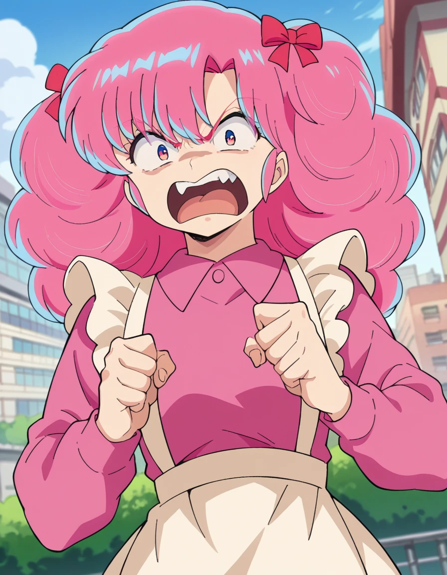 ran, long hair, bangs, pink hair, bow, hair bow, red bow, pink eyes,