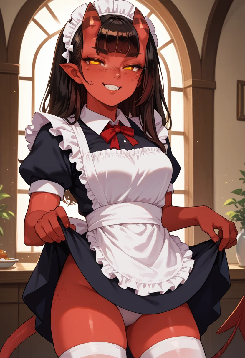 Trigger: wrnchmeru, yellow eyes, pointy ears, colored skin, red skin, demon girl, oni horns, skin-covered horns, mole under eye, freckles, body freckles, medium breasts