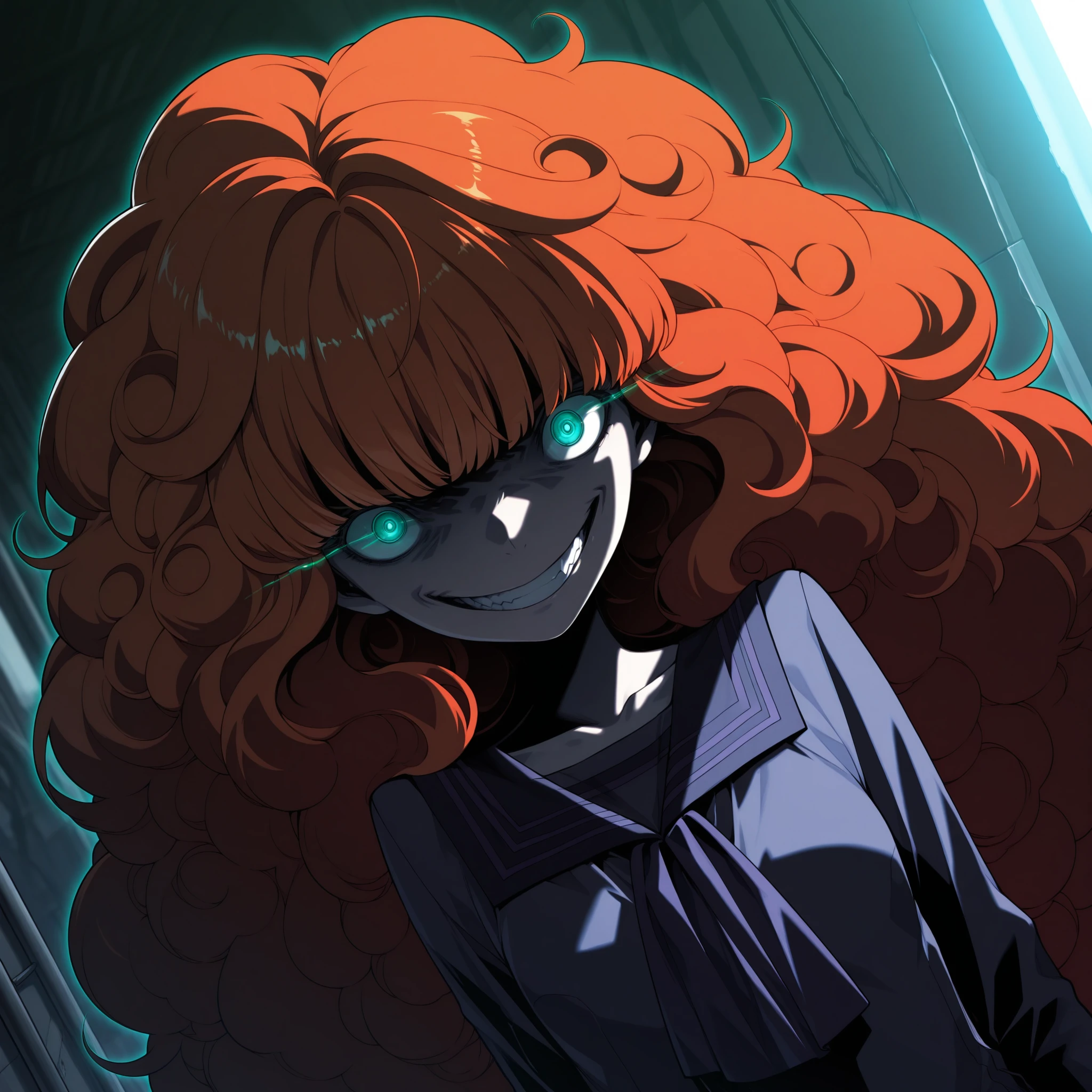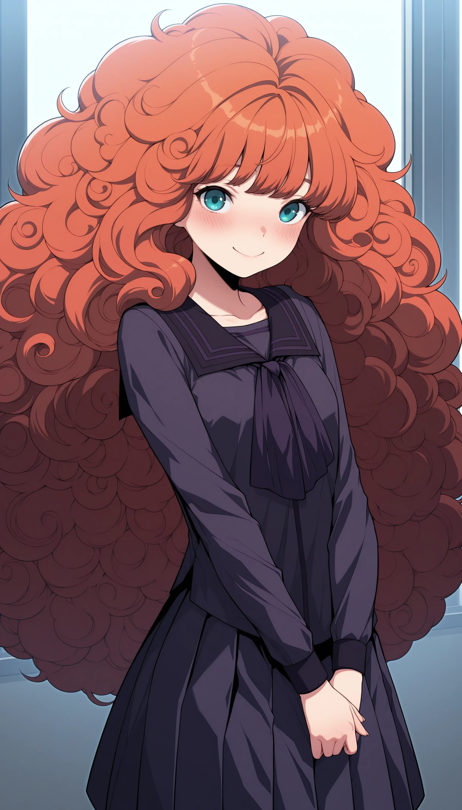 b4rb, 1girl, aqua eyes, orange hair, big hair, curly hair, long hair, school uniform, serafuku, skirt