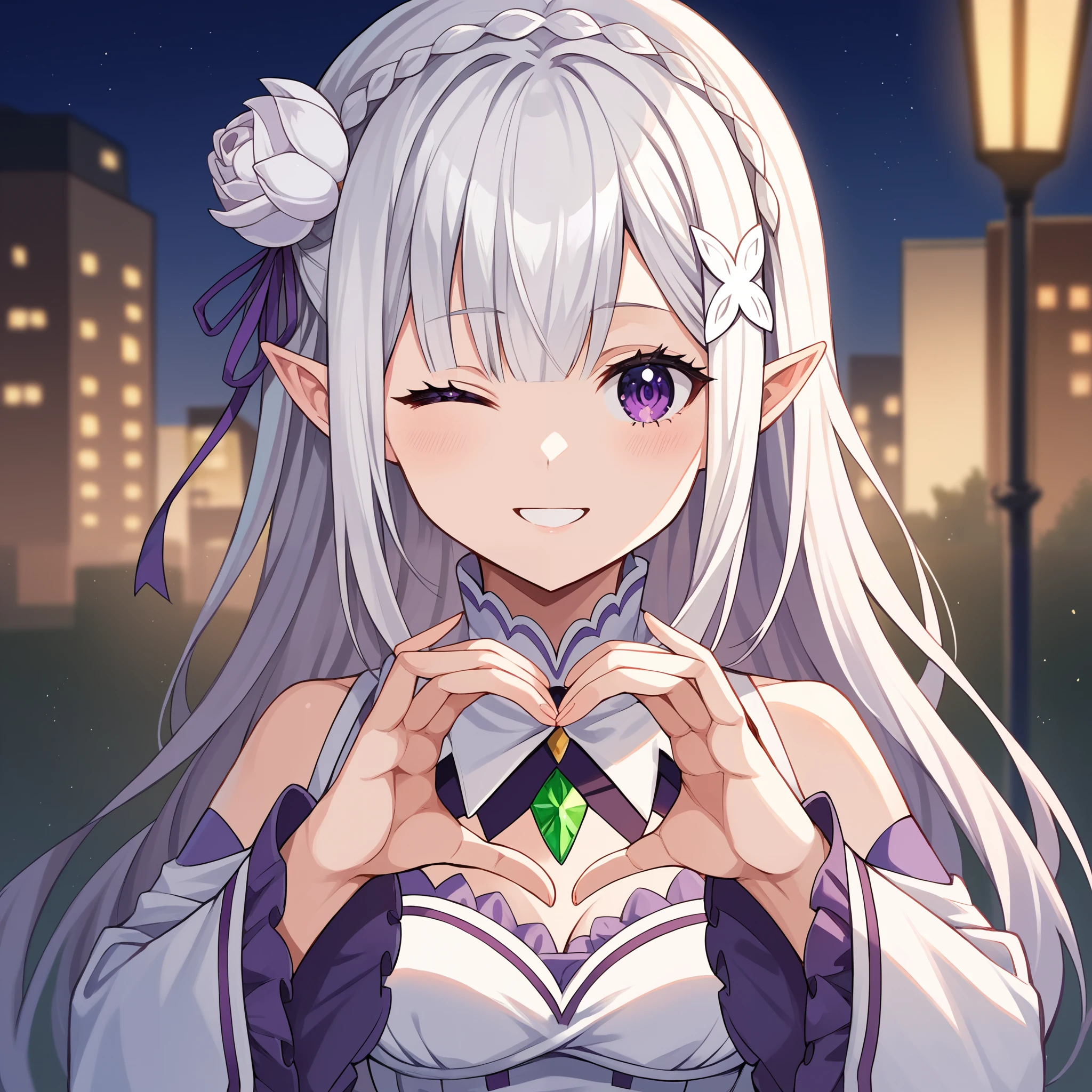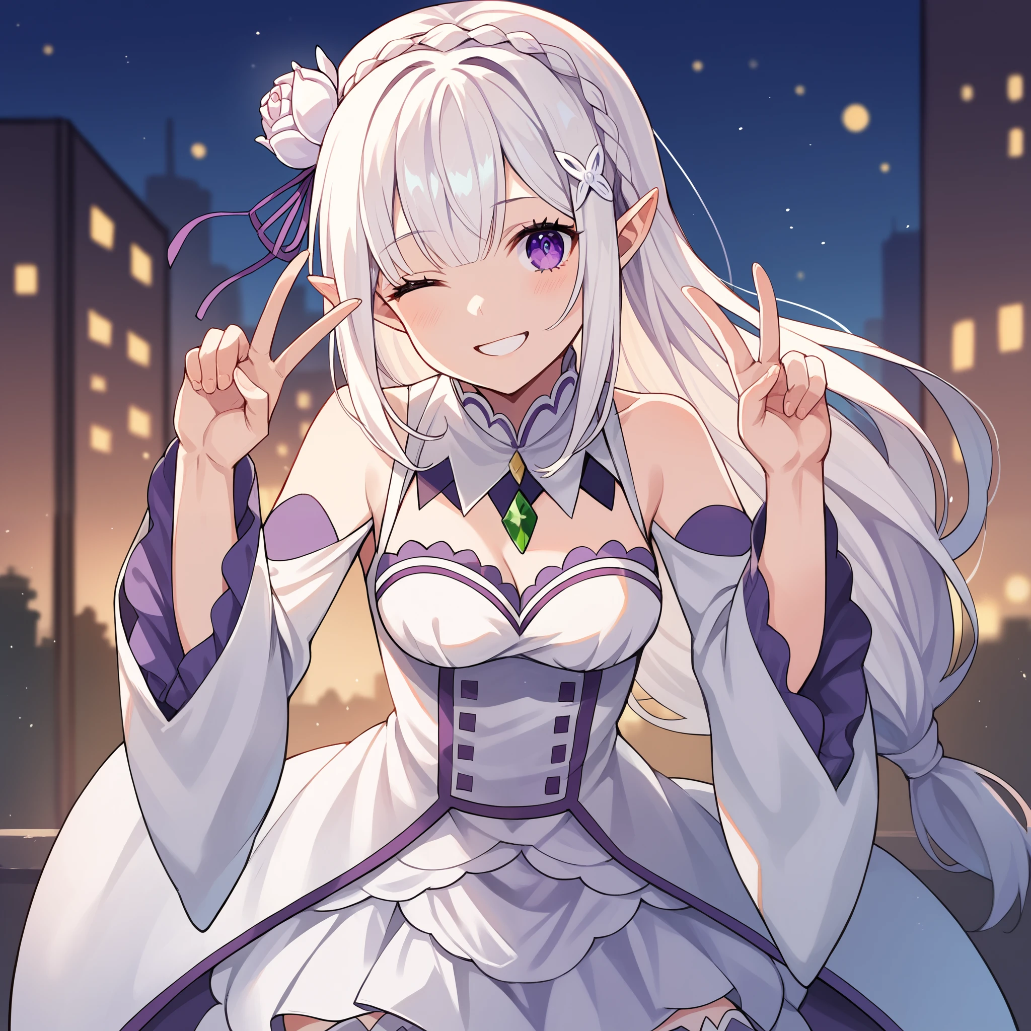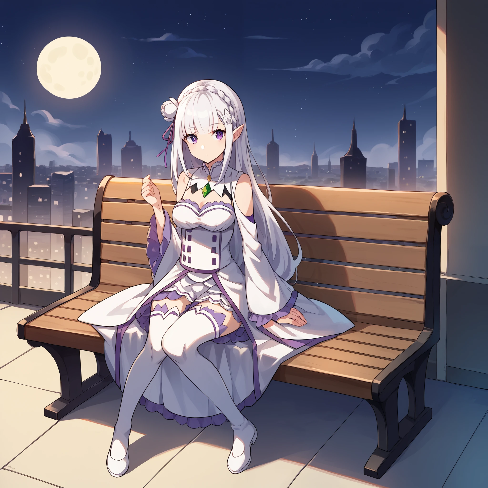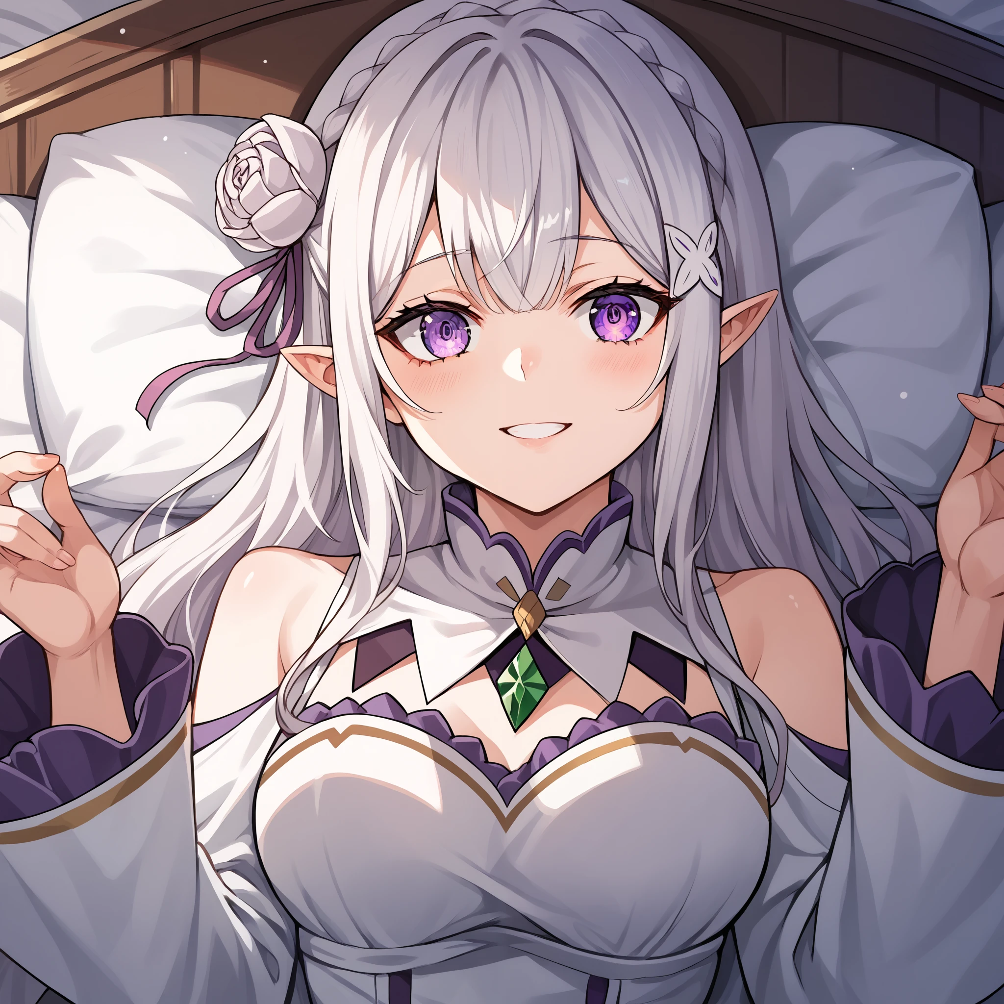 Default : emiliadef, purple eyes, pointy ears, white hair, long hair, x hair ornament, hair flower, crown braid, hair ribbon, bare shoulders, detached sleeves, detached collar, frilled sleeves, long sleeves, wide sleeves, green gemstone, white dress, white skirt, pleated skirt, white thighhighs,Description