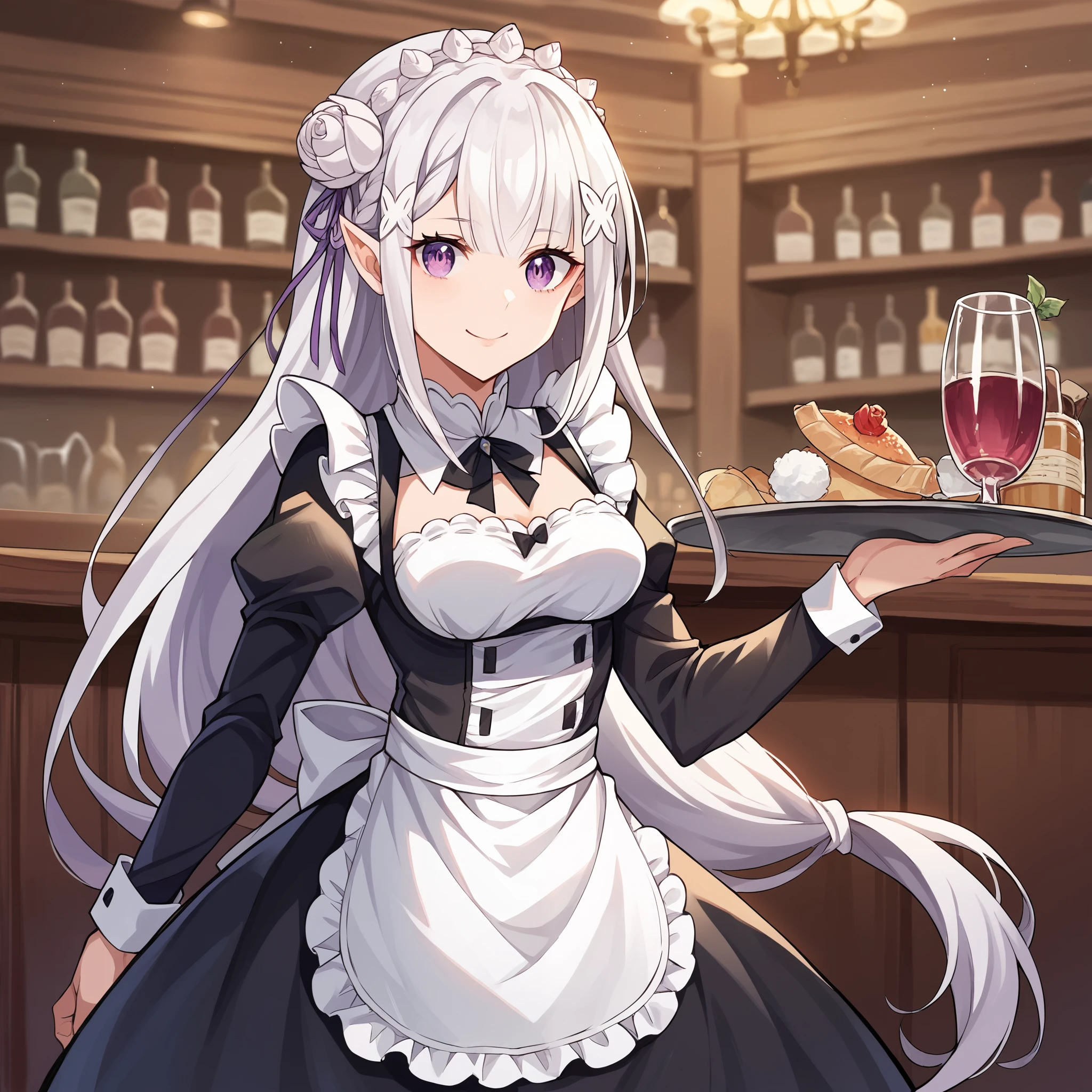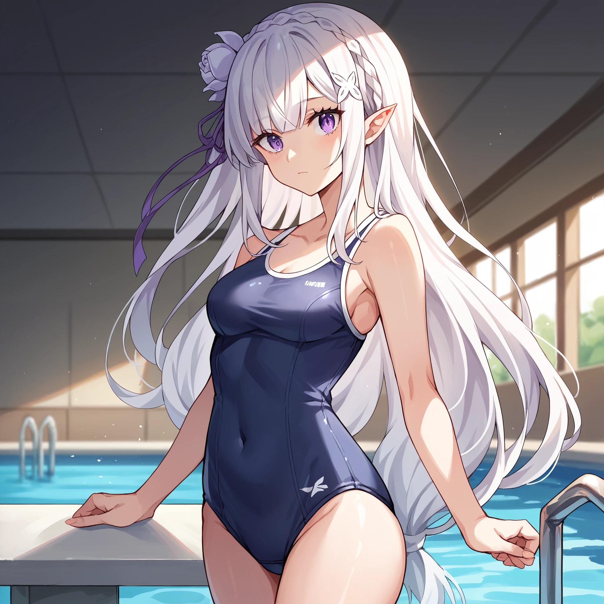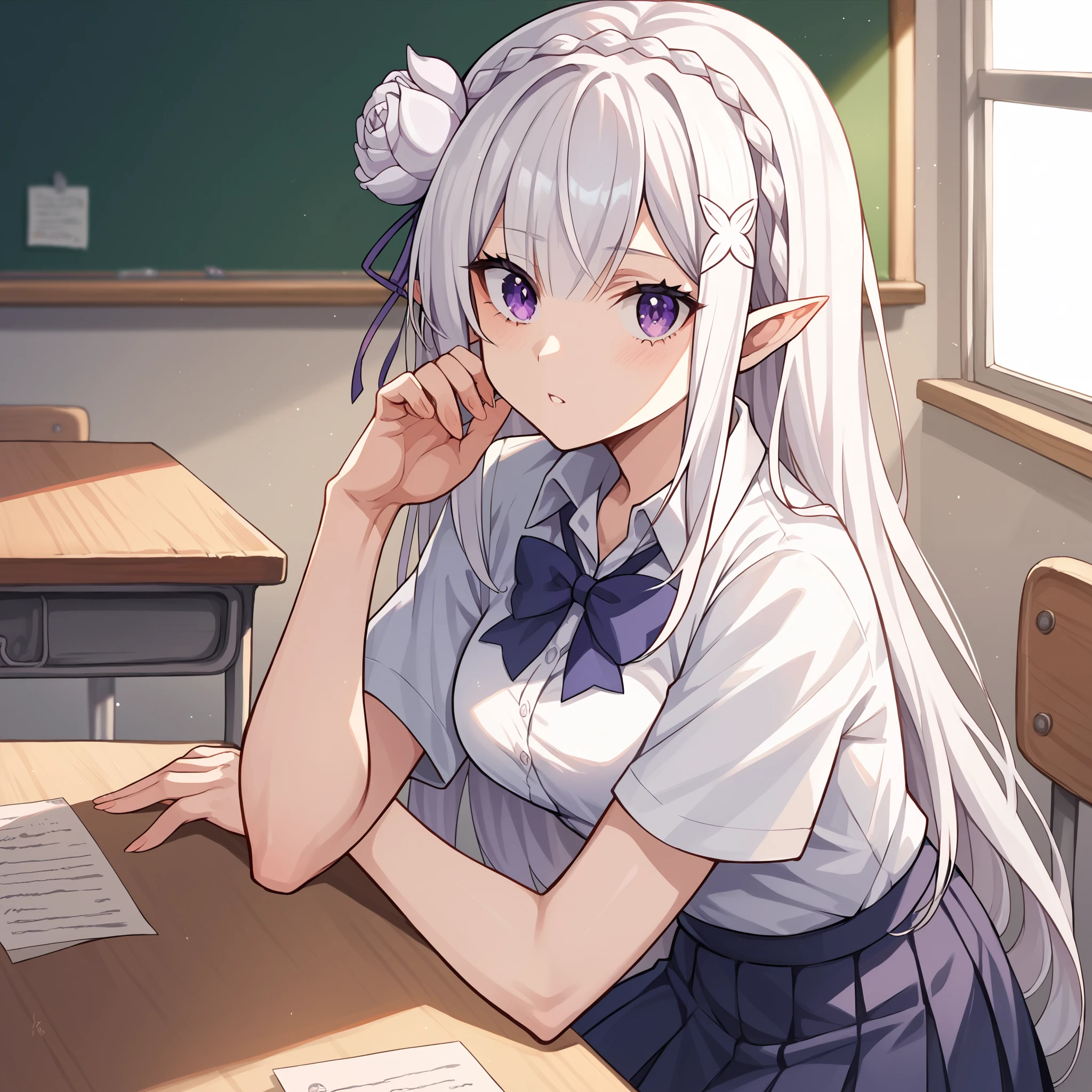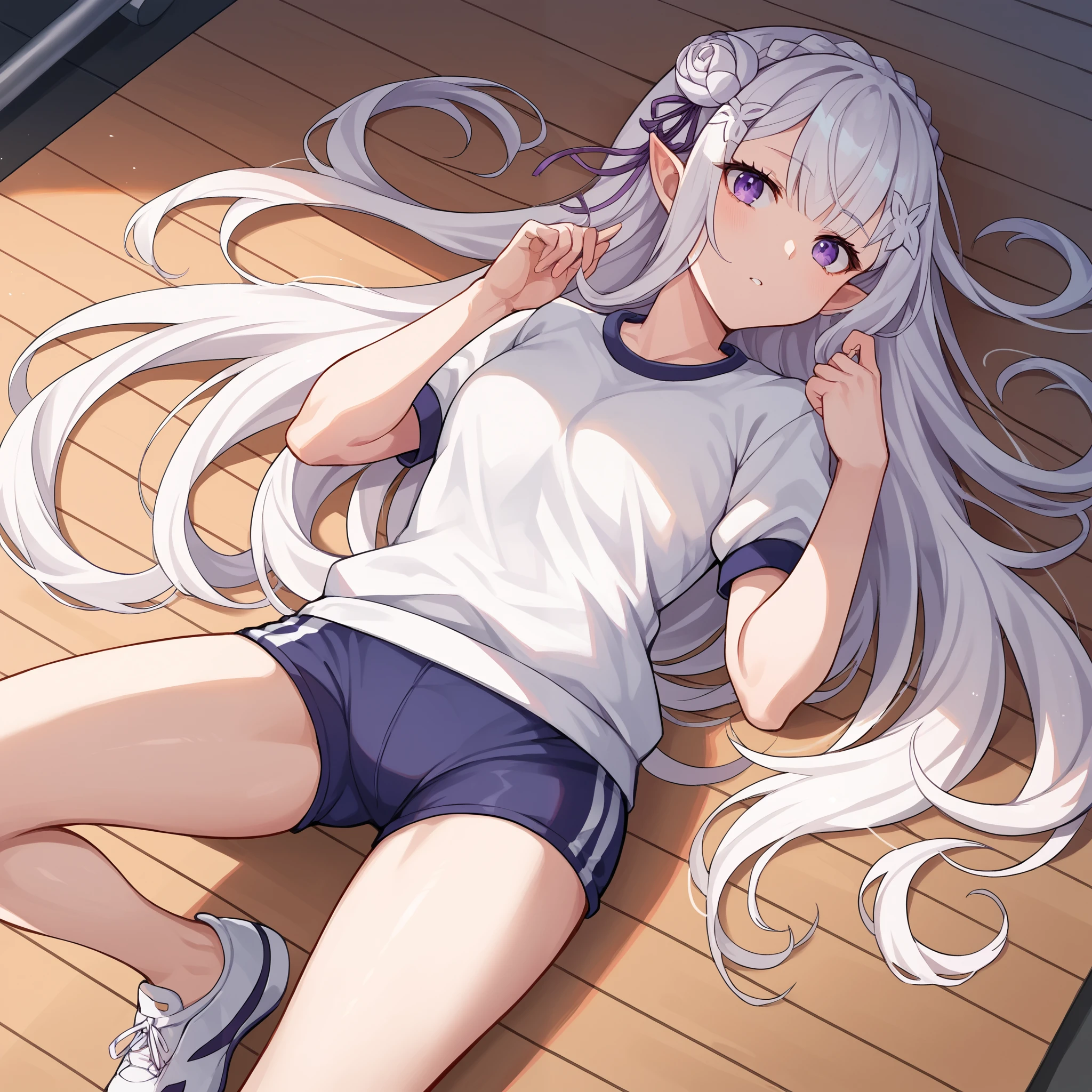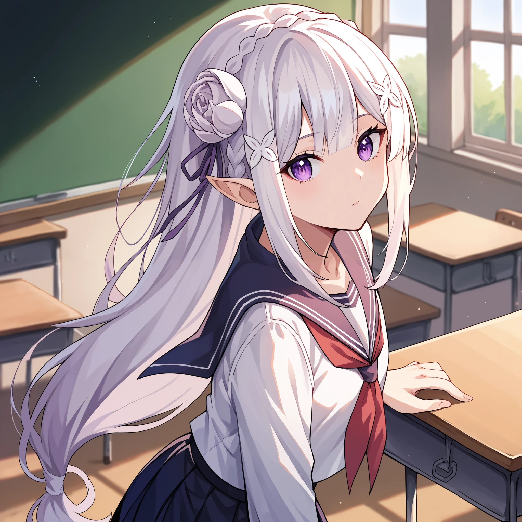 Default : emiliadef, purple eyes, pointy ears, white hair, long hair, x hair ornament, hair flower, crown braid, hair ribbon, bare shoulders, detached sleeves, detached collar, frilled sleeves, long sleeves, wide sleeves, green gemstone, white dress, white skirt, pleated skirt, white thighhighs,Description