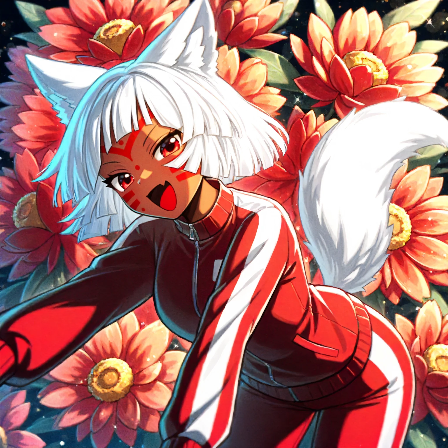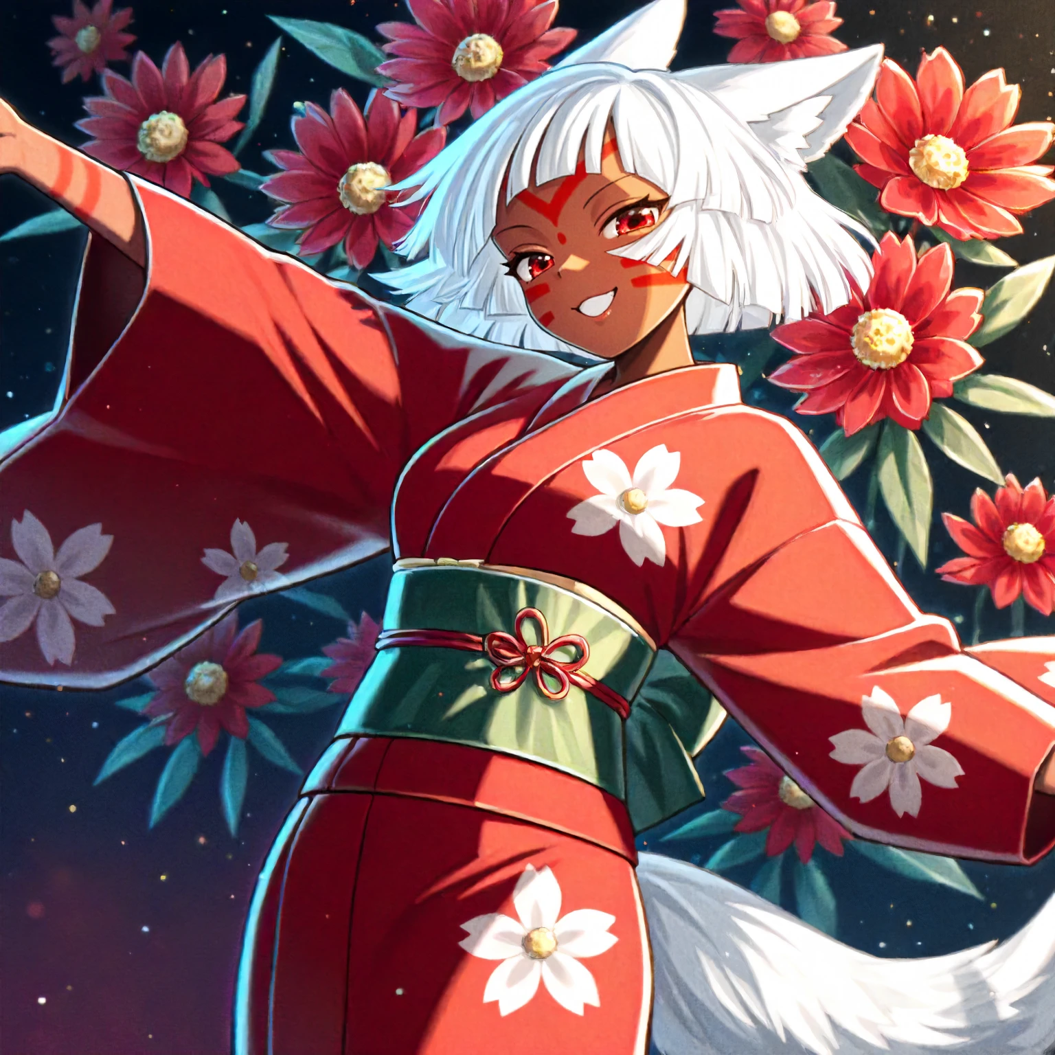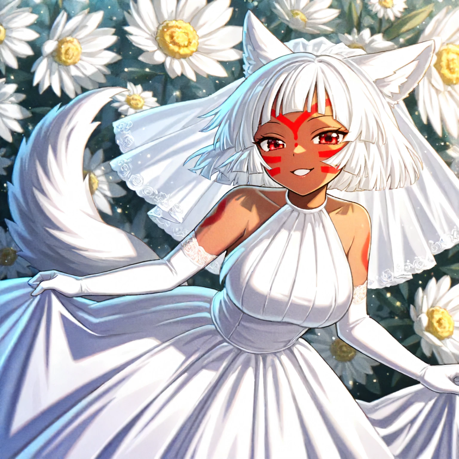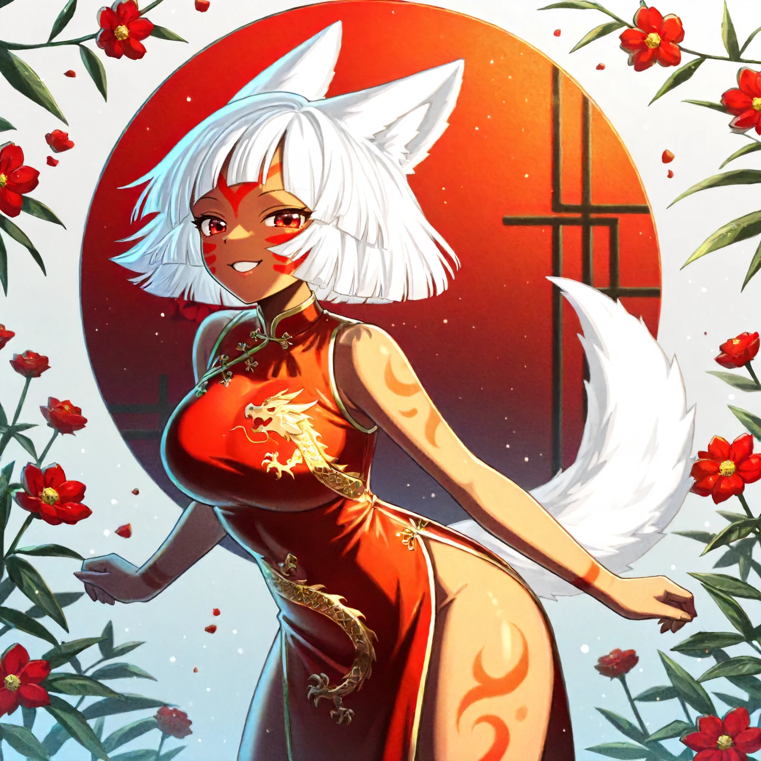 anime coloring, u_ria\(demigoddess\),1girl,white hair,wolf ears,short hair,red eyes,face paint,dark-skinned female,