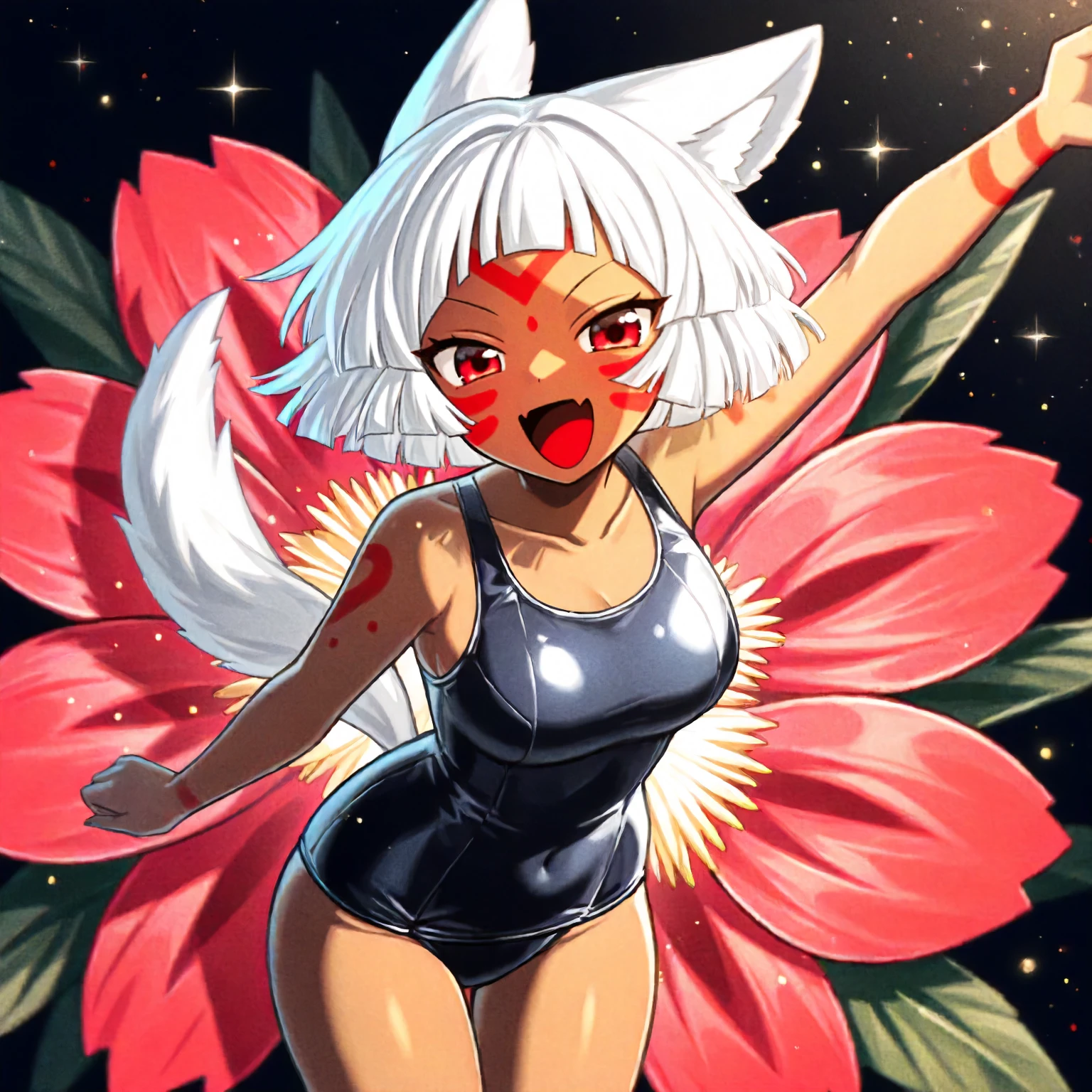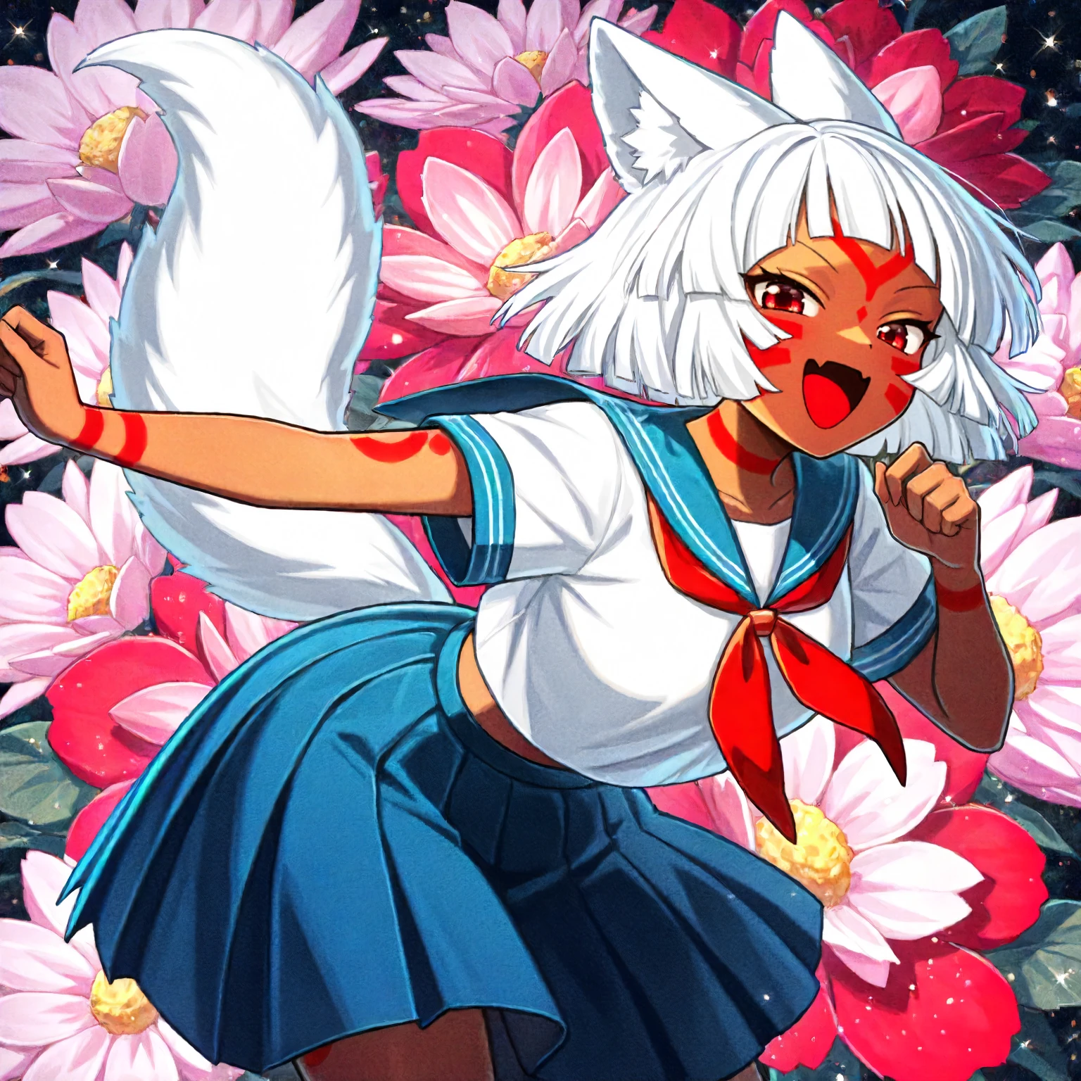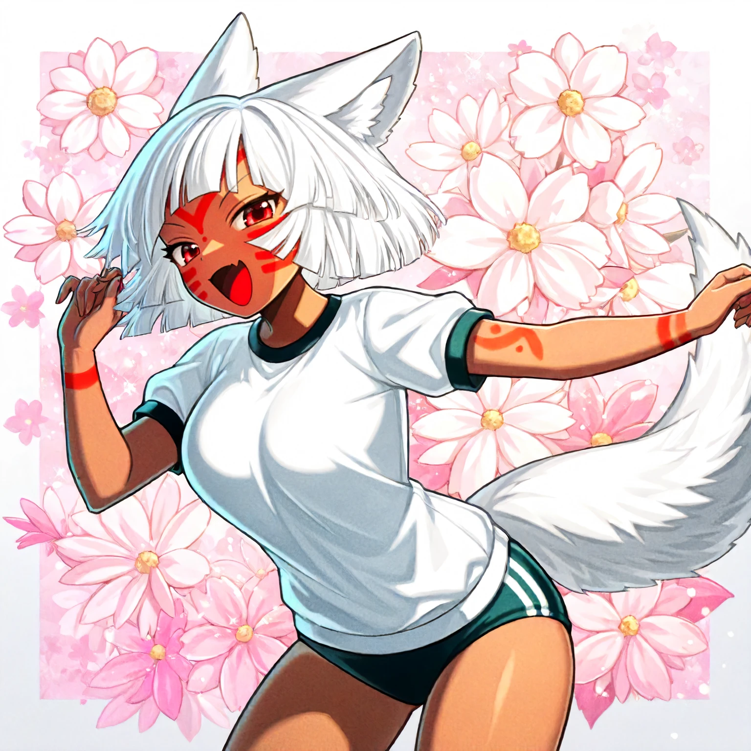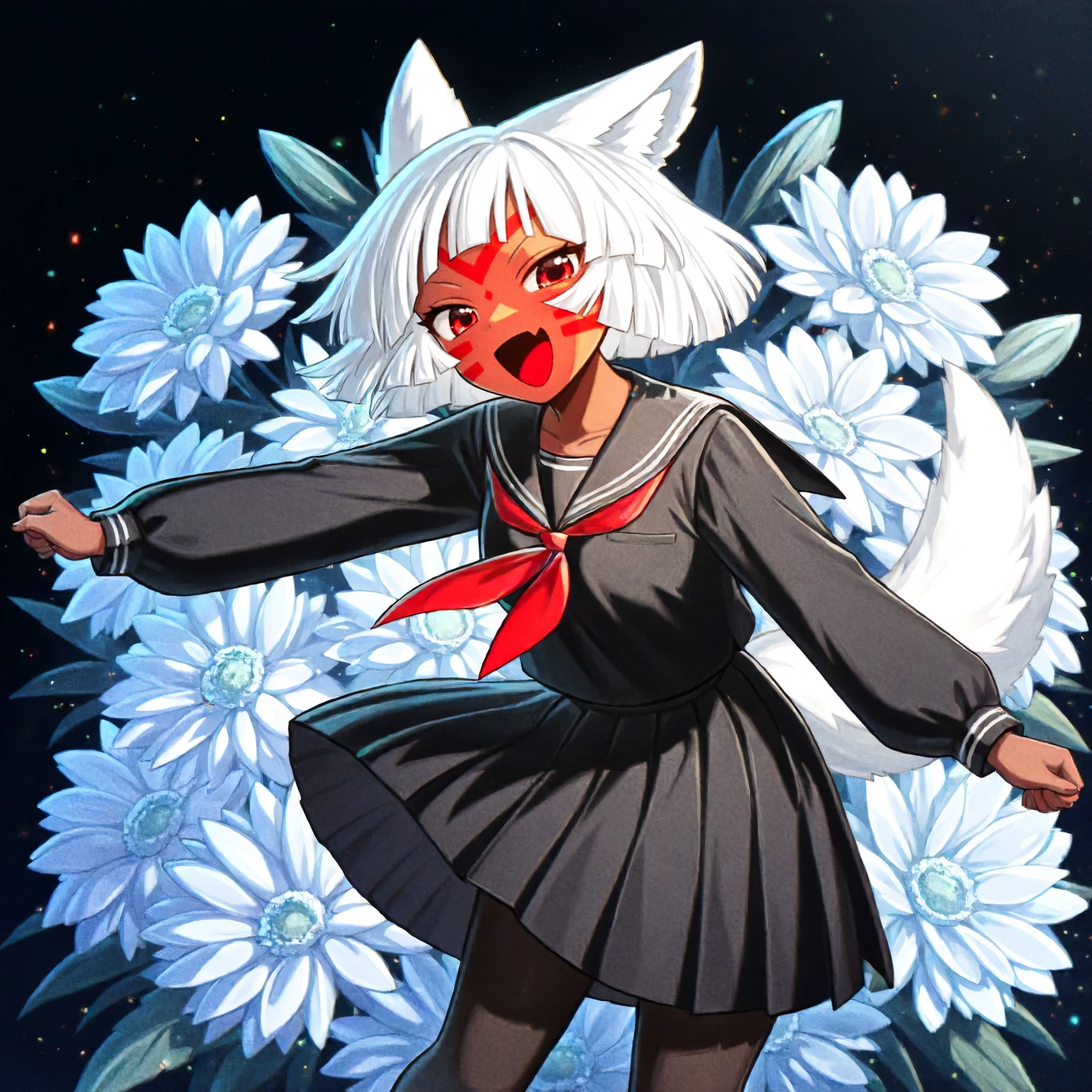 anime coloring, u_ria\(demigoddess\),1girl,white hair,wolf ears,short hair,red eyes,face paint,dark-skinned female,