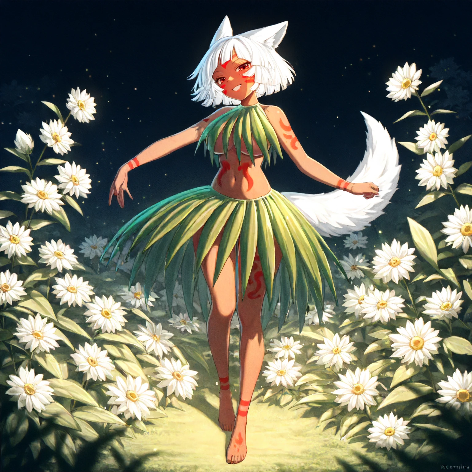 body paint,wolf tail, leaf crop_top,sleeveless,underboob, leaf skirt,
