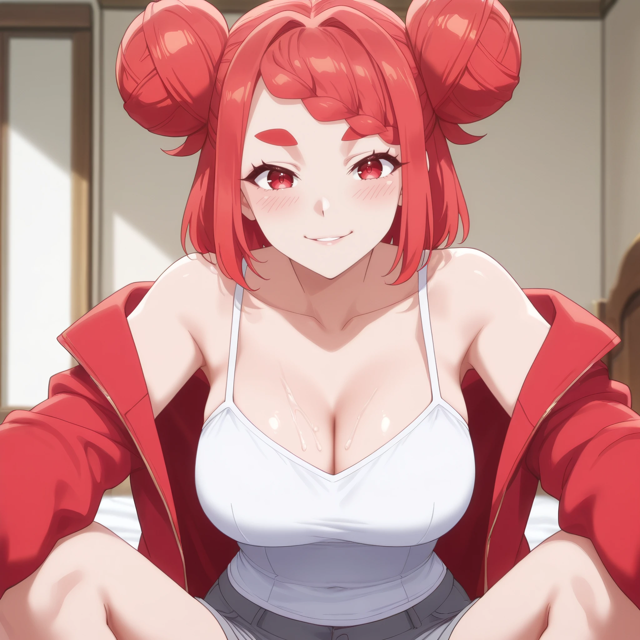 MonicaBolst, red eyes, thick eyebrows, red hair, short hair, hair bun, double bun, braided bangs,