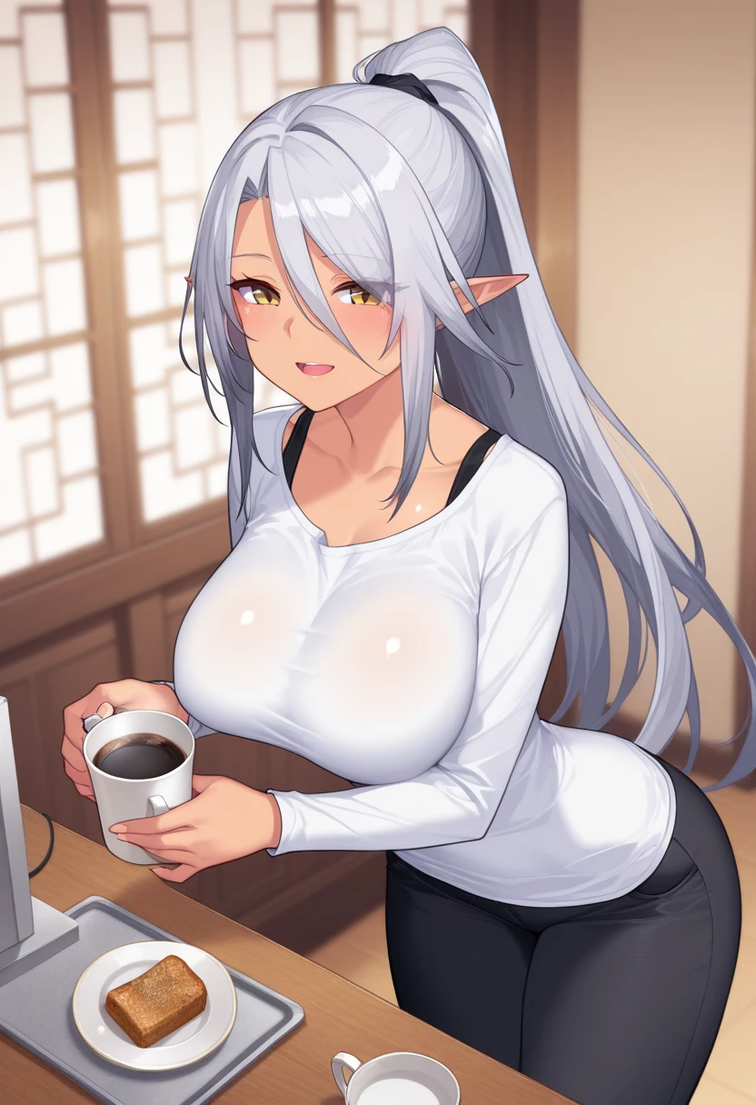 sophiaBGR, grey hair, long hair, ponytail, pointy ears, yellow eyes, large breasts