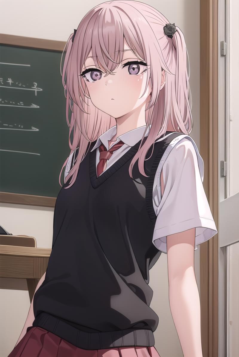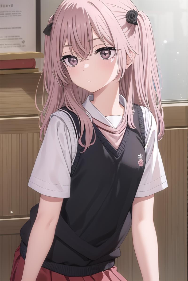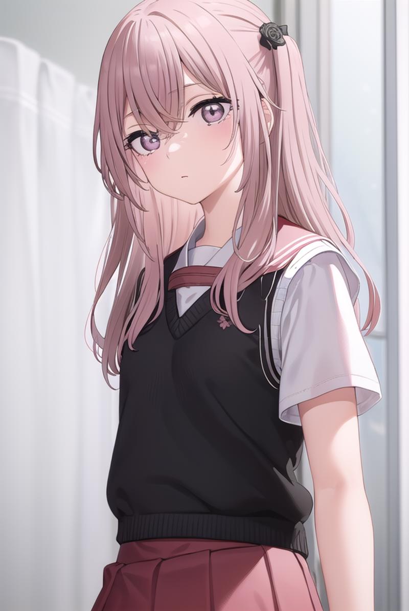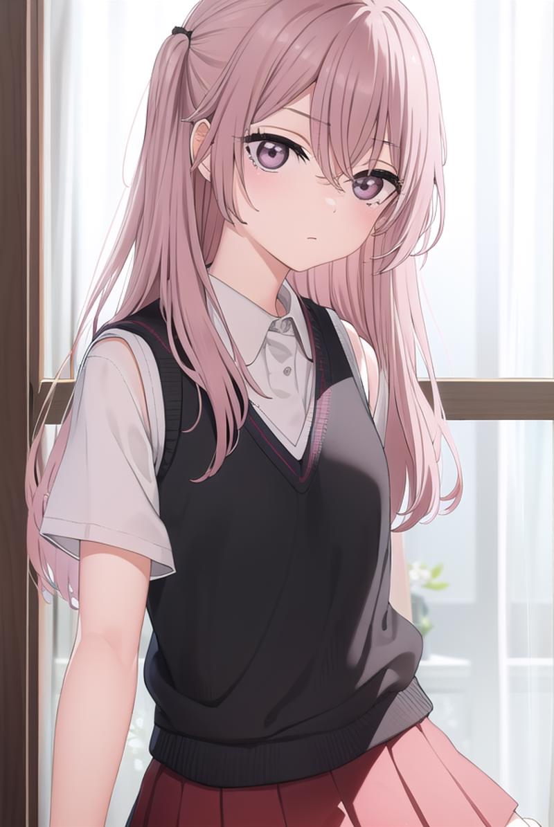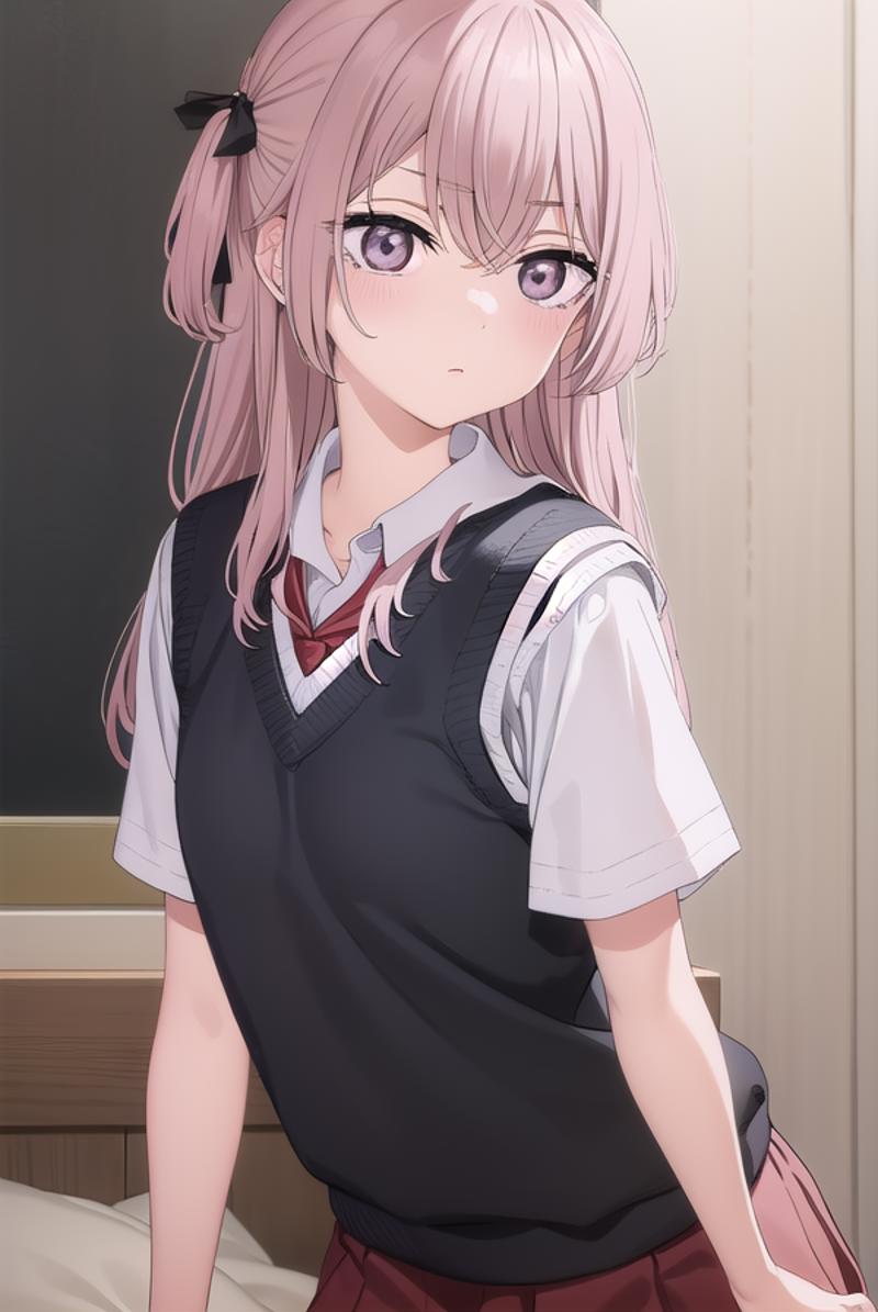 shirt, bow, school uniform, white shirt, short sleeves, serafuku, sailor collar, yellow bow, red sailor collar, (red skirt:1.5), sweater vest, (black sweater vest:1.5),