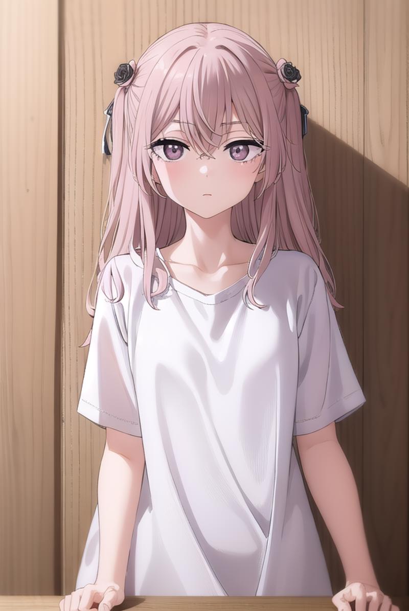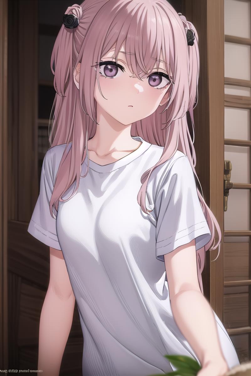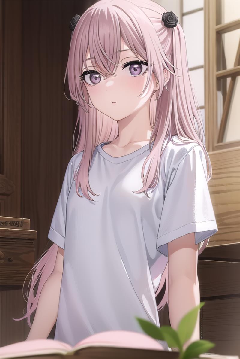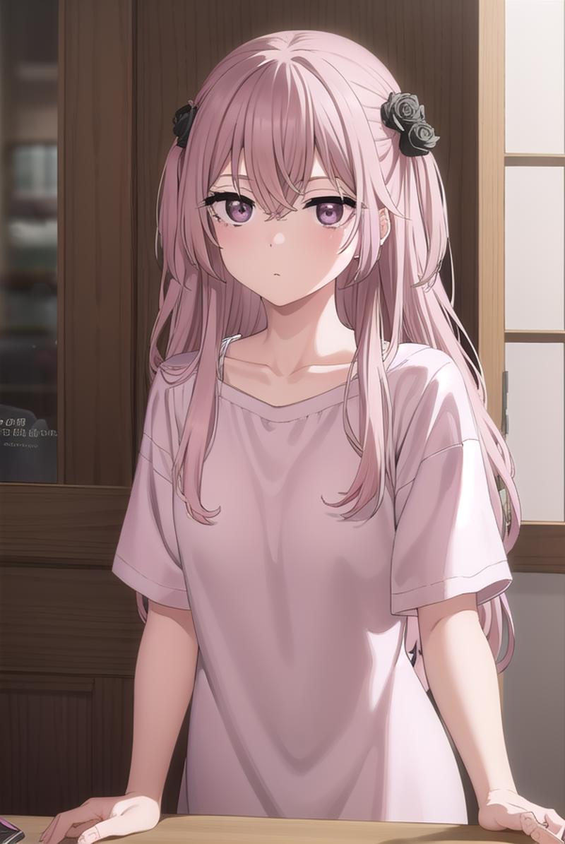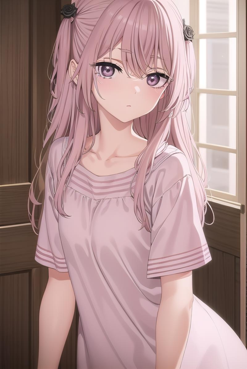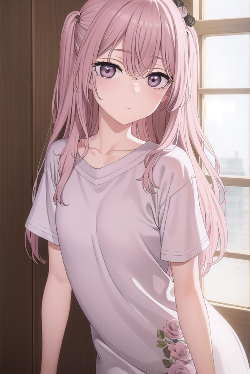 sajuna inui, long hair, bangs, hair ornament, hair between eyes, pink hair, hair flower, (pink eyes:1.5), two side up, crossed bangs, black flower, black rose,