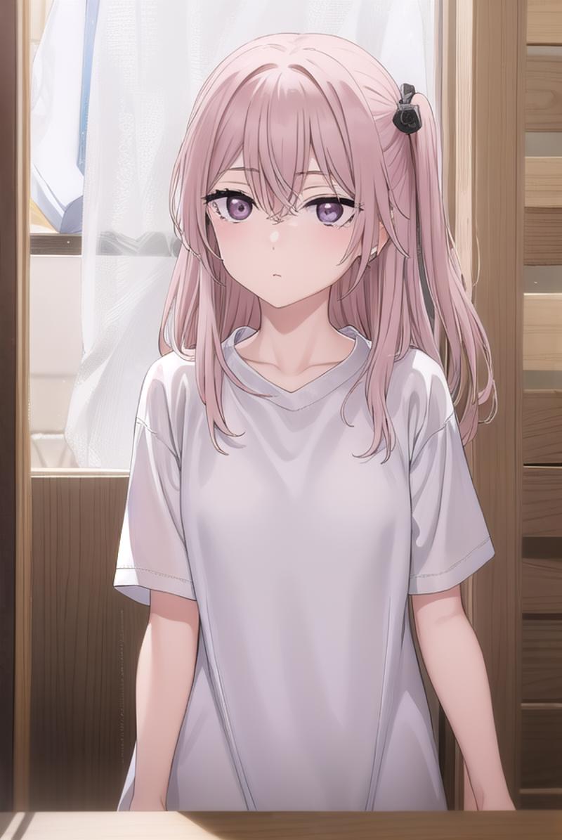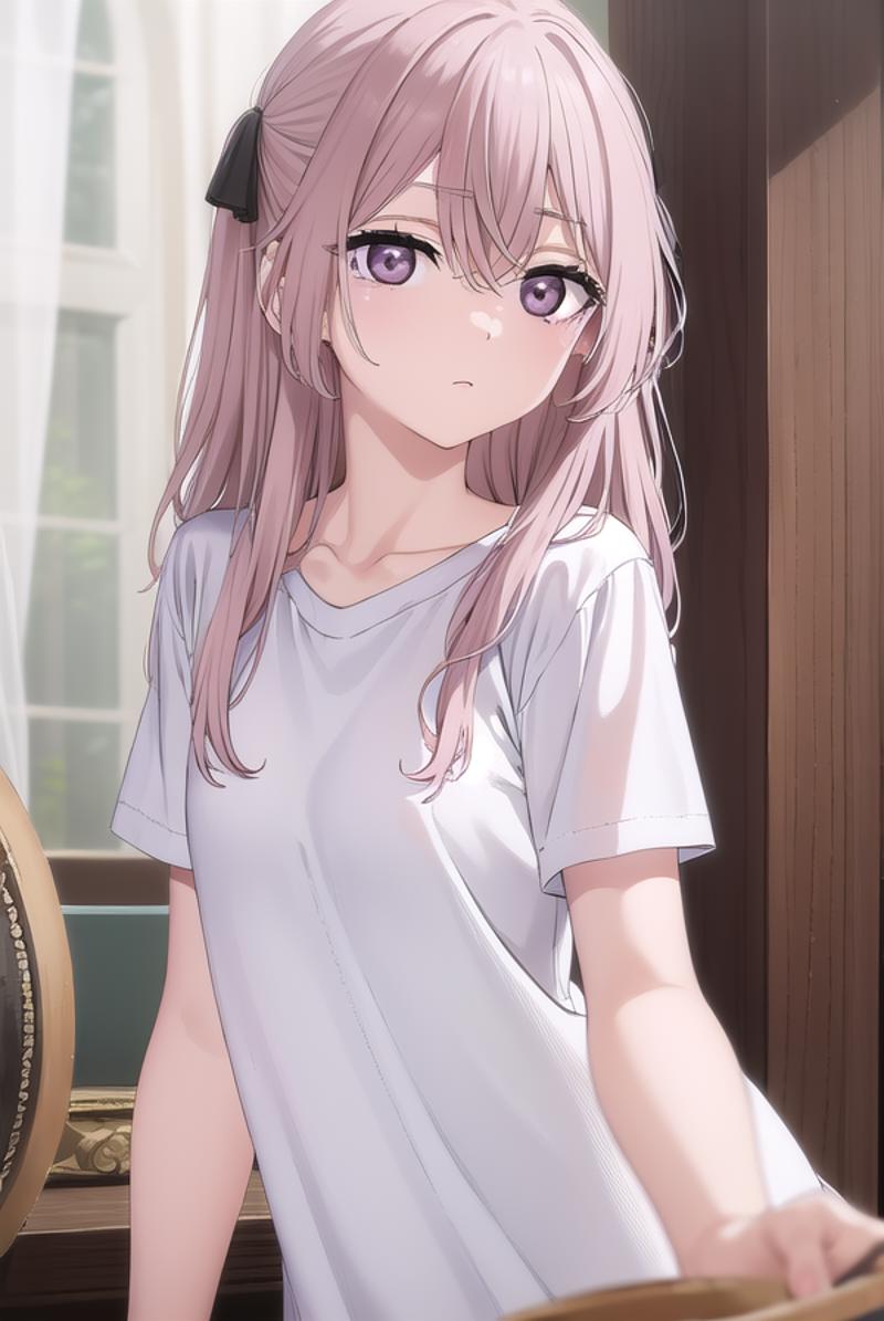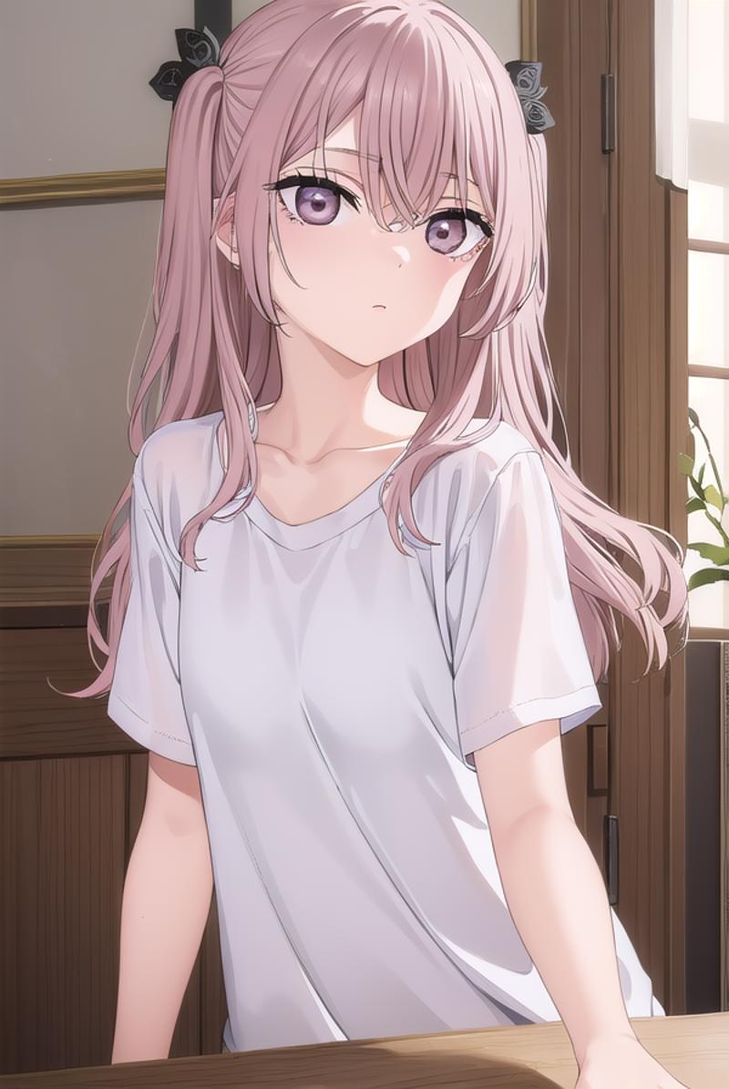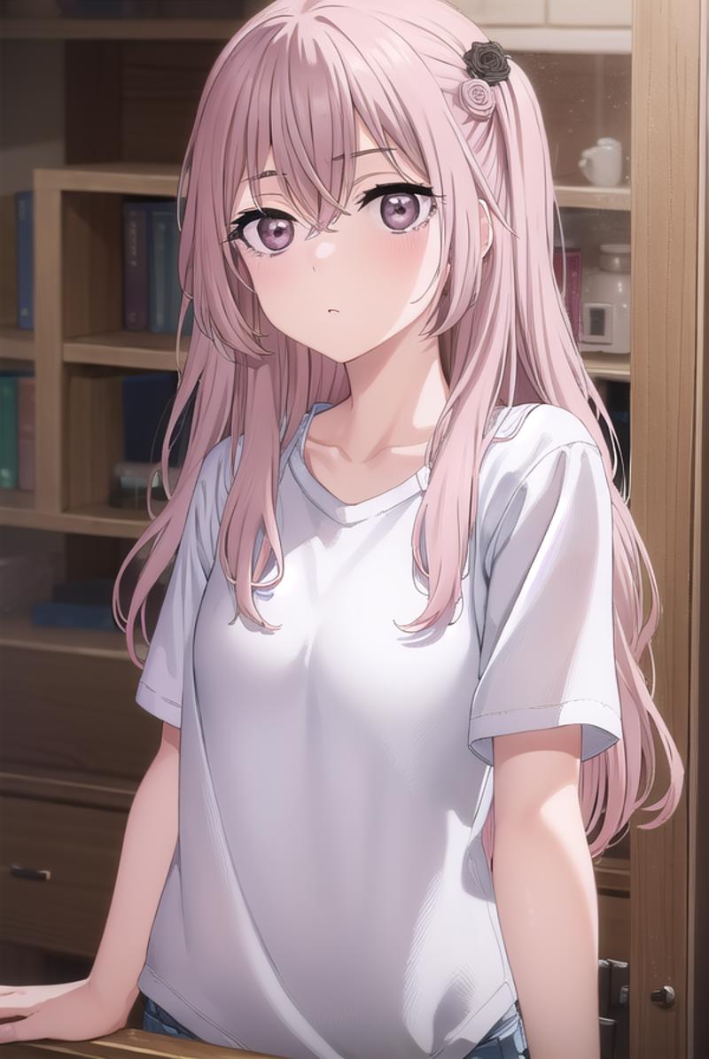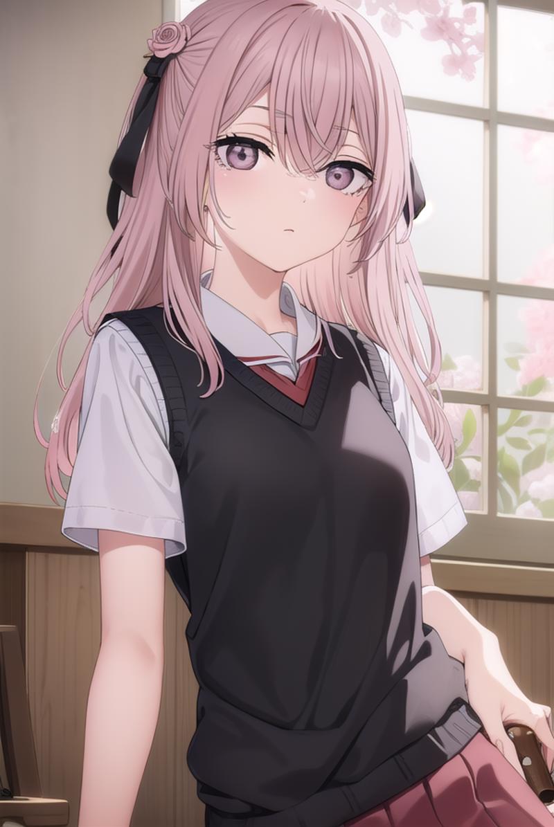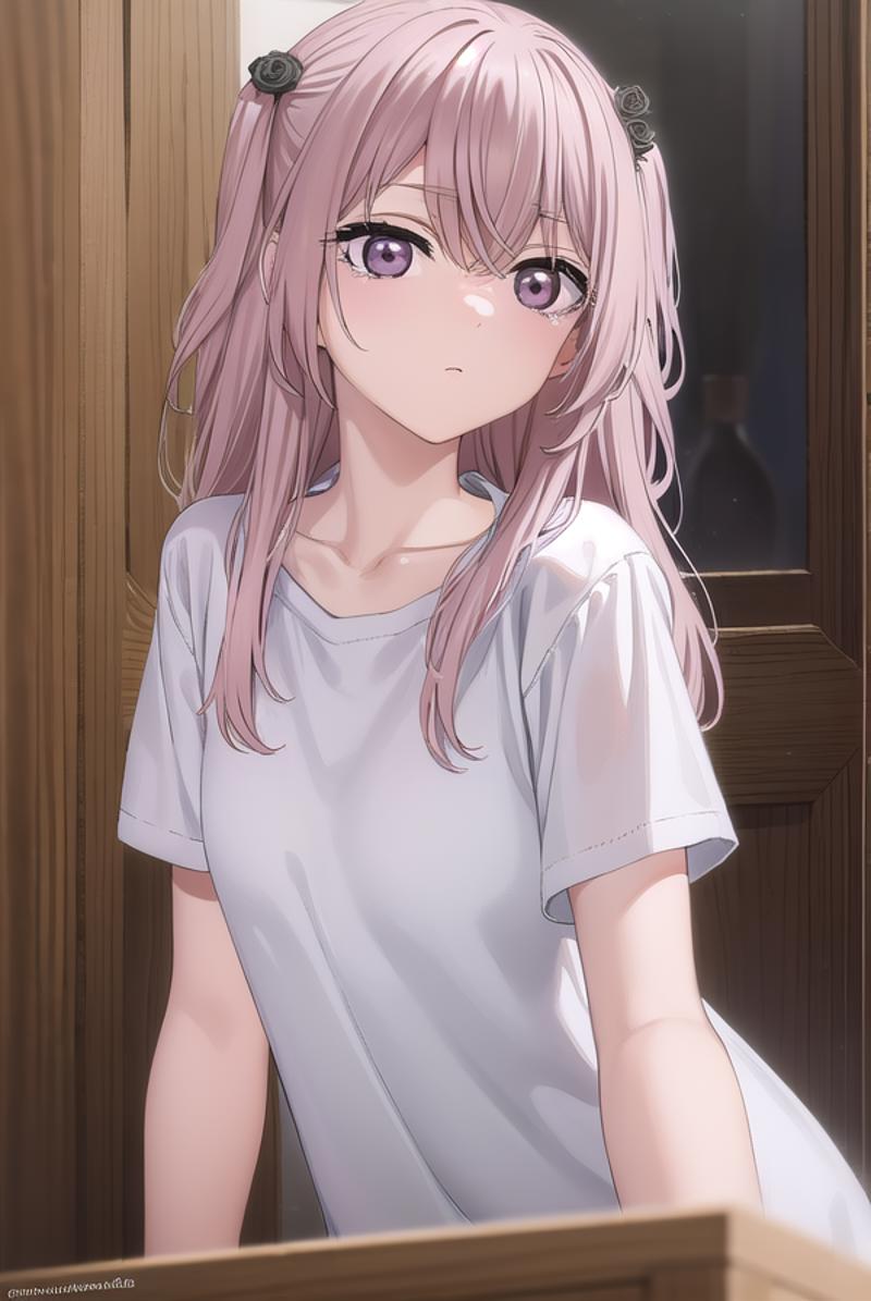 sajuna inui, long hair, bangs, hair ornament, hair between eyes, pink hair, hair flower, (pink eyes:1.5), two side up, crossed bangs, black flower, black rose,