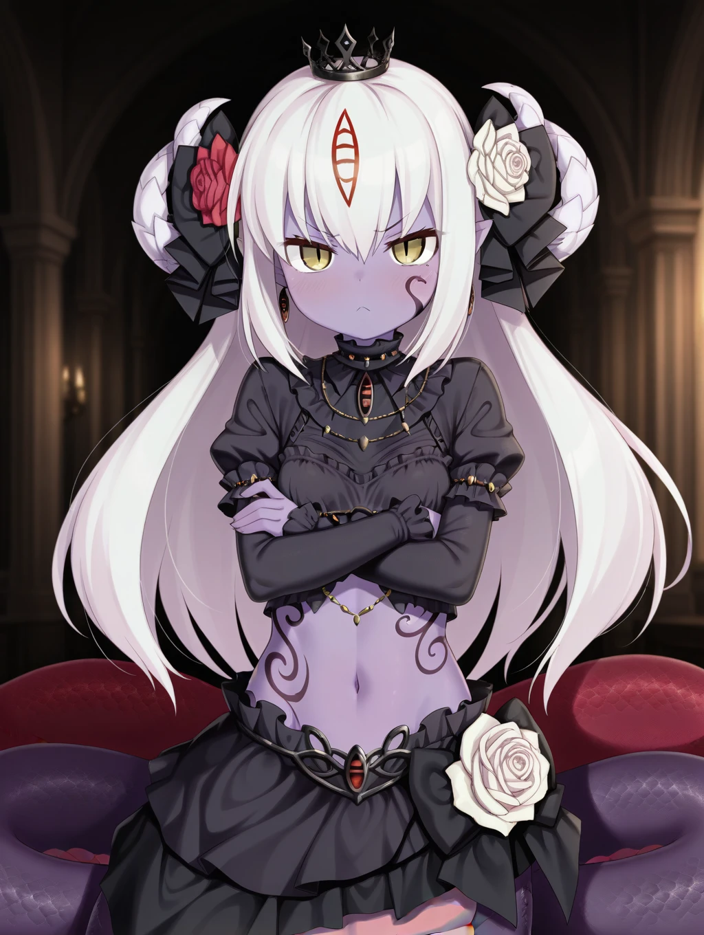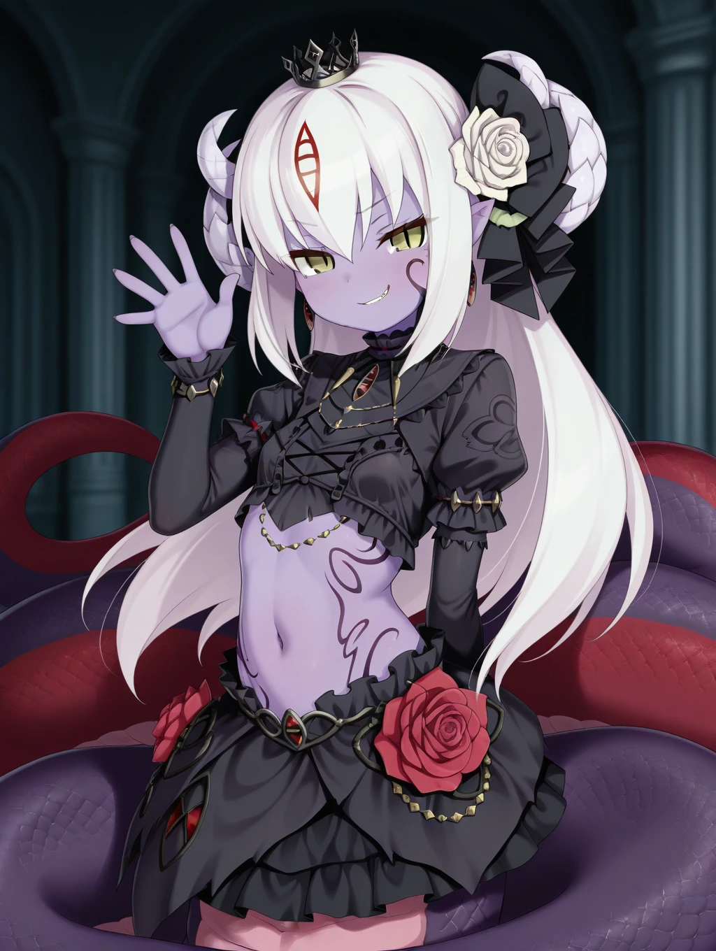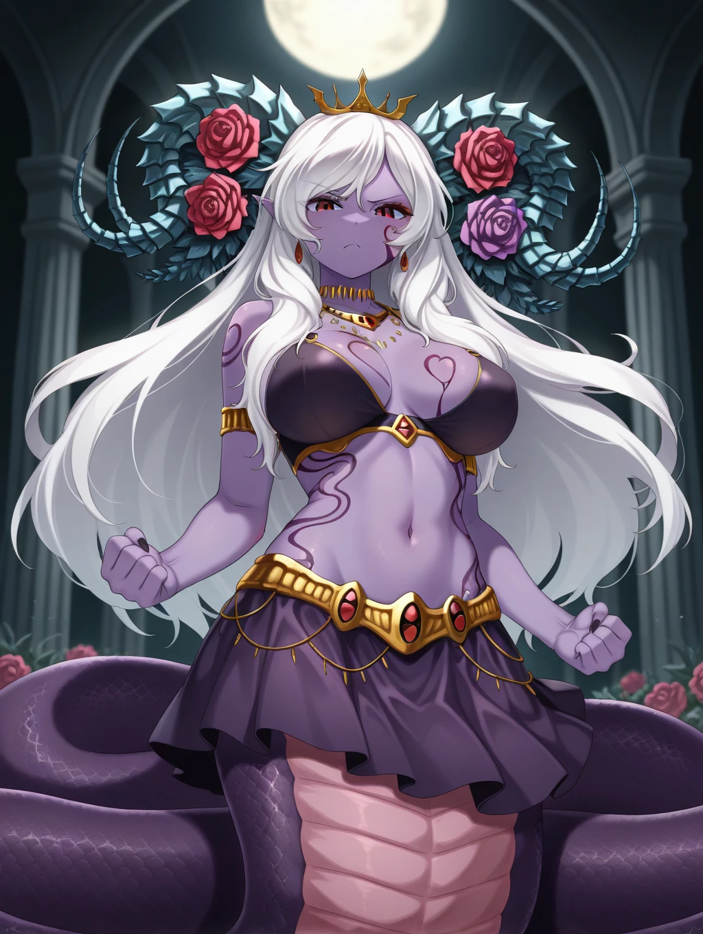 Alice_I, white hair, long hair, lamia, yellow eyes, monster girl, snake girl, purple tattoos, pointy ears, horns, colored skin, purple skin, slit pupils, (scales), face tattoo, jewelry, hair ornament, red flower, white rose, earrings, crown, midriff, (black shirt), skirt,