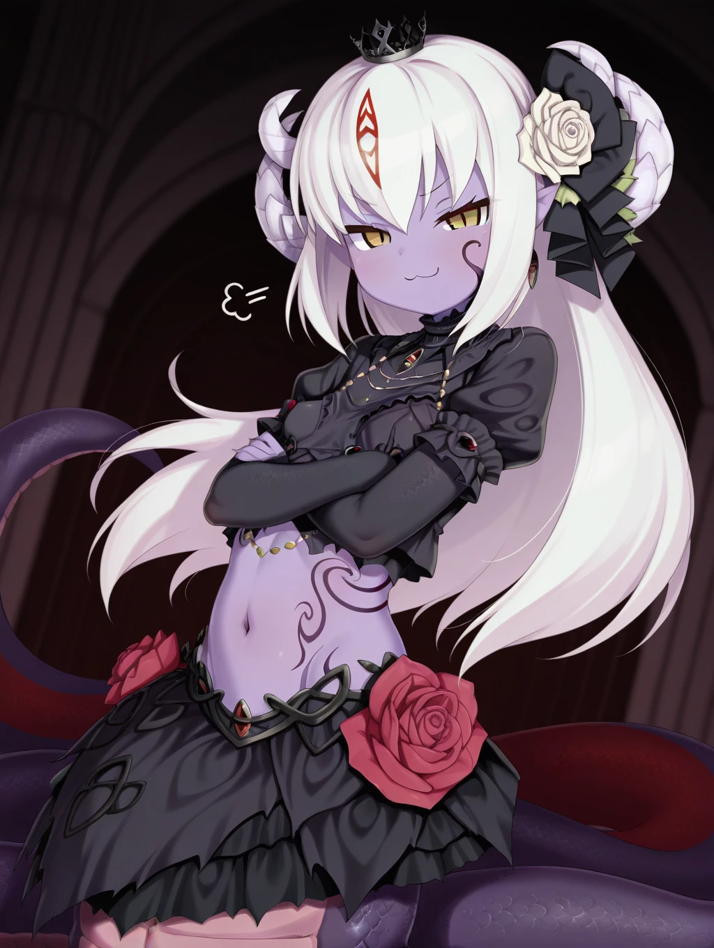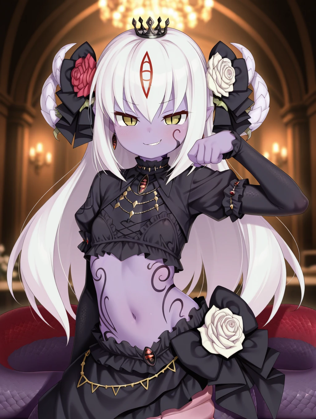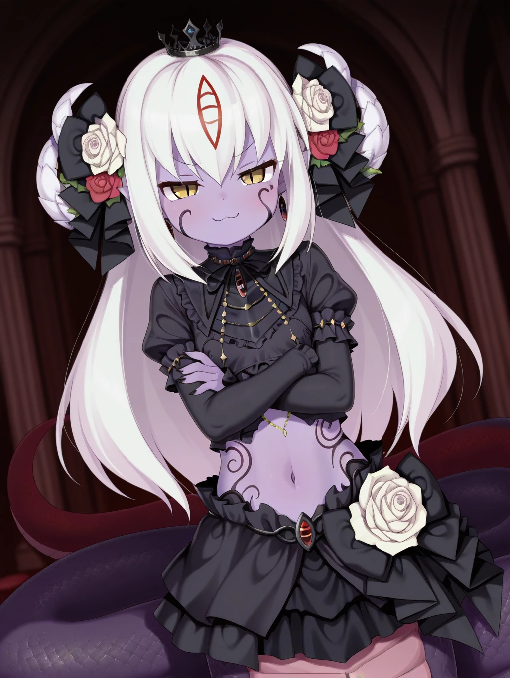 Alice_I, white hair, long hair, lamia, yellow eyes, monster girl, snake girl, purple tattoos, pointy ears, horns, colored skin, purple skin, slit pupils, (scales), face tattoo, jewelry, hair ornament, red flower, white rose, earrings, crown, midriff, (black shirt), skirt,