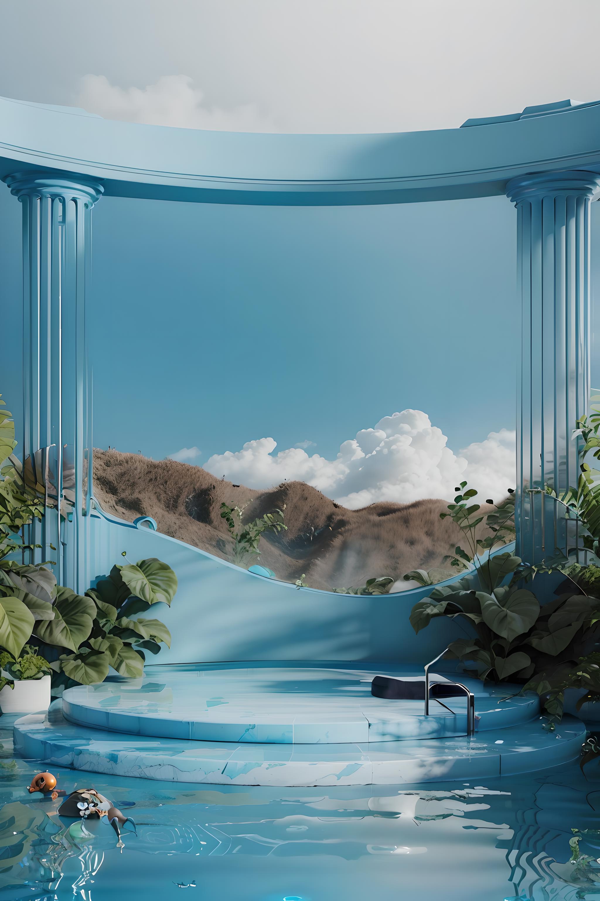 Common prompt words:CGgameC4D bsw, pokemon \(creature\), outdoors, no humans, day, sky, water, grass, sun, blue theme, blue sky, C4D,flower, still life, green theme,blurry, indoors, plant, vase, bathroom, border, cloud, balloon, reflection,