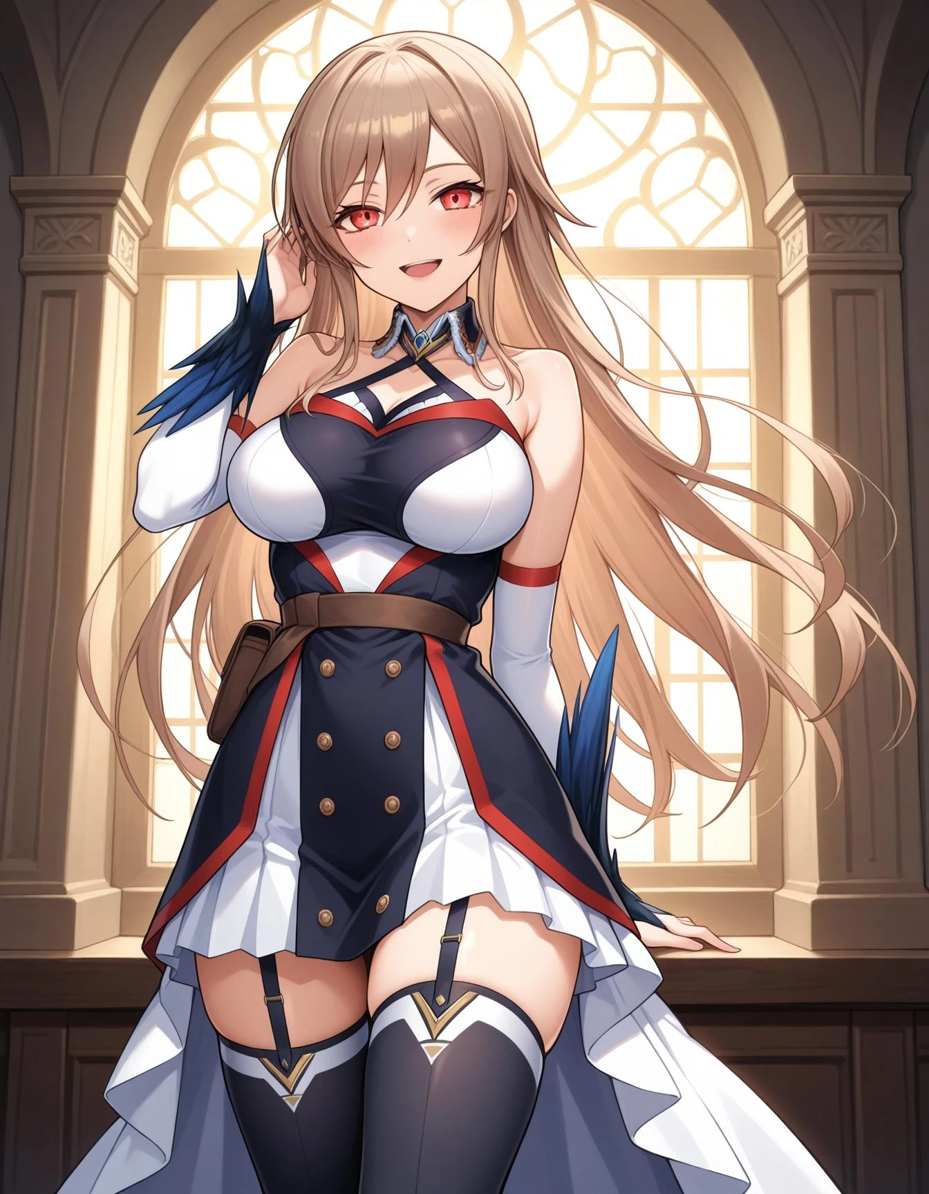 nijifuren,two-tone dress,multicolored dress,criss-cross halter,detached collar,jewely trimmed collar,detached sleeves,white sleeves,bare shoulders,collarbone,white skirt,black thighhigh,garter strap,bridal gauntlet,