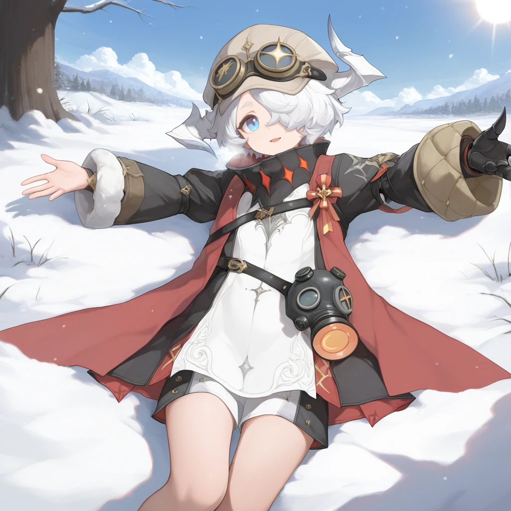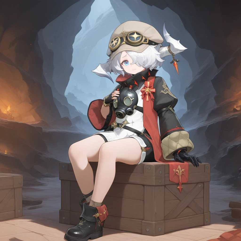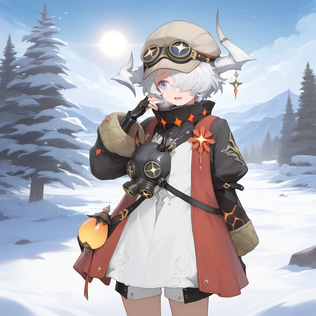 YaleOlivDNA, 1boy, male focus, solo, white hair, short hair, hair over one eye, blue eyes, red stole, white shirt, long shirt, black collar, black sleeves, uneven sleeves, puffy sleeves, lantern, single wide sleeve, black gauntlets, single gauntlet, single fingerless glove, asymmetrical gloves, unworn mask, gas mask, multiple belts, black belt, high collar, cap, light brown headwear, goggles on headwear, asymmetrical horns, white horns, white shorts, two-tone shorts, black shorts,The results of your generations are dependent on the additional LoRAs, weights, and models you use, so it may not work or come out as consistent as my sample images.