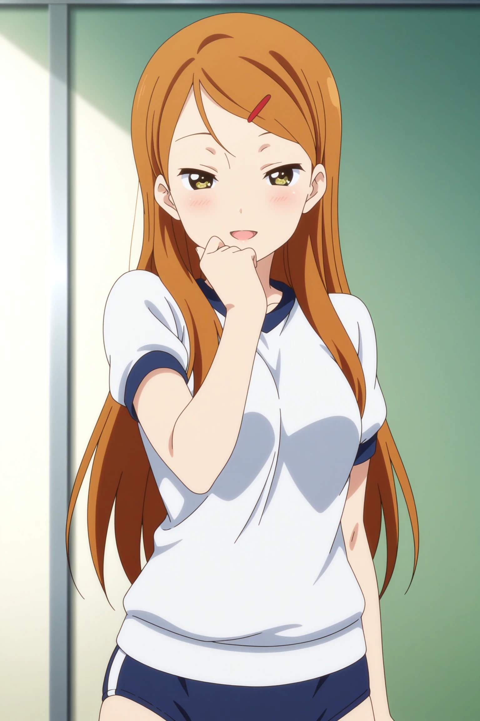 sokabe megumi, long hair, orange hair, red hairclip, yellow eyes, school uniform, black jacket, white shirt, collared shirt, green ribbon, grey skirt, pleated skirt, white kneehighs, loafers