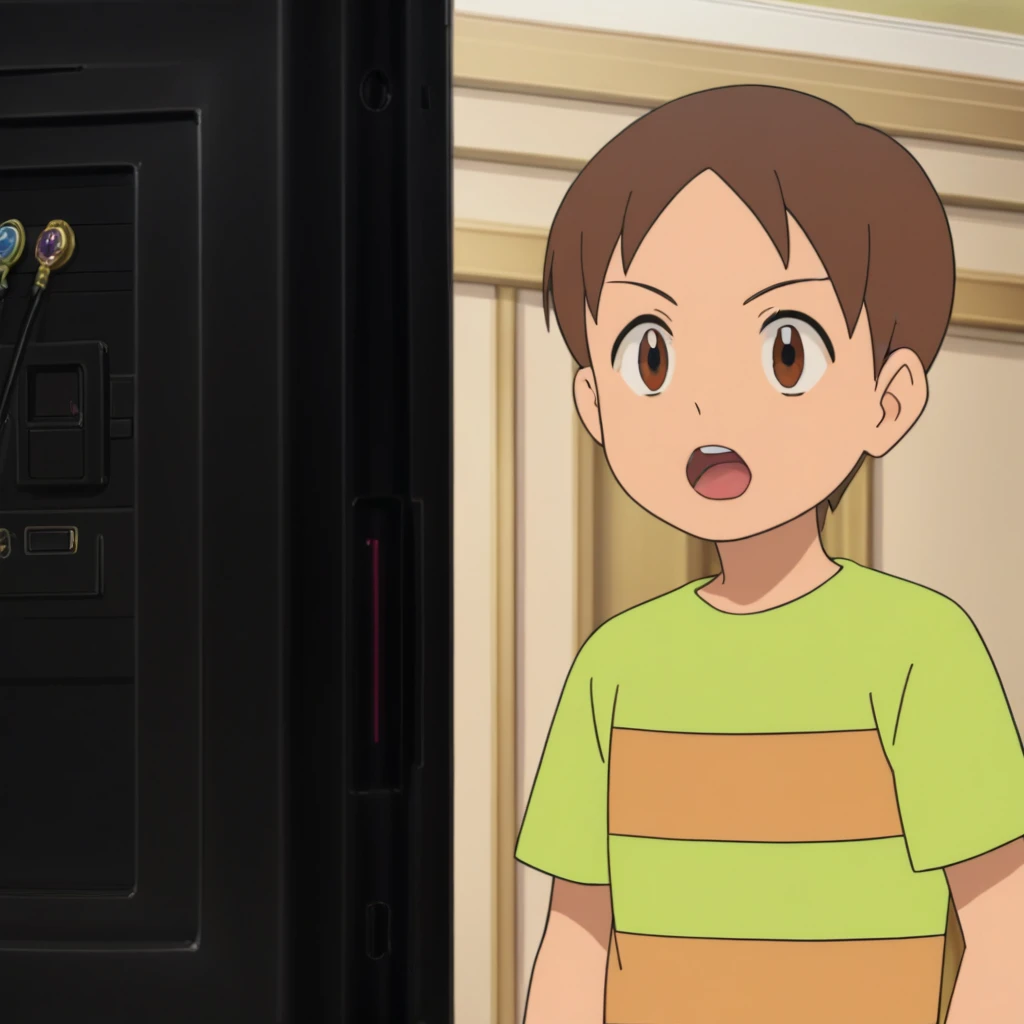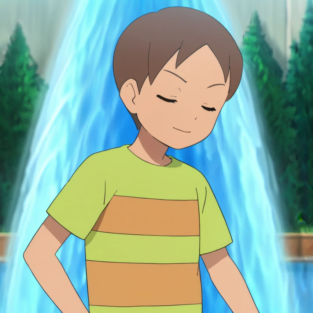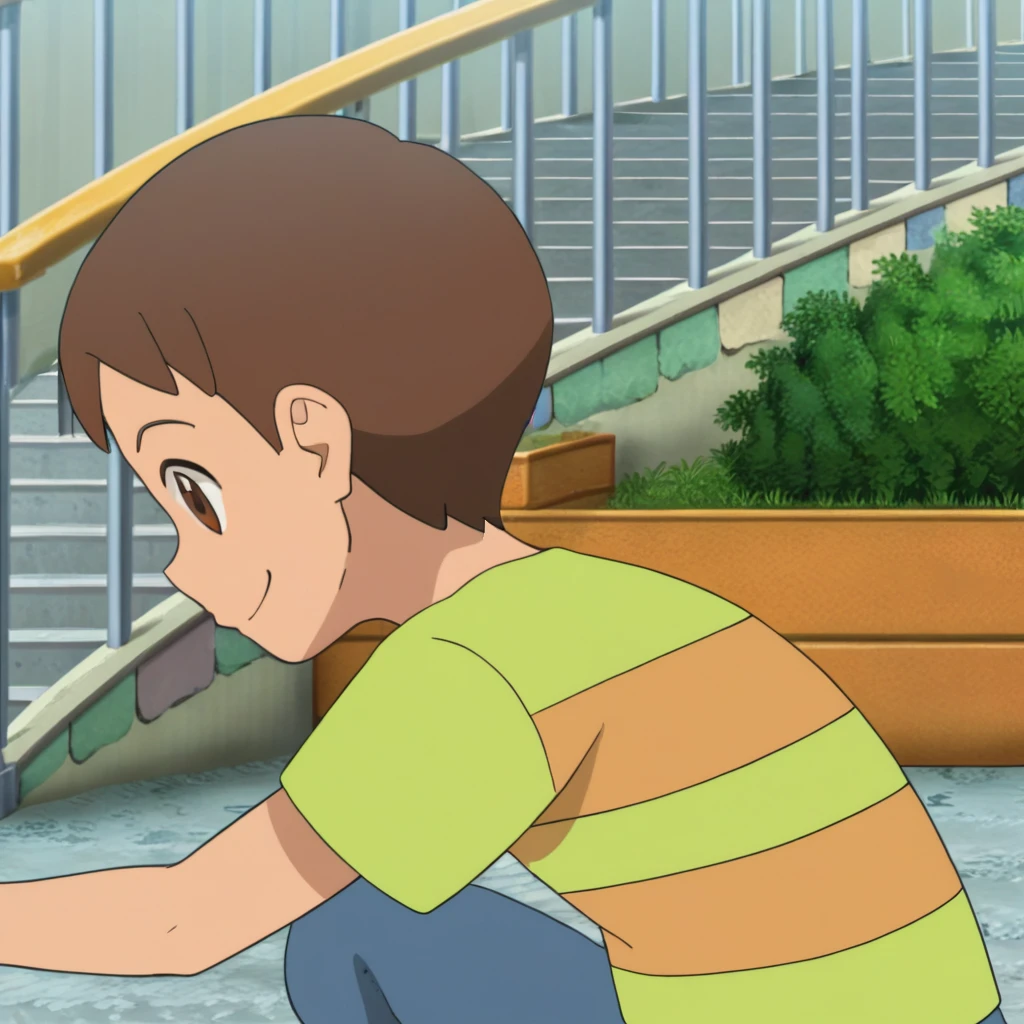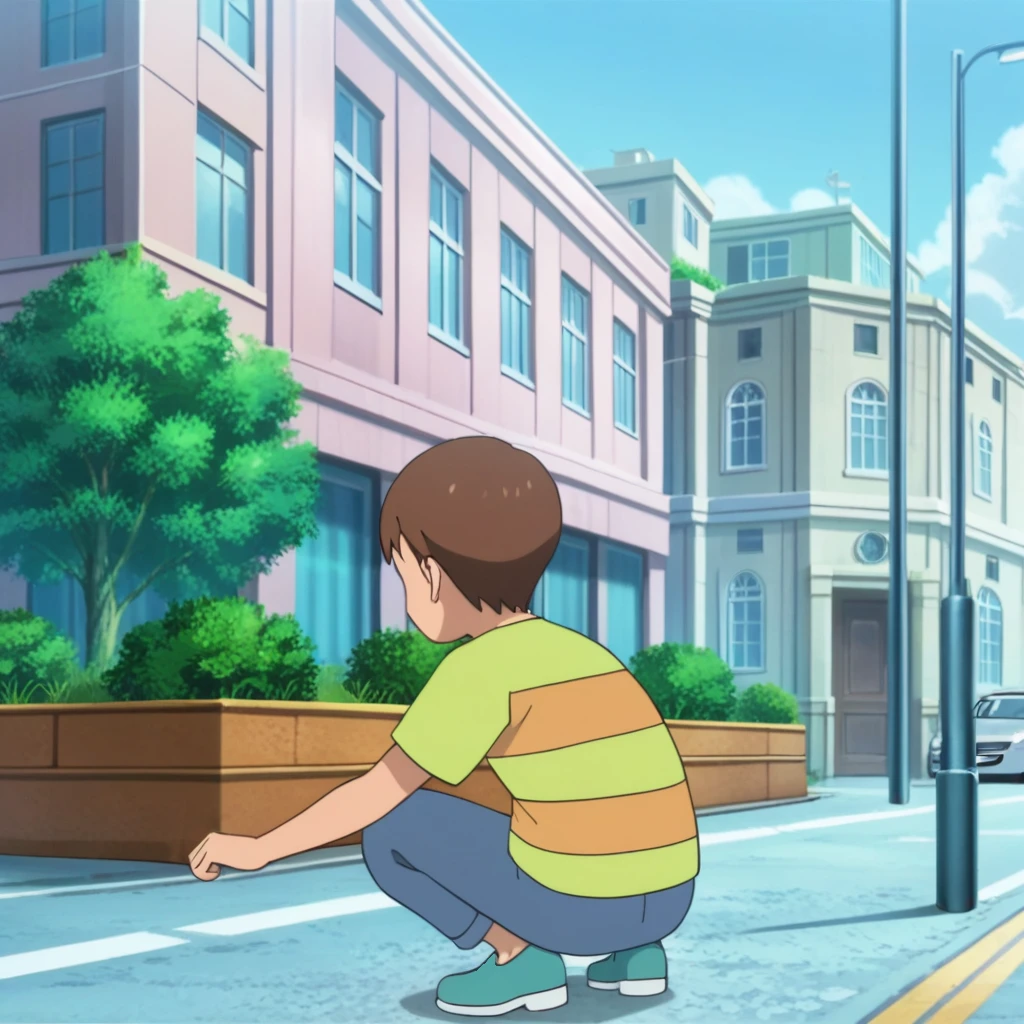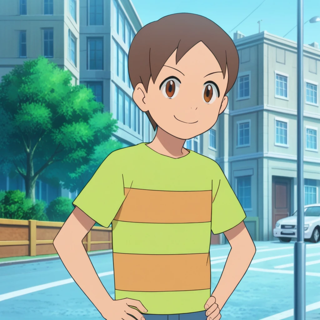 Prompts: male, brown hair, brown eyes, striped shirt, short sleeves, pants, green socks, teal footwear, indoors (house/painting (object)/television), outdoors (park/tree/bush/path/fountain/stairs), outdoors (city/sky/cloud/building/road/lamppost/greenery/car)