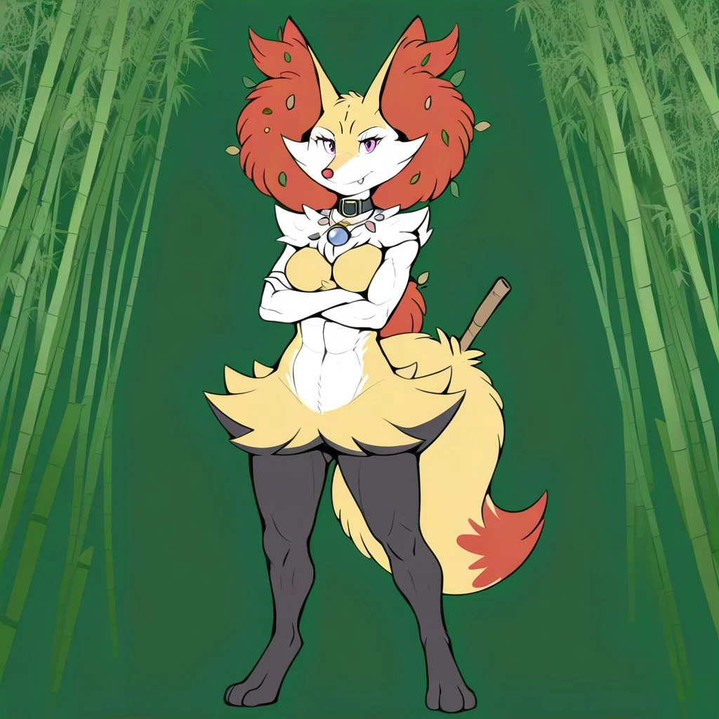fennec fox, fox girl, pokemon (creature), braixen, yellow and white fur, scruffy fur, purple eyes, fox ears, red ear fluff, red nose, low ponytail, fox tail, black legs, digigrade, , covered in leaves, black collar, necklace,