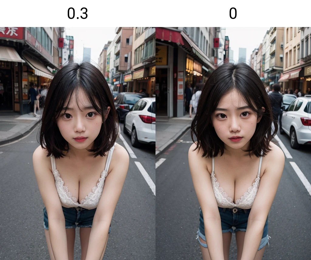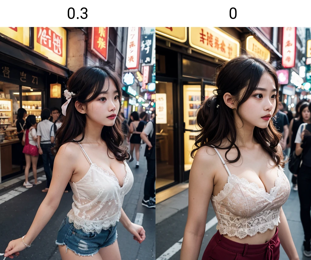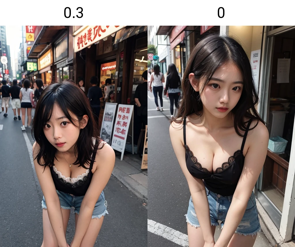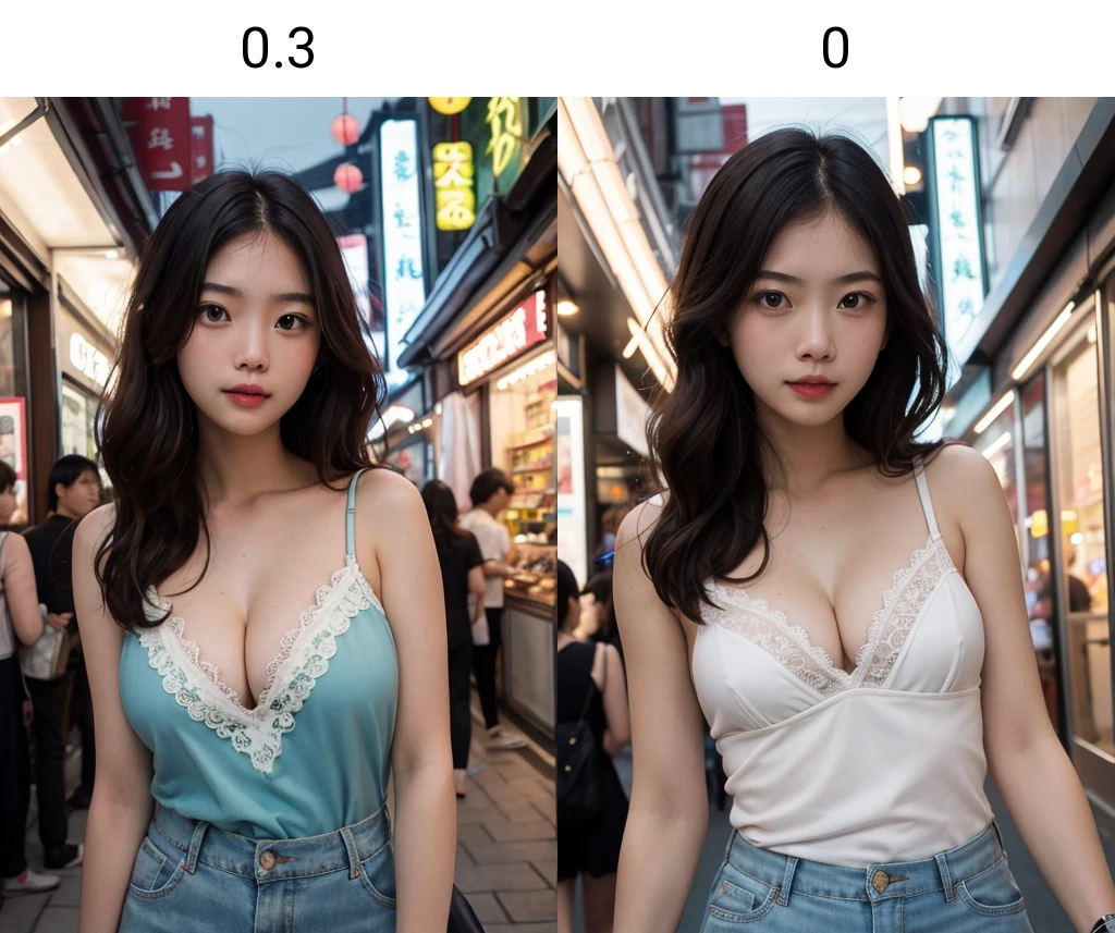 The ratio of middle part hairline and bare forehead is slightly reduced, increase "cute" and "girlishness", although the original prompting can be improved. The flaw is that the color saturation is too low, and the color tones are similar to polaroid, more retro.