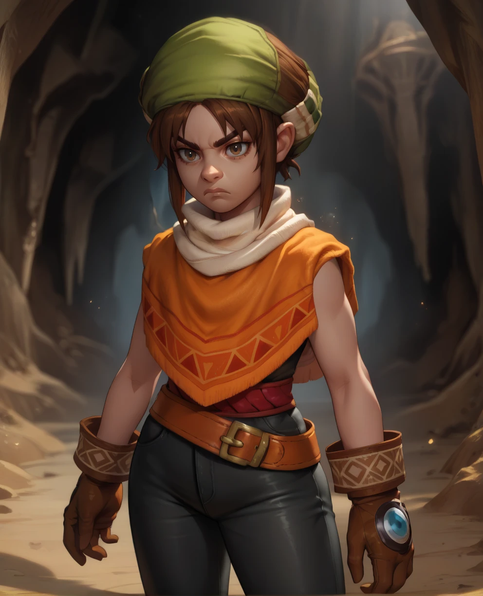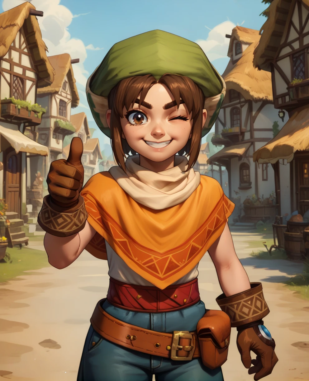 orange poncho,green hat,belt,brown gloves,black pants,white neck wrap,red waistband, brown boots,