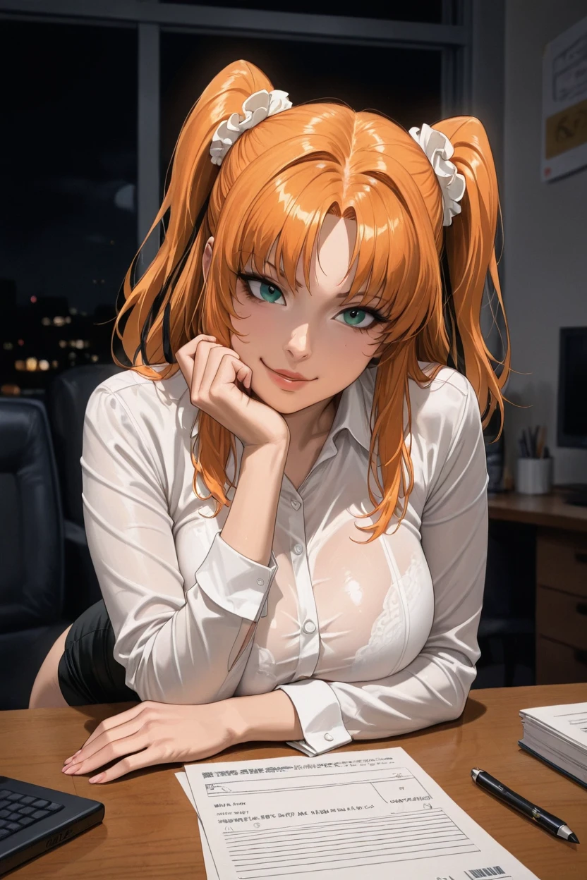 zzLili, orange hair, blue eyes, green eyes, long hair, orange hair, two side up, twintails, dark skin, parted bangs, bare shoulders, detached sleeve, covered navel, highleg leotard, white leotard, <lora:FutabaLiliRamsesIXL:1.0>,