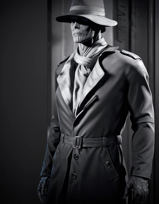 silvershroud, black hat, gray scarf, long black coat, black gloves, black pants, black shoes,