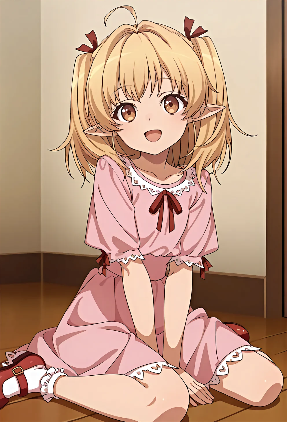 healerlily-default,brown eyes,blonde hair,ahoge,twintails,pointy ears, pink dress,short sleeves, red ribbon,bobby socks,red mary janes