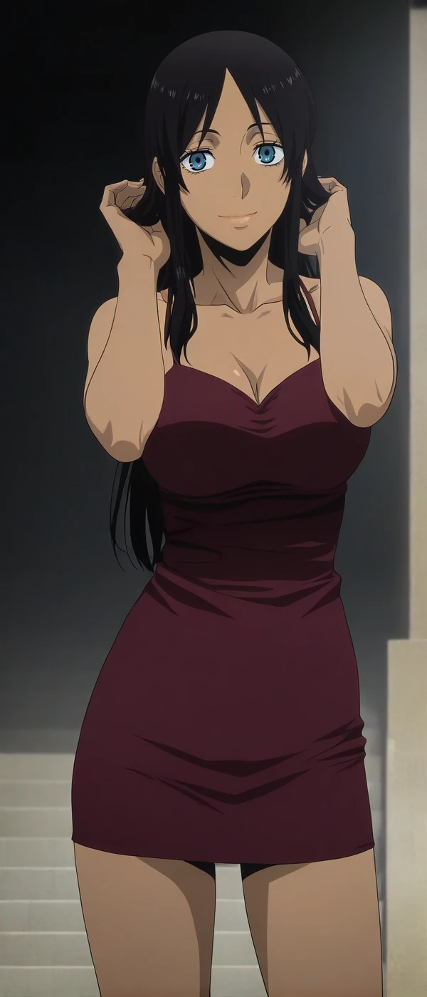 dark skin female, long hair, black hair, blue eyes