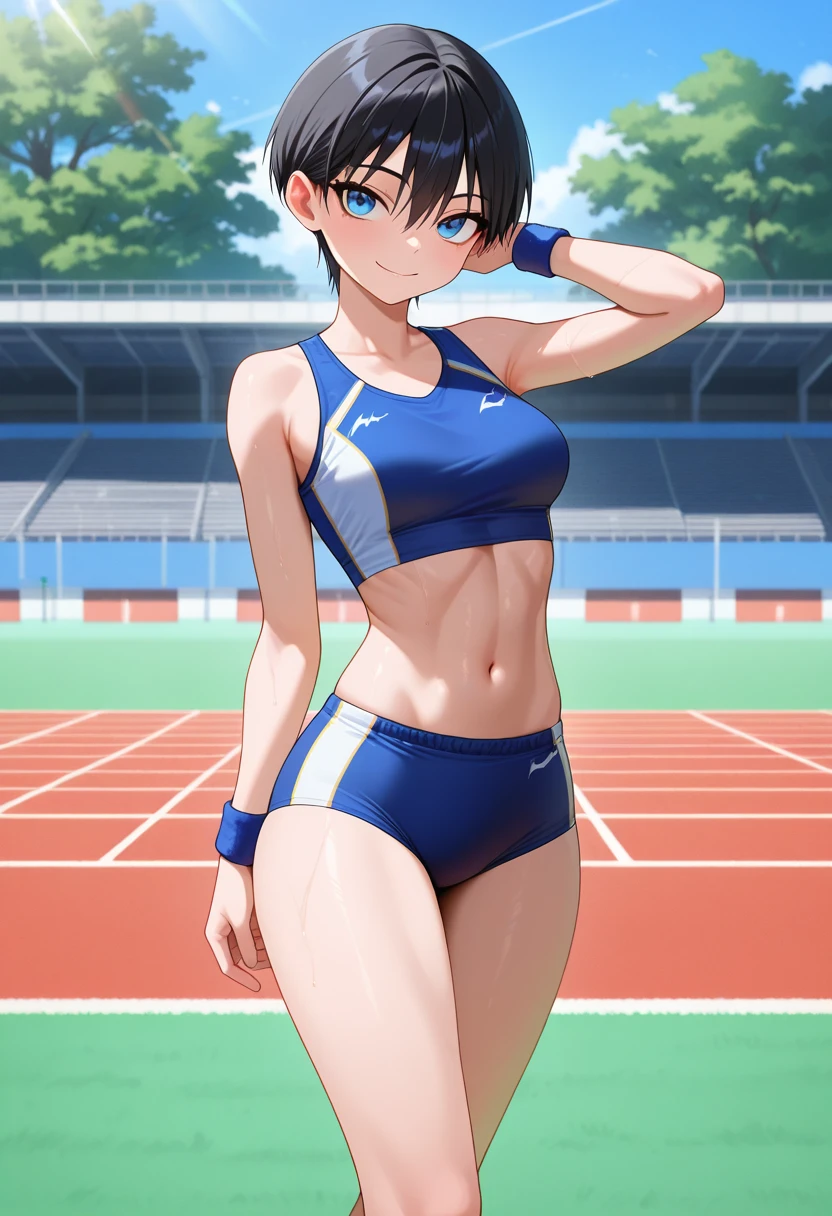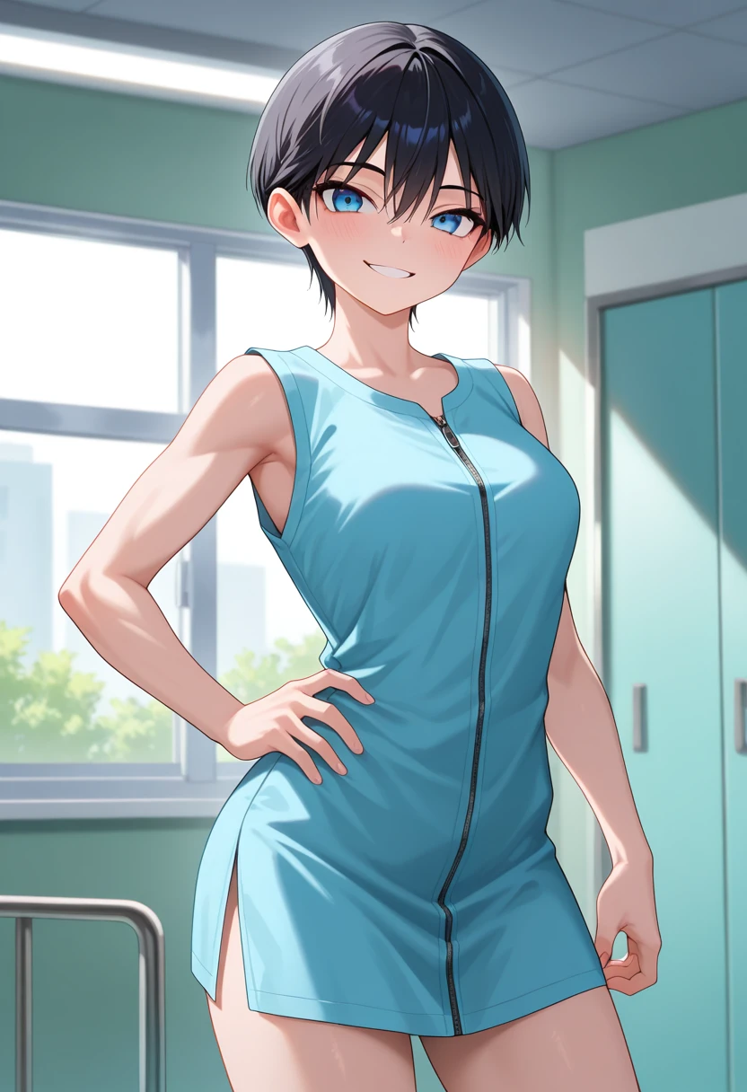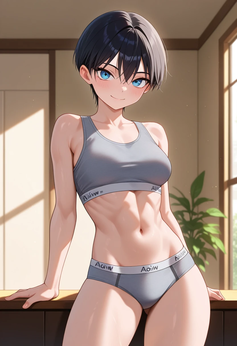 aoiww, tomboy, androgynous, toned, blue eyes, black hair, short hair, hair between eyes, small breasts,