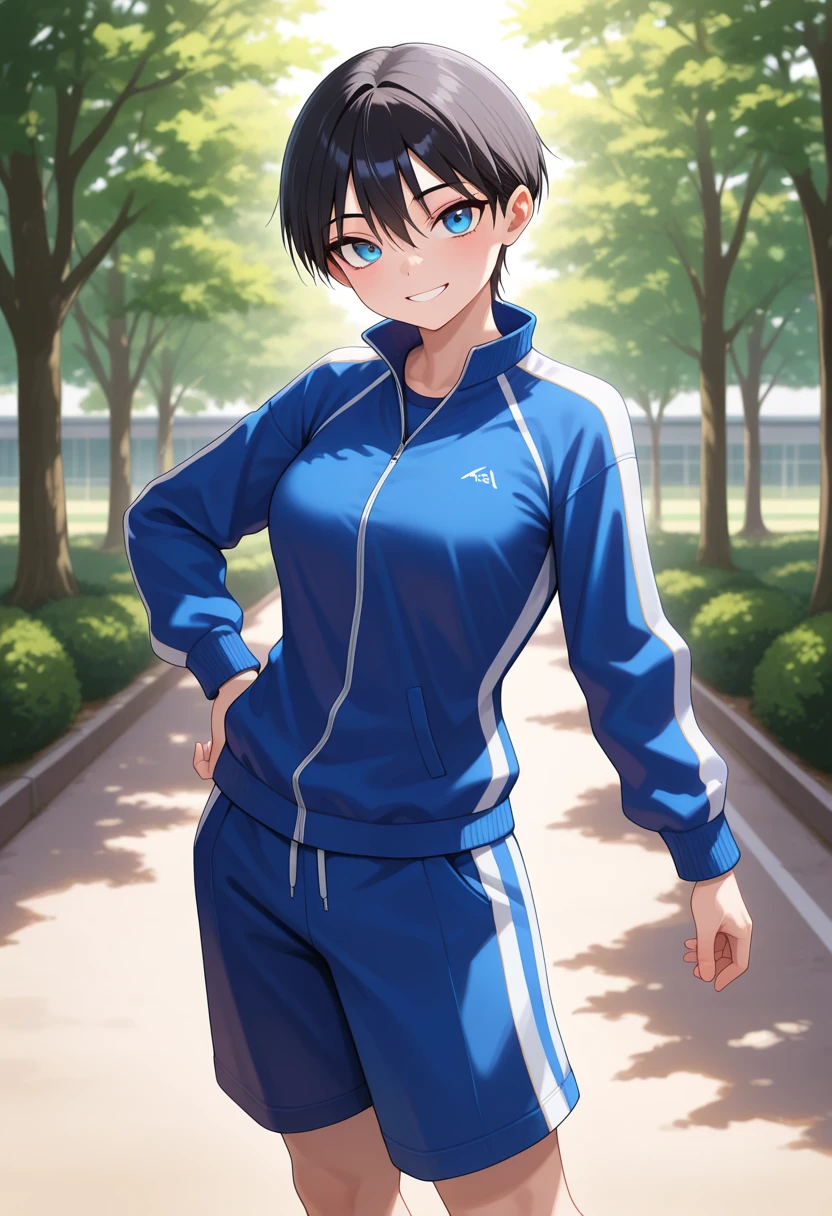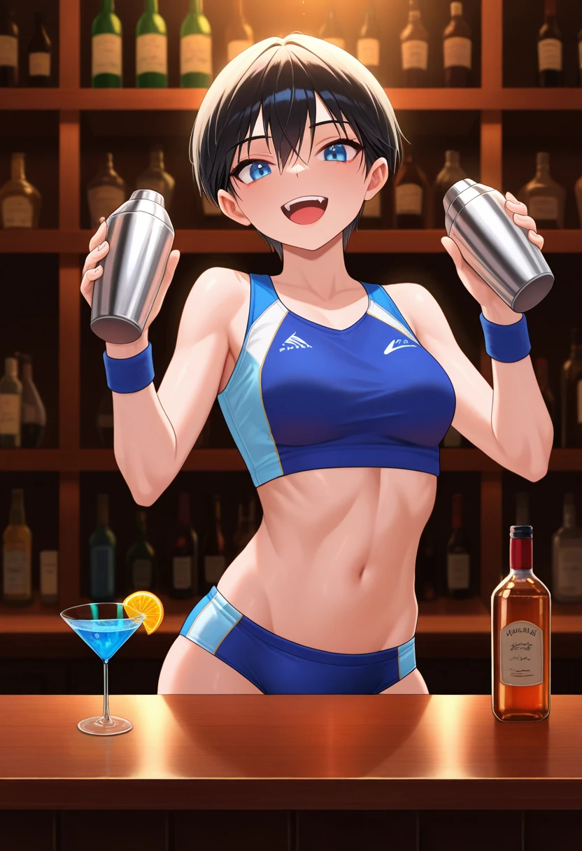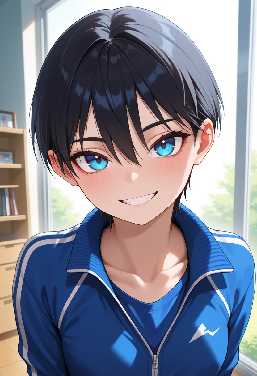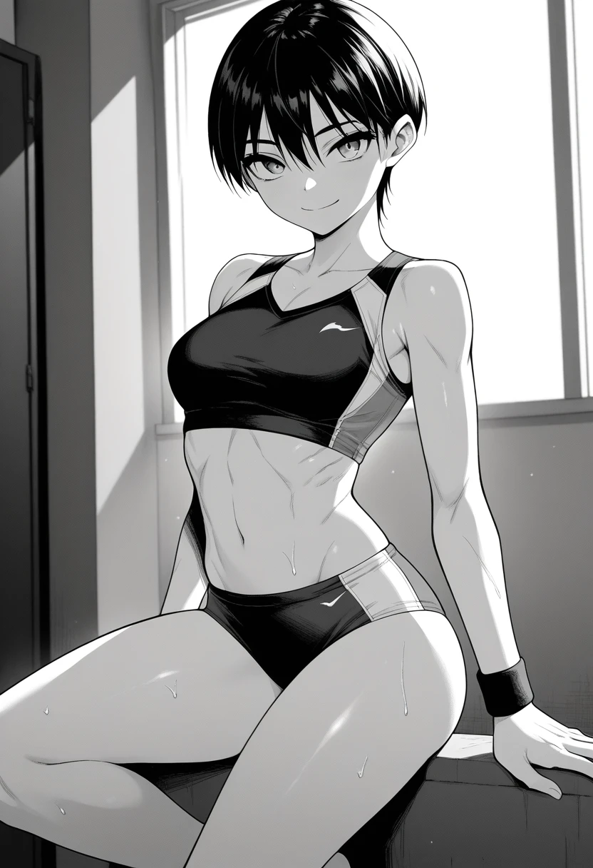 aoiww, tomboy, androgynous, toned, blue eyes, black hair, short hair, hair between eyes, small breasts,